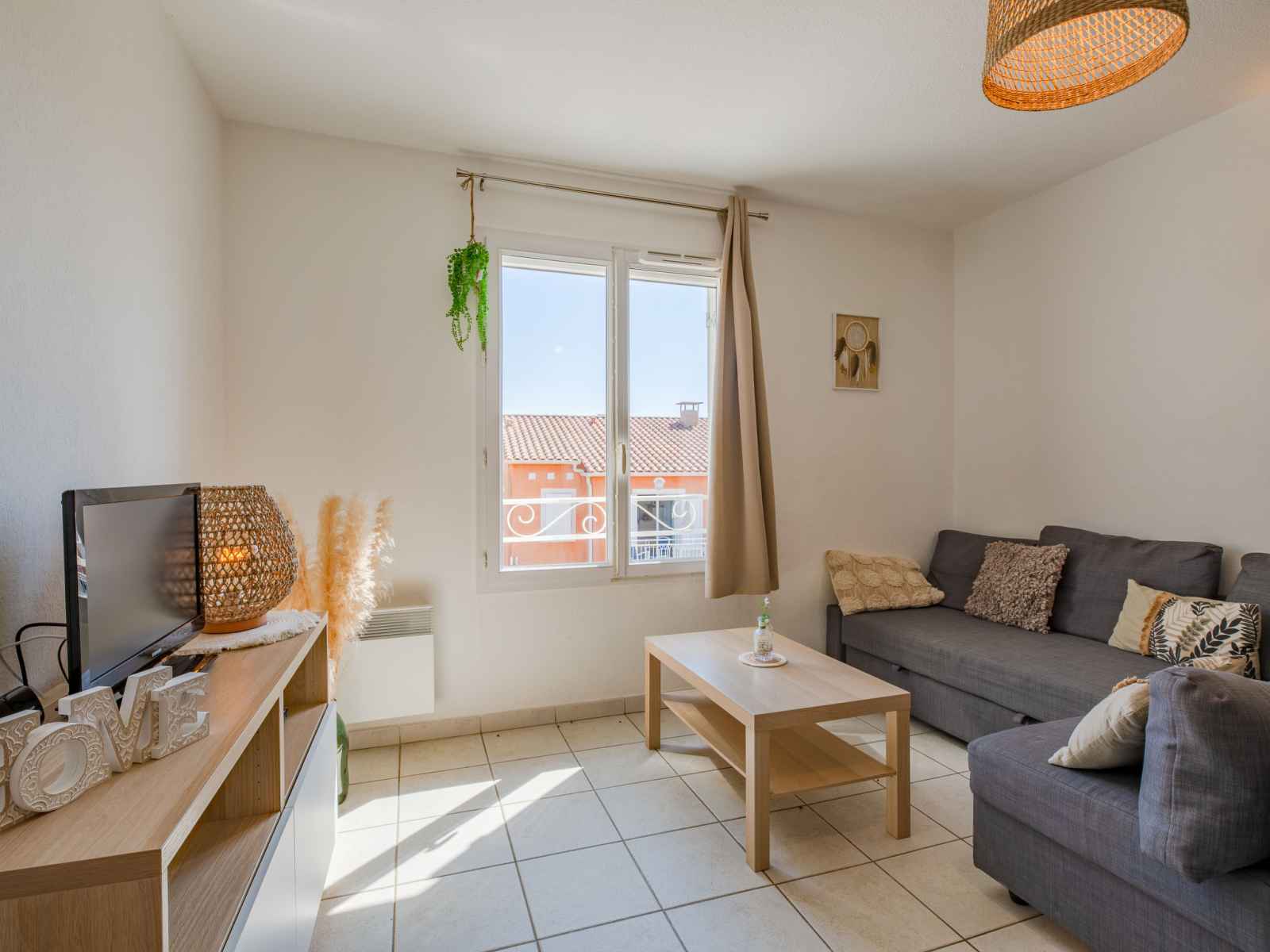 ventilateur. Sortie sur le balcon. 1 chambre avec 1 x 2 lits superposés (90 cm, longueur 200 cm), ventilateur. Cuisine ouverte (four, lave-vaisselle, 4 plaques vitrocéramiques, grille-pain, bouilloire électrique, micro-ondes, congélateur, cafetière électrique, Capsules pour machine à café (Dolce Gusto)). Douche, WC séparé. Chauffage électrique. Petit balcon 4 m2, terrasse 5 m2, jardinet 45 m2. Meubles de terrasse, mobilier de balcon. A disposition: fer à repasser, sèche-cheveux. Internet (Connexion WIFI, en sus). Place de parking. Veuillez noter: adapté(e) aux familles. TV seulement FR. Détecteur de fumée. Annonce d'un particulier (art 155, IV du CGI). FJS1855HT@