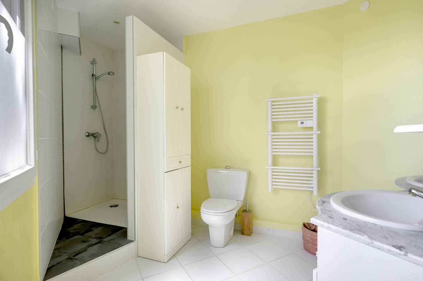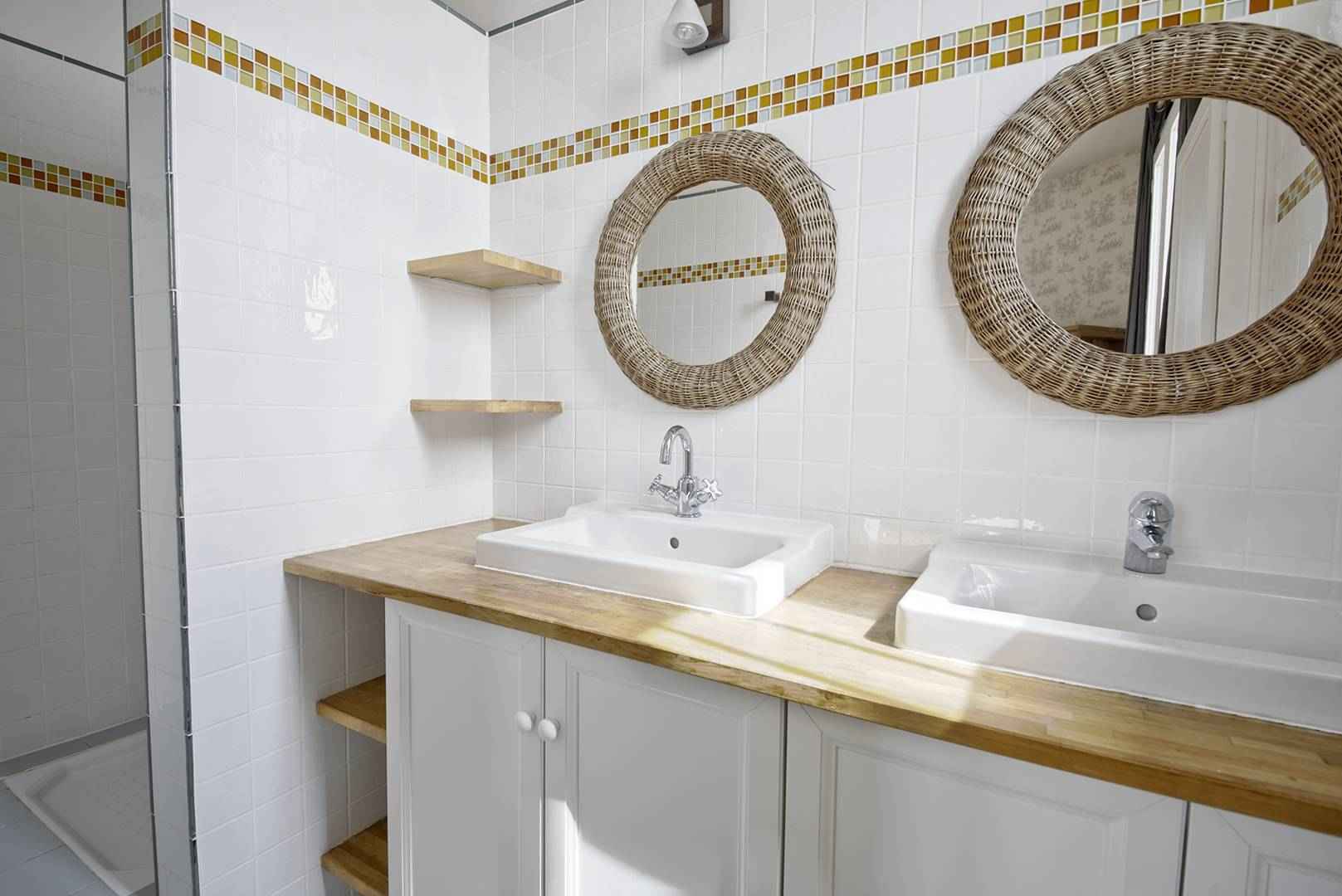 La villa principale comprend au RDC un couloir menant à une cuisine séparée entièrement équipée (réfrigérateur, four, micro-ondes, plaques vitrocéramiques, lave-vaisselle, Nespresso) avec coin repas et accès au jardin. Vous y trouverez également des toilettes séparées, un séjour / salle à manger avec équipements TV, canapés, fauteuils, et méridienne, ainsi qu'une terrasse en bois exposée plein sud (250 m²). À l'étage, la villa dispose d'une chambre avec deux lits (90 x 200) et sa salle d’eau attenante, d'une chambre avec un lit (180 x 200) et salle d’eau attenante, et d'une autre chambre avec deux lits (90 x 200 et 80 x 190). On y trouve également une salle de bain avec toilettes. La cave est équipée d'un sèche-linge et d'un lave-linge ainsi que d'un espace de stockage (vélos, articles de plage...)