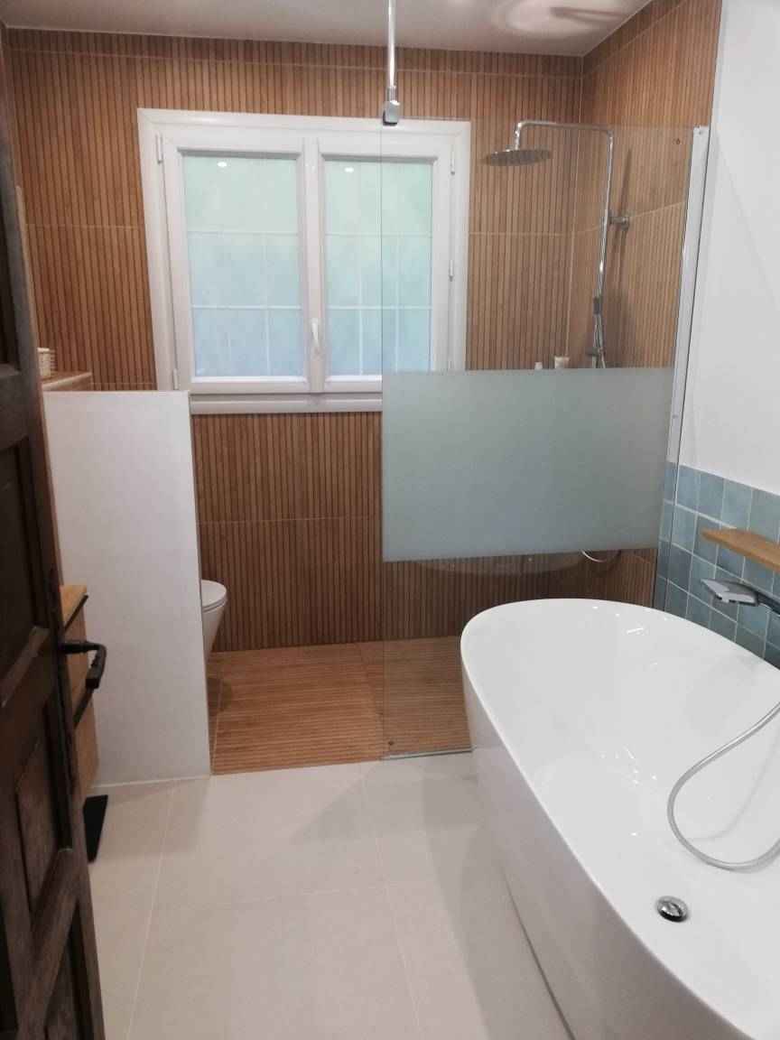 SALLE DE BAIN avec douche, baignoire îlot, double vasque et WC