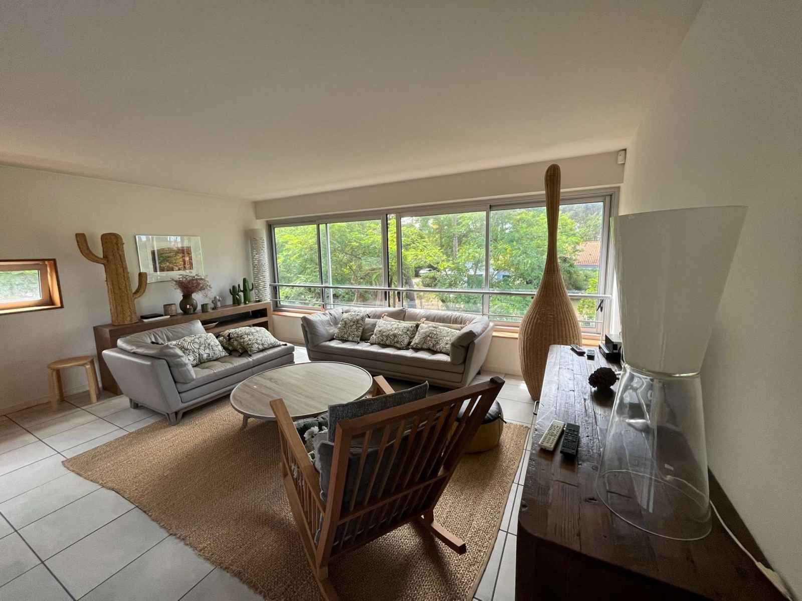 Le séjour s'ouvre sur une terrasse de 45m² aménagée avec table, chaises, transats et un salon, et pour votre confort un store vous protégera du soleil pendant vos repas.