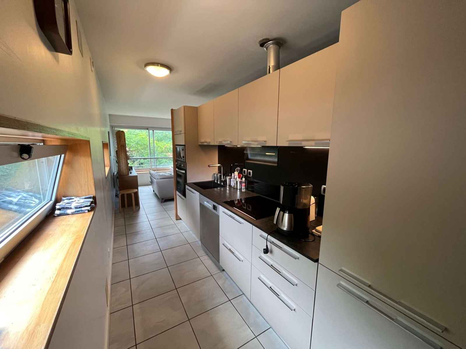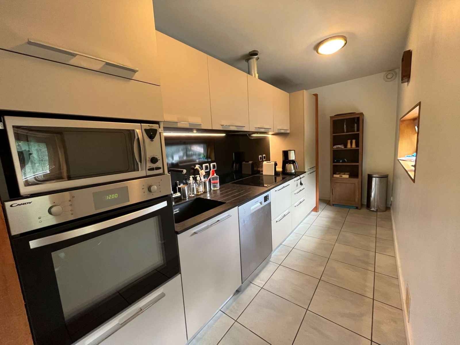 CUISINE OUVERTE : réfrigérateur avec bloc congélateur, lave-vaisselle, four, micro-onde, 1 plaque de cuisson vitro céramique 3 foyers , rangement
