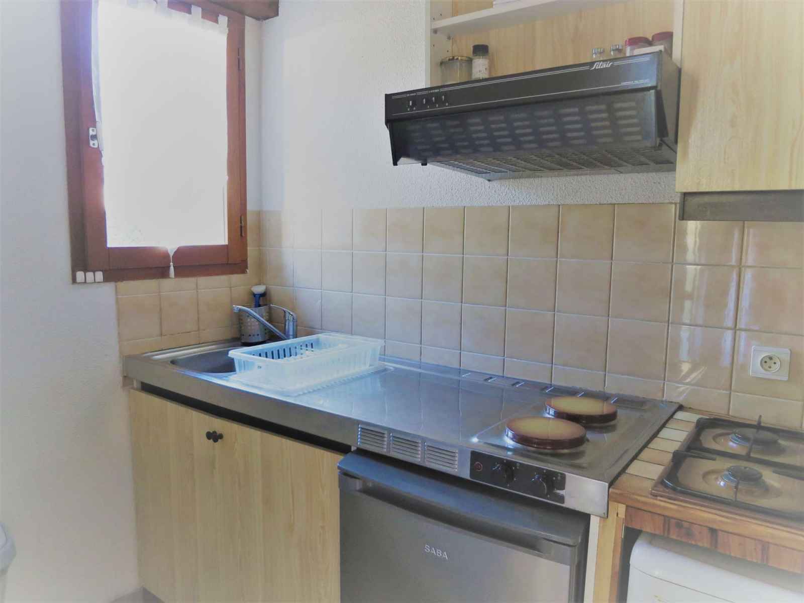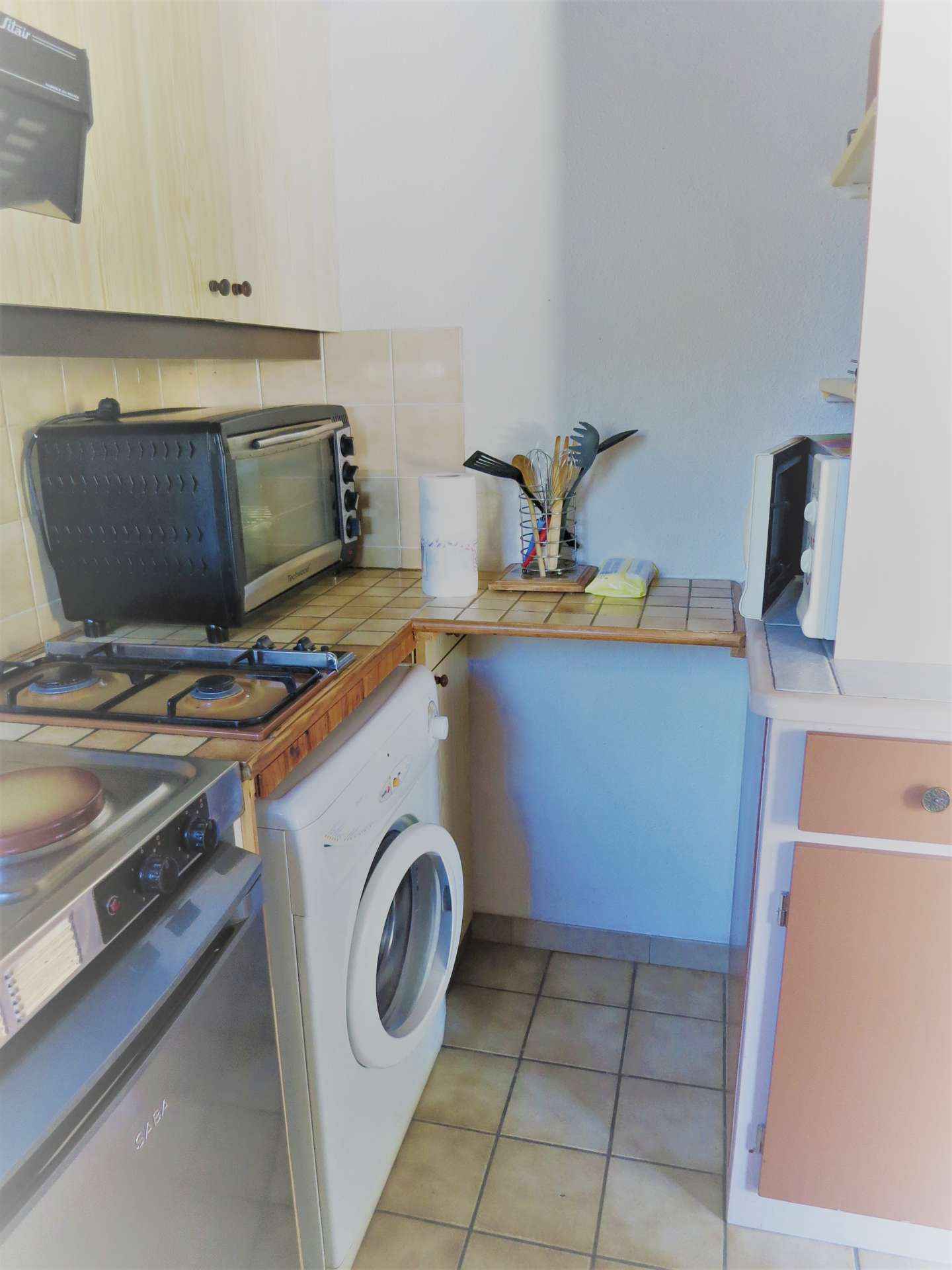 cuisson (2 feux gaz et 2 plaques électriques), micro-onde, mini-four, lave-linge, rangement