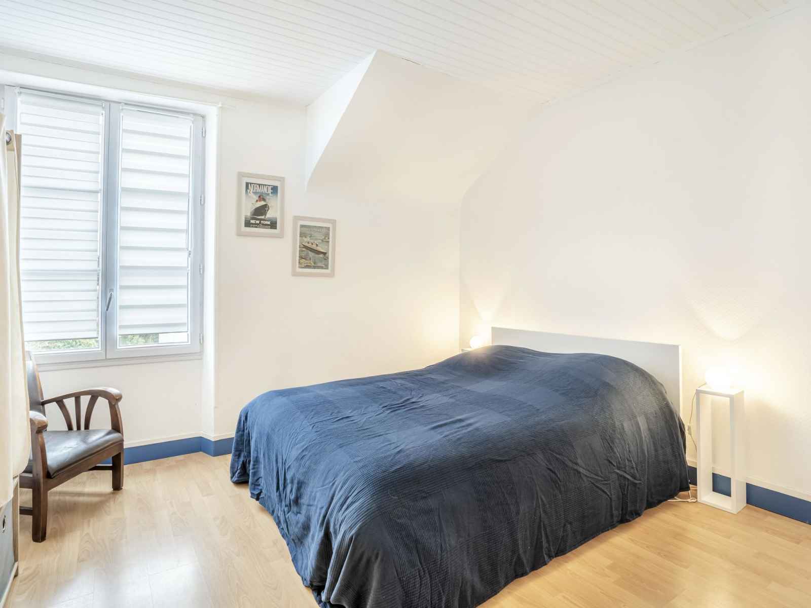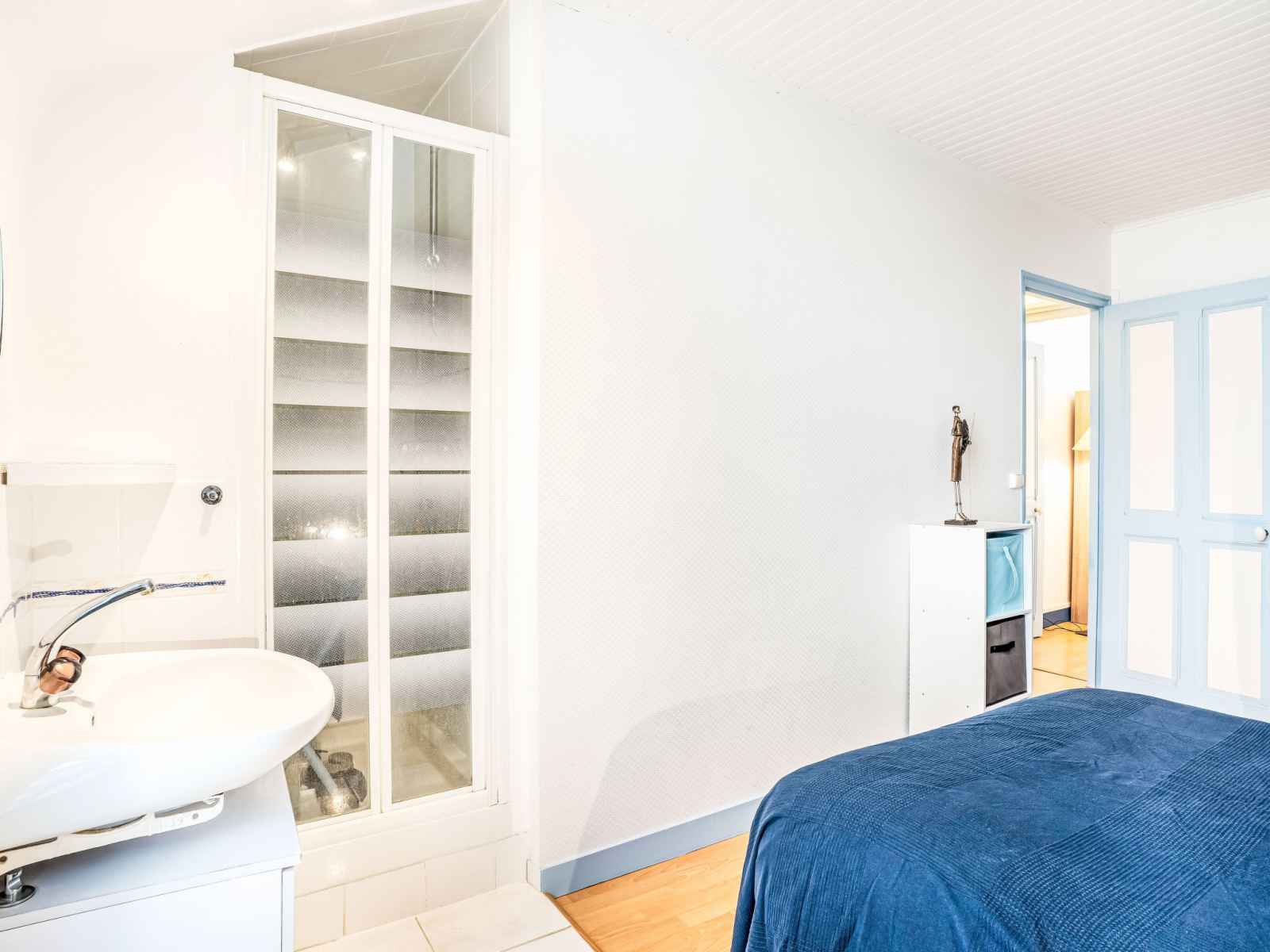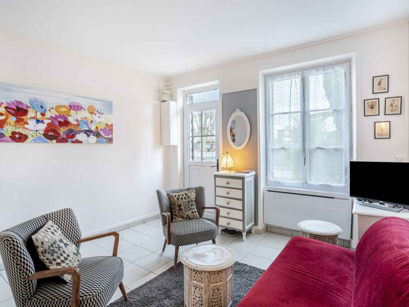 Maison mitoyenne 3 pièces 60 m2 sur 2 niveaux. séjour/salle à manger avec tv (écran plat). cuisine (lave-vaisselle, 3 plaques à induction, grille-pain, bouilloire électrique, micro-ondes, congélateur, cafetière électrique). sortie sur le jardin, sur la terrasse. douche/wc. chauffage électrique. À l'étage supérieur: (escalier raide) 1