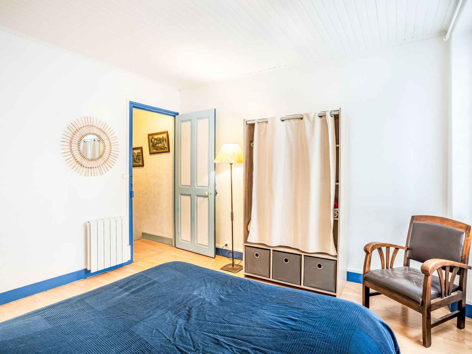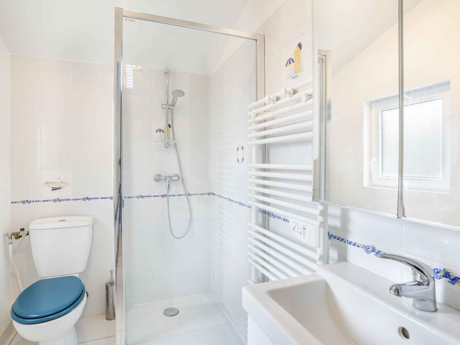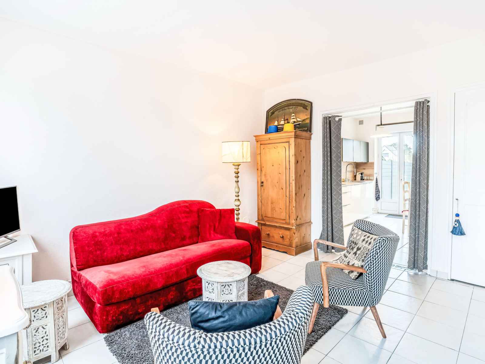 Maison mitoyenne 3 pièces 60 m2 sur 2 niveaux. séjour/salle à manger avec tv (écran plat). cuisine (lave-vaisselle, 3 plaques à induction, grille-pain, bouilloire électrique, micro-ondes, congélateur, cafetière électrique). sortie sur le jardin, sur la terrasse. douche/wc. chauffage électrique. À l'étage supérieur: (escalier raide) 1