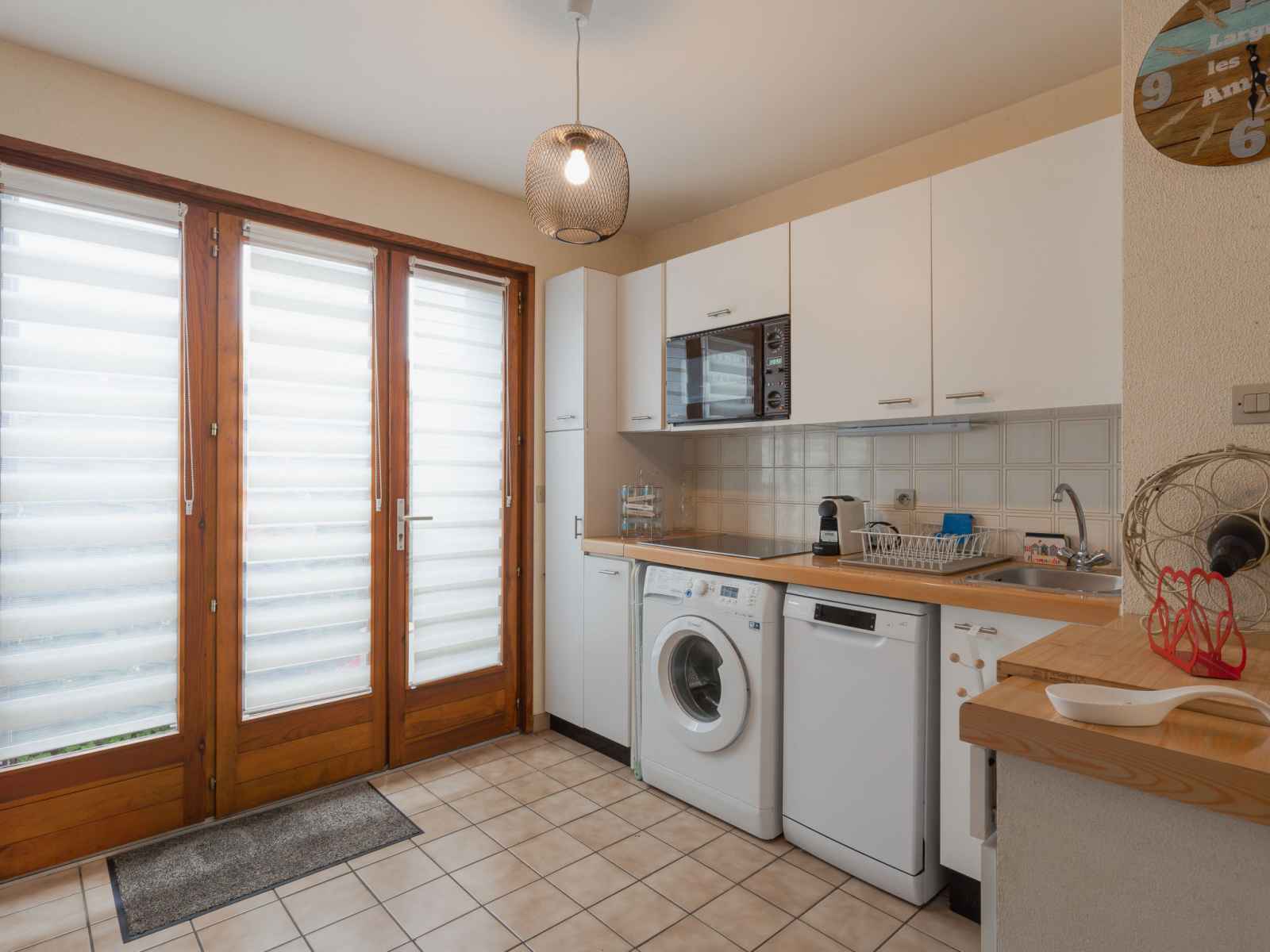Maison mitoyenne 3 pièces 40 m2 sur 2 niveaux, situation sud. séjour/salle à manger avec tv (écran plat). sortie sur le jardin, sur la terrasse. coin cuisine (lave-vaisselle, 4 plaques vitrocéramiques, grille-pain, bouilloire électrique, micro-ondes, congélateur, cafetière électrique). À l'étage supérieur: 1 chambre avec 1 grand-lit