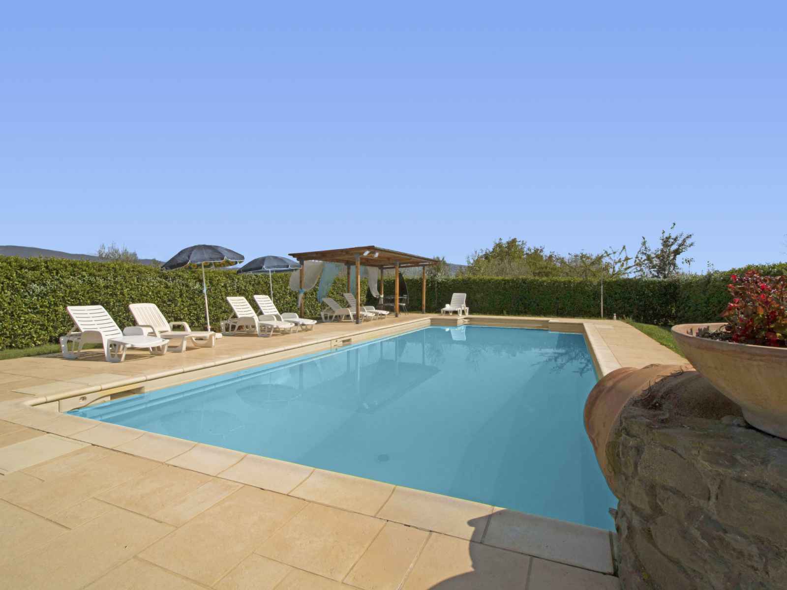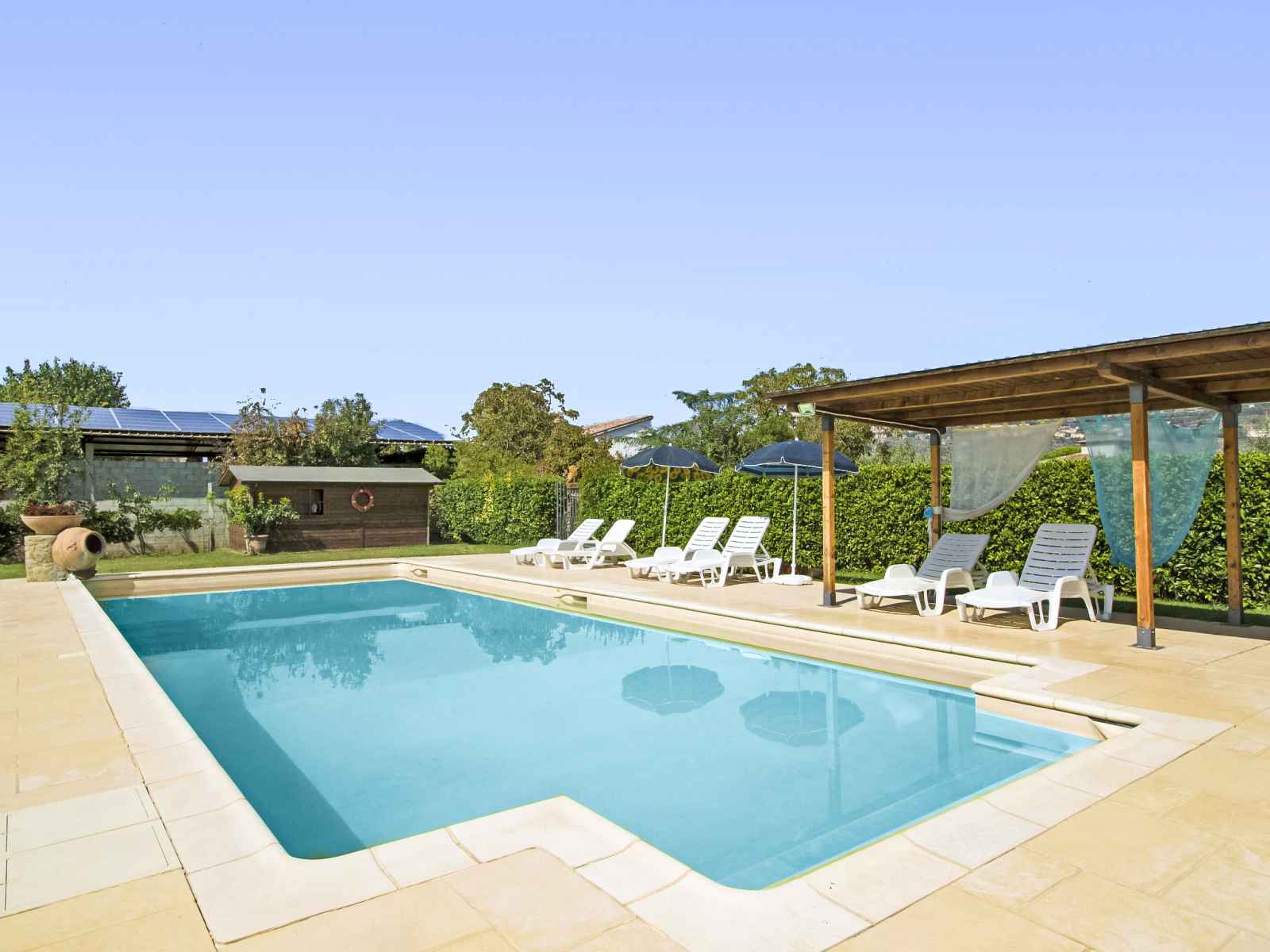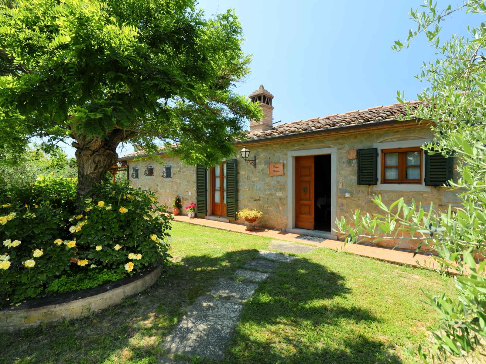 douche/wc dans l'espace piscine, barbecue. a usage privé: jardinet (15 m2), terrasse. cuisinier possible (en sus). place de parking (couvert). supermarché 2.6 km, restaurant 450 m, gare ferroviaire "camucia" 2 km, plage de sable "la merangola" 20 km, baignade en lac "trasimeno" 20 km. attractions à proximité: castiglion fiorentino 11 km, foiano della chiana 18 km, castiglion del lago 19 km, passignano sul trasimeno 22 km, arezzo 32 km, rapolano terme 43 km. veuillez noter: voiture recommandée. résidence avec portail électrique. le propriétaire habite sur le même terrain. autoroute à proximité.