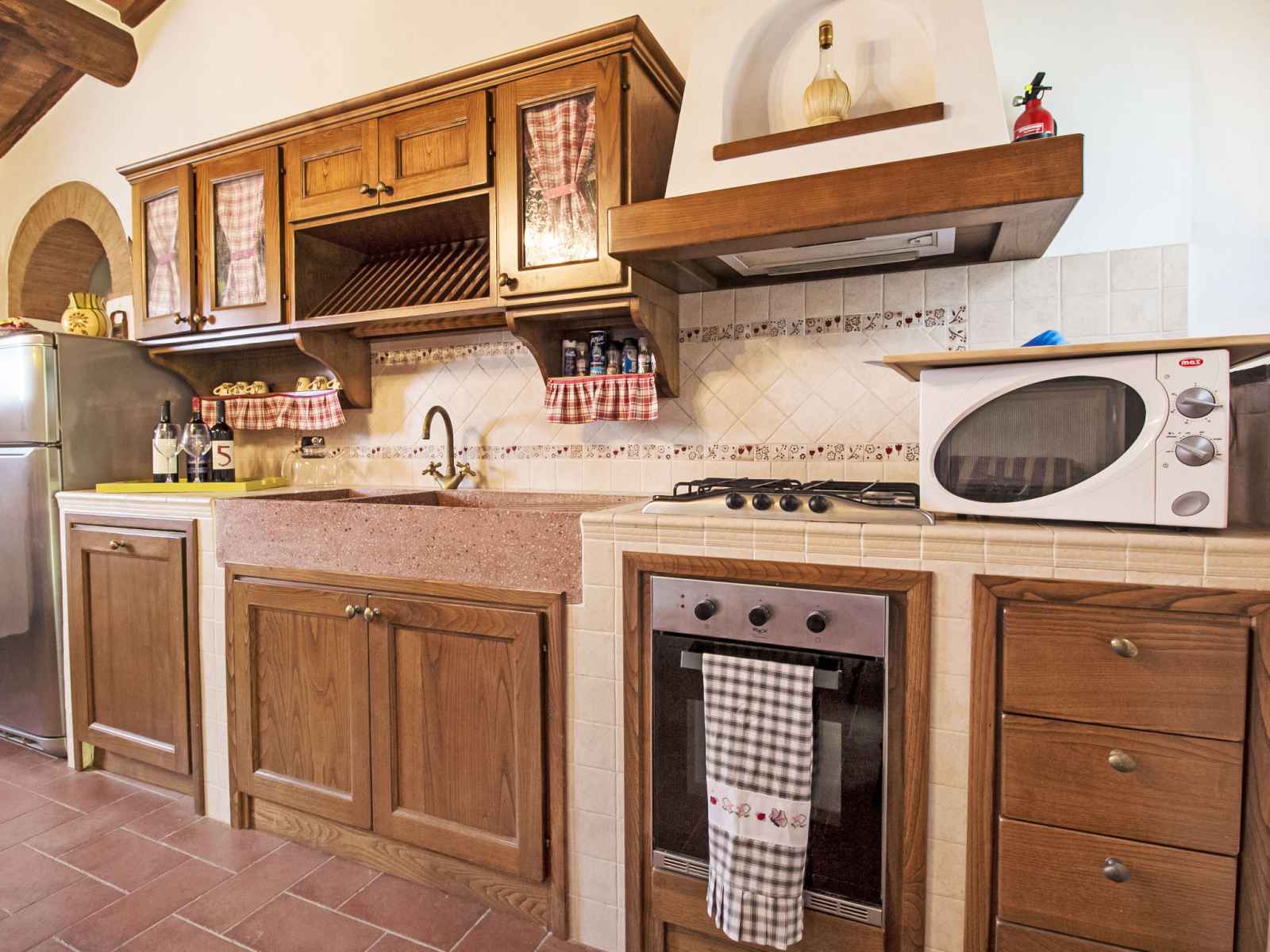 "martina", maison 3 pièces 95 m2. aménagement confortable et rustique: séjour/salle à manger avec cheminée et tv (câblée). sortie sur le jardin, sur la terrasse. 1 chambre double. sortie sur le jardin. 1 chambre double. sortie sur le jardin. 1 chambre avec 2 lits. sortie sur le jardin. coin cuisine (4 plaques de cuisson, four,