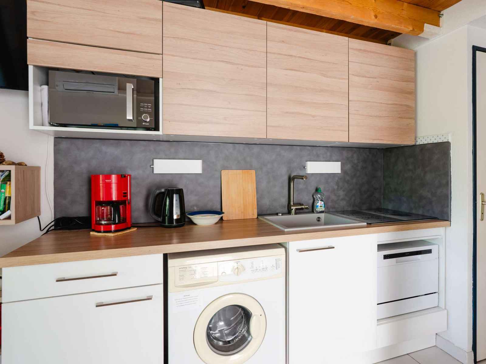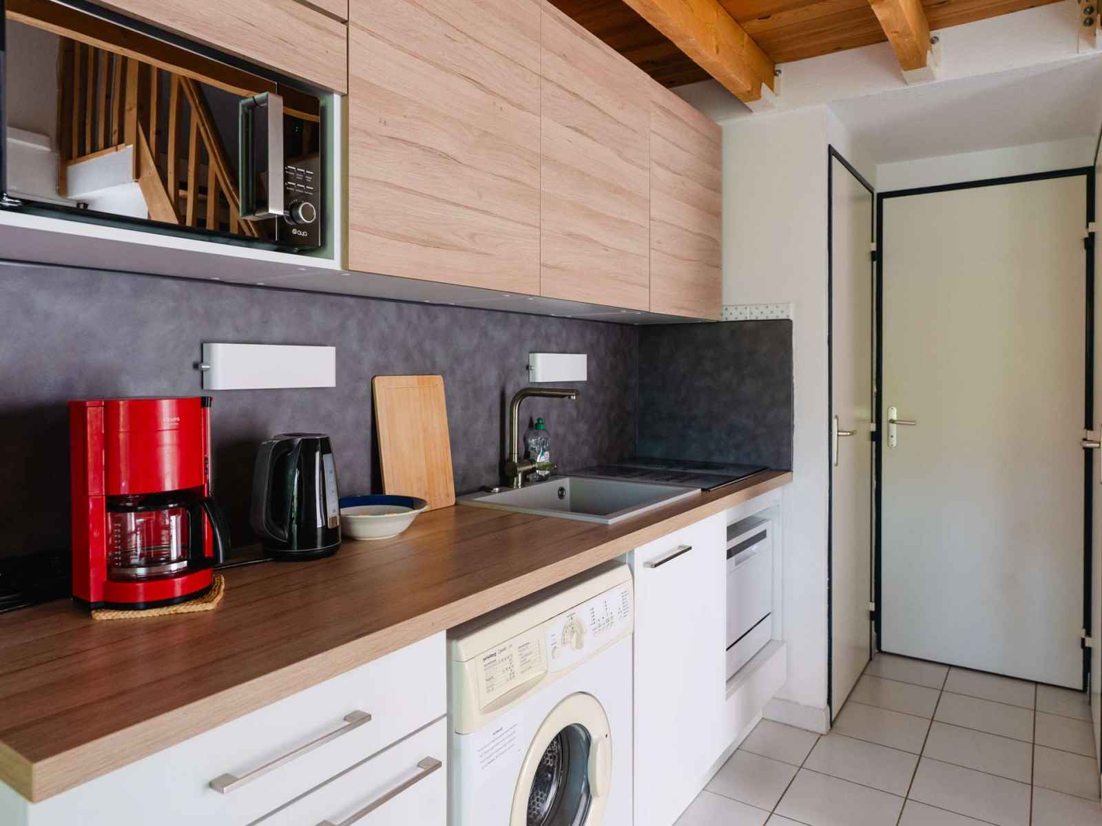 équipée (plaque vitrocéramique 4 feux , micro-ondes, réfrigérateur avec compartiment freezer cafetière classique, bouilloire, lave-linge et lave-vaisselle) ; une salle d’eau avec douche et lavabo, WC séparé, et une chambre avec 1 lit en 140 (140x190).