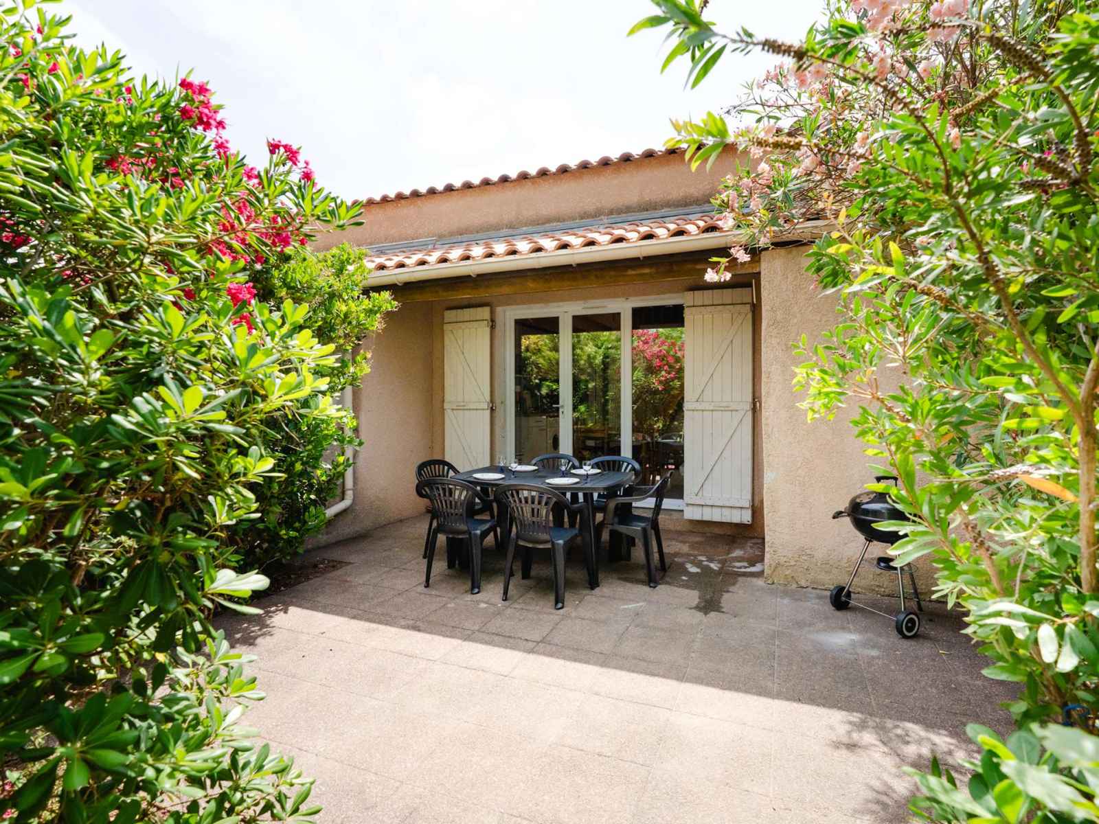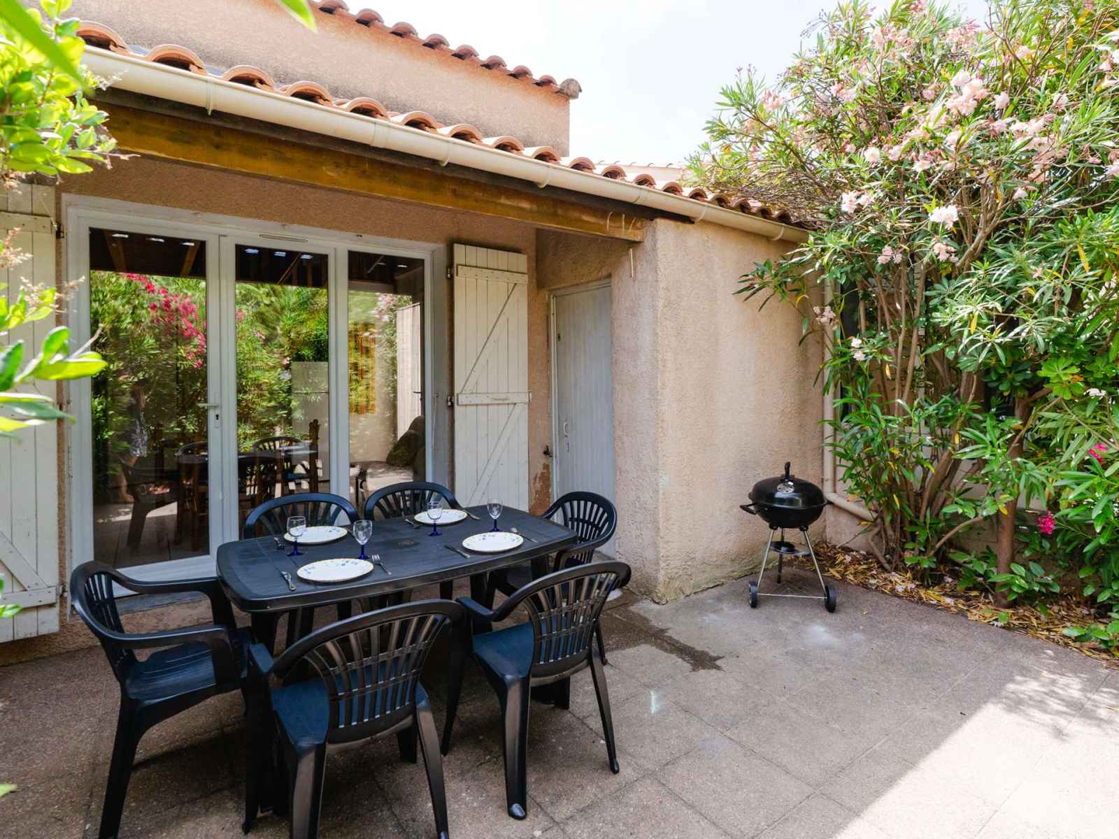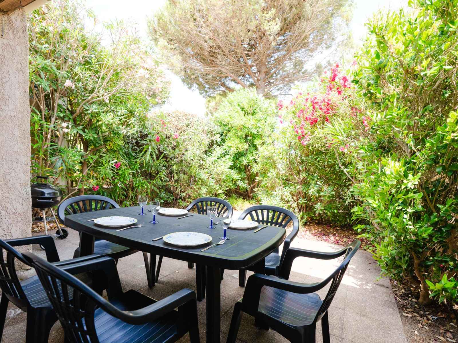 • Equipements : 2 Chaises longues, Aspirateur, Barbecue charbon, Bouilloire, Cafetière, Climatisation salon et chambre, Etendoir, Freezer, Lave linge, Lave Vaisselle, Micro-ondes, Moustiquaires, Parasol, Plaques vitrocéramiques, Réfrigérateur, Salon de jardin (6 personnes), Vaisselle pour 6 personnes