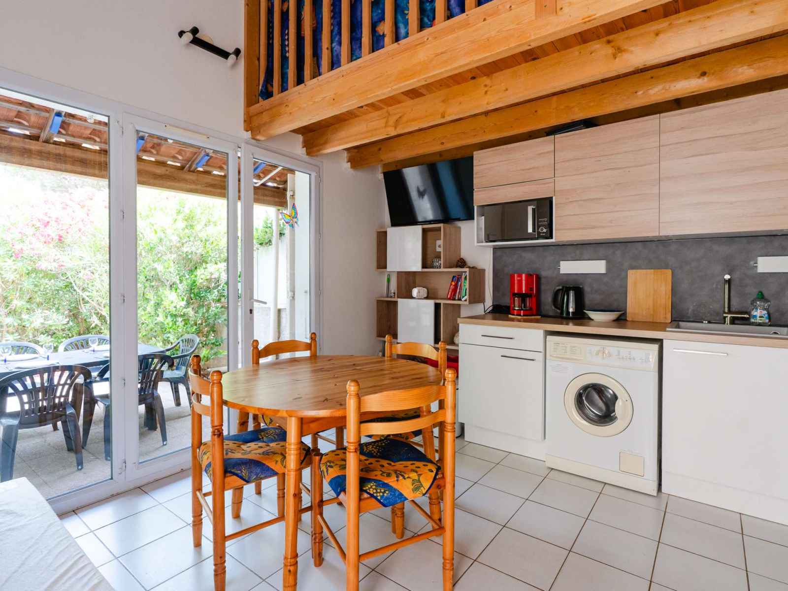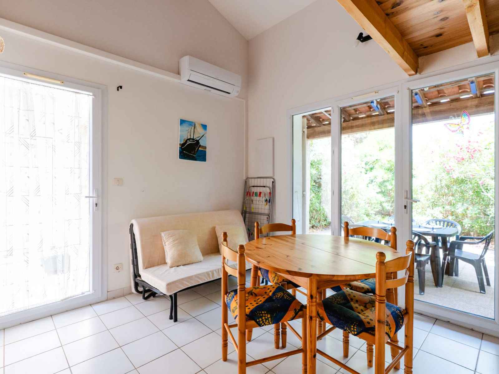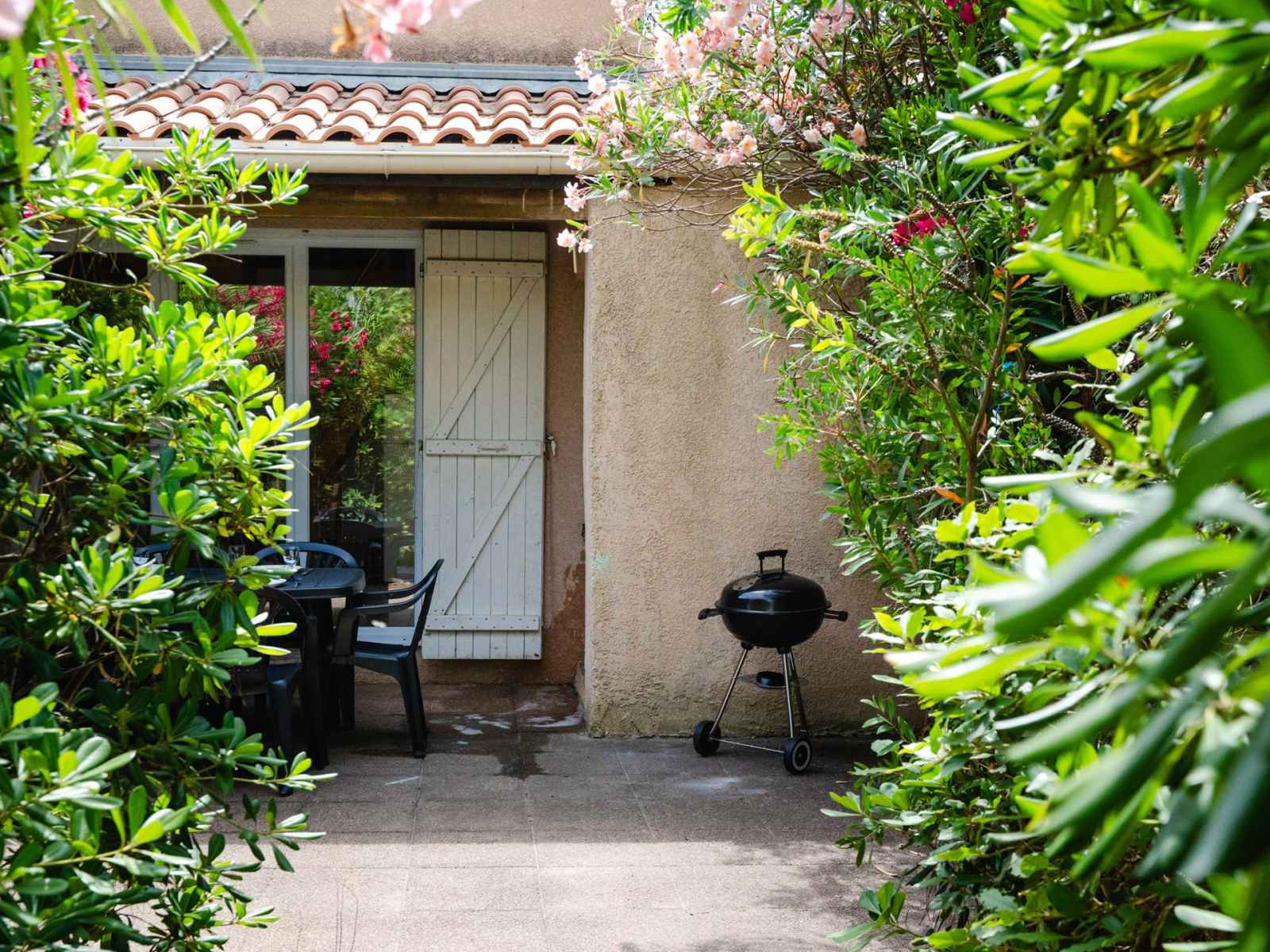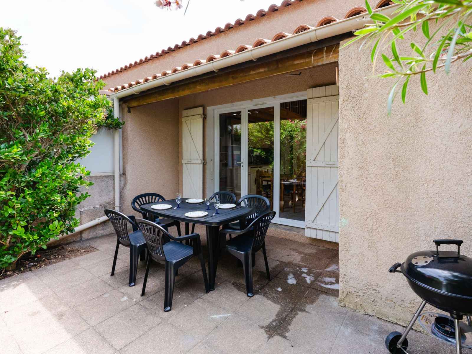• Equipements : 2 Chaises longues, Aspirateur, Barbecue charbon, Bouilloire, Cafetière, Climatisation salon et chambre, Etendoir, Freezer, Lave linge, Lave Vaisselle, Micro-ondes, Moustiquaires, Parasol, Plaques vitrocéramiques, Réfrigérateur, Salon de jardin (6 personnes), Vaisselle pour 6 personnes
