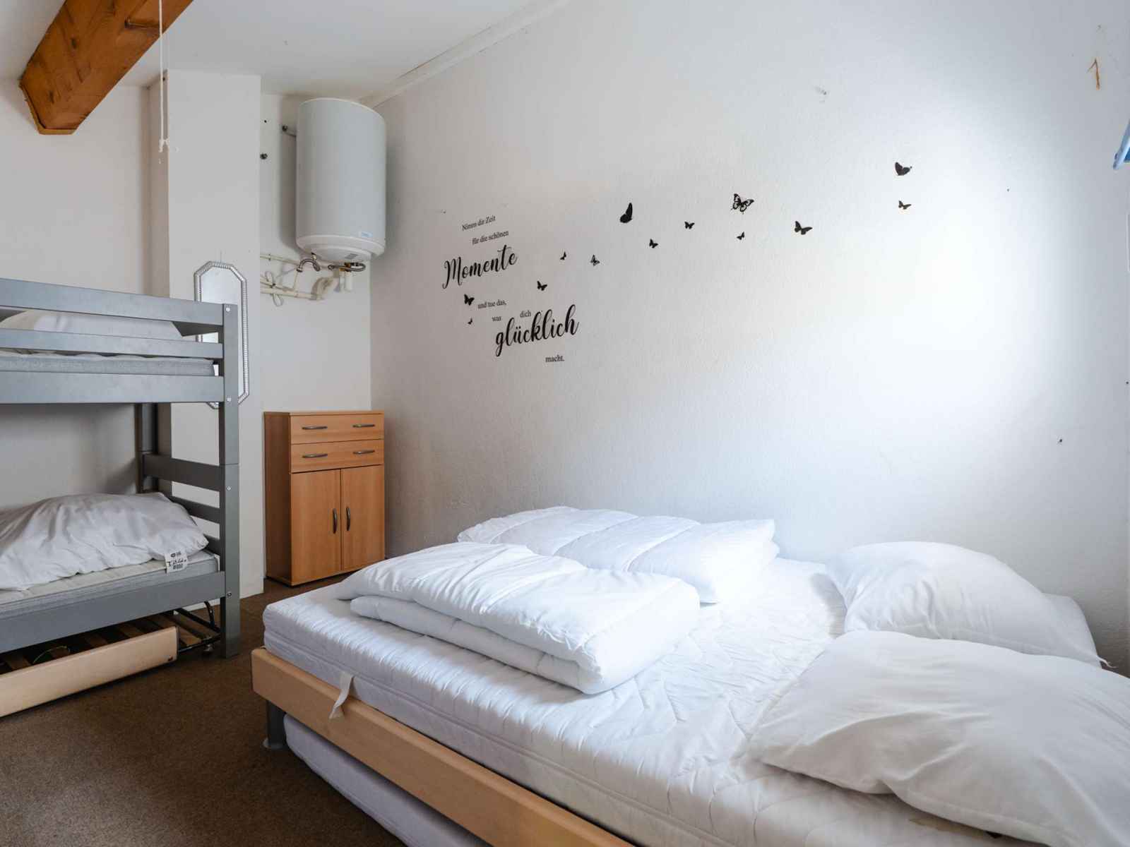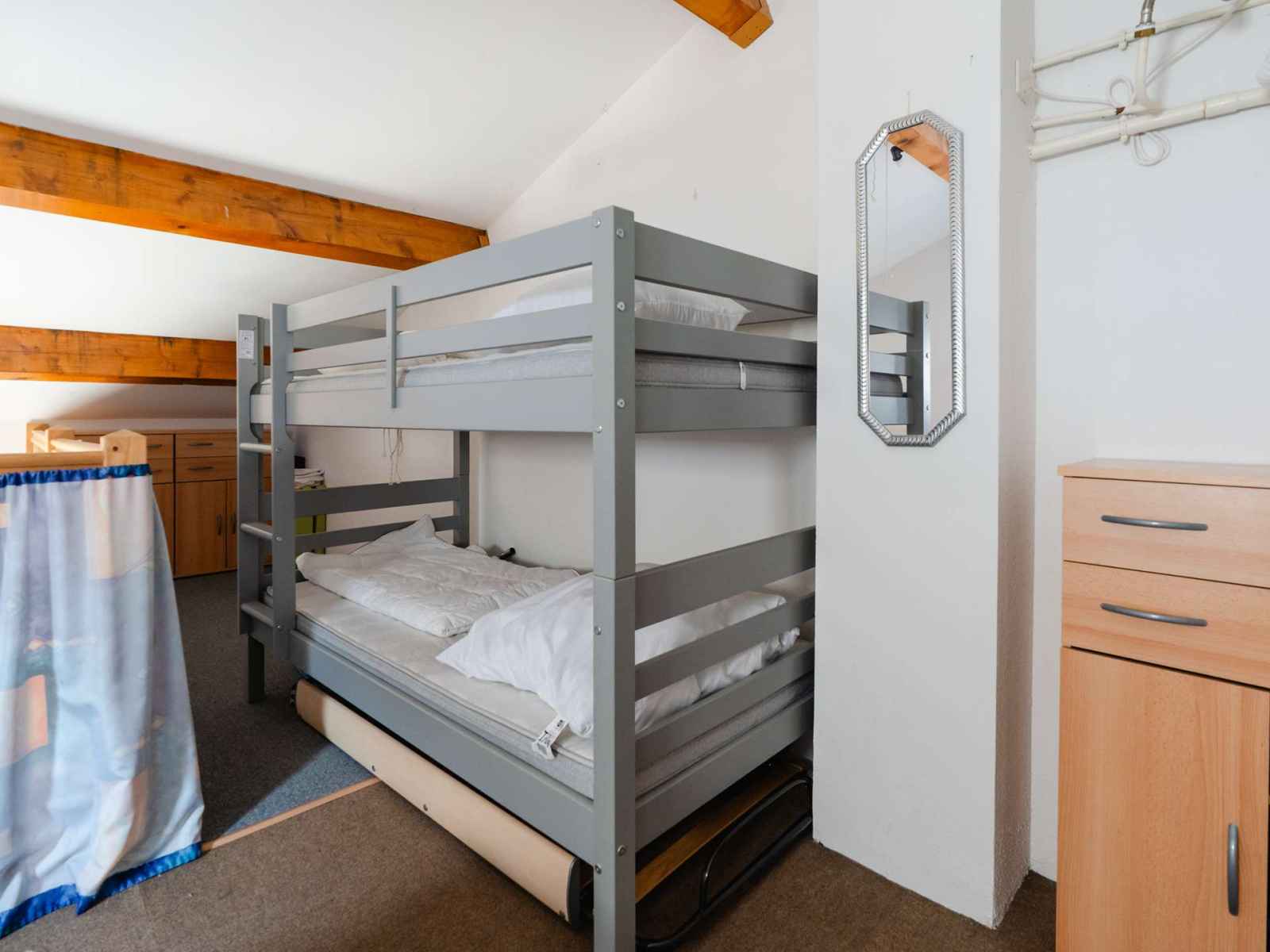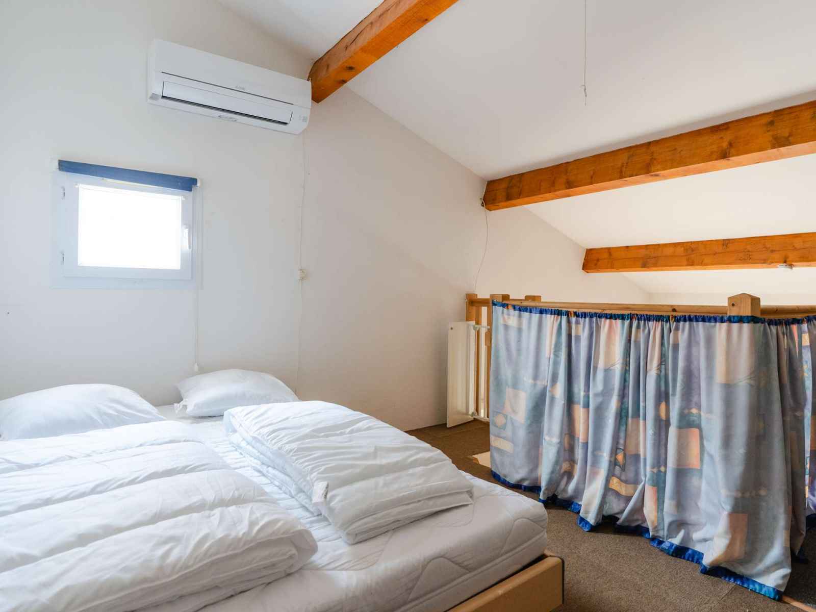 En mezzanine, 2 couchages superposés 1 personne (90x190) + 1 lit en 140 (140x190) rangements .