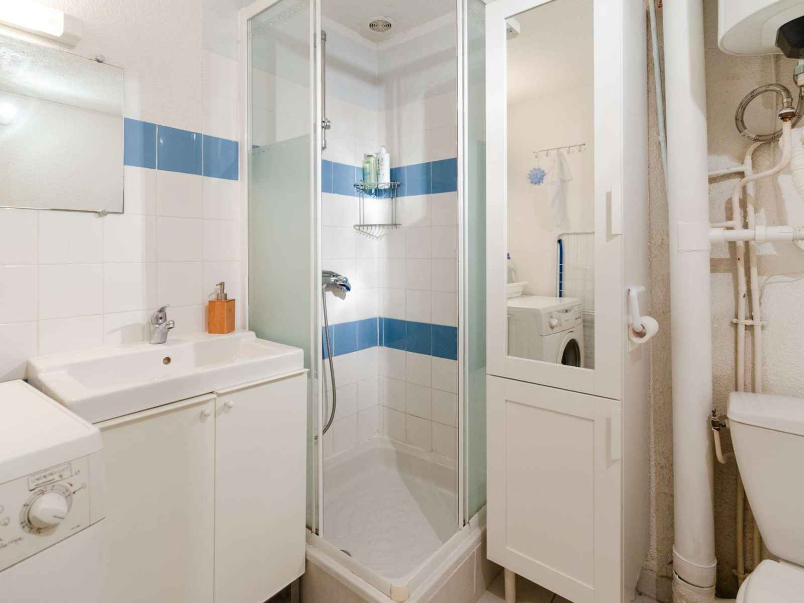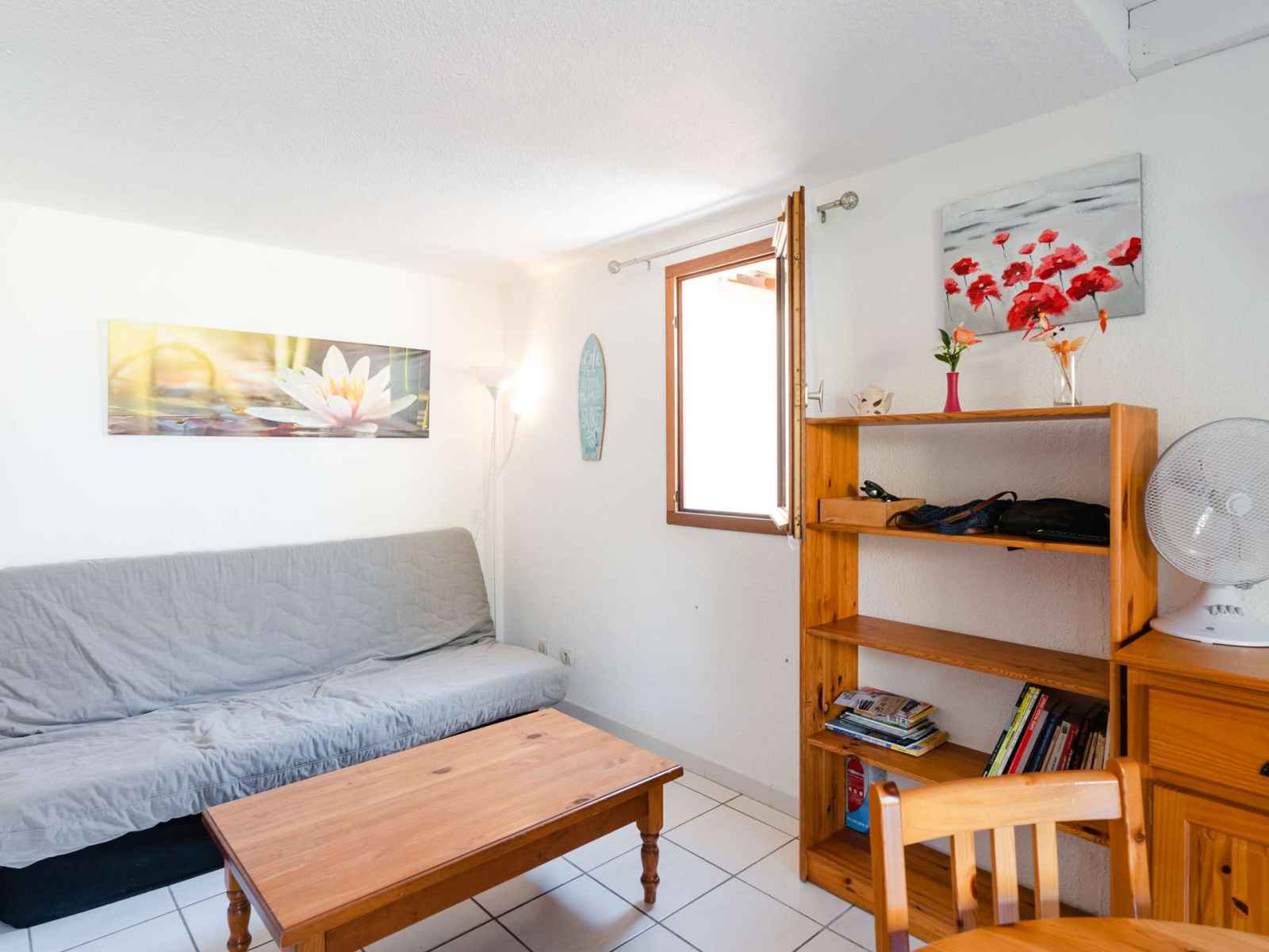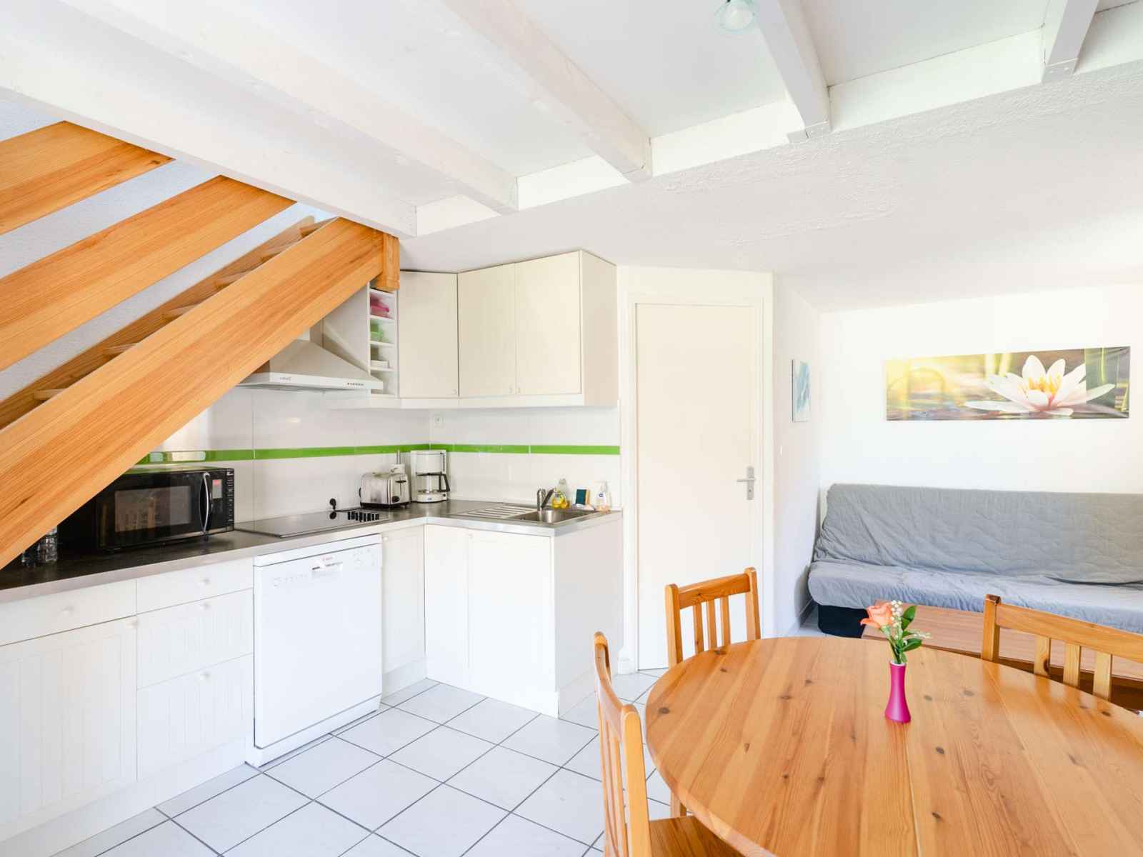 Le séjour est équipé d'une table, canapé, TV chaines françaises, et d'un coin cuisine (plaque de cuisson vitro-céramique 4 feux avec hotte aspirante, cafetière classique, mini-four/micro-ondes, grille-pain, bouilloire, lave-vaisselle, réfrigérateur avec compartiment congélateur). Une salle d'eau avec WC et lave-linge se situe au rez-de-chaussée.