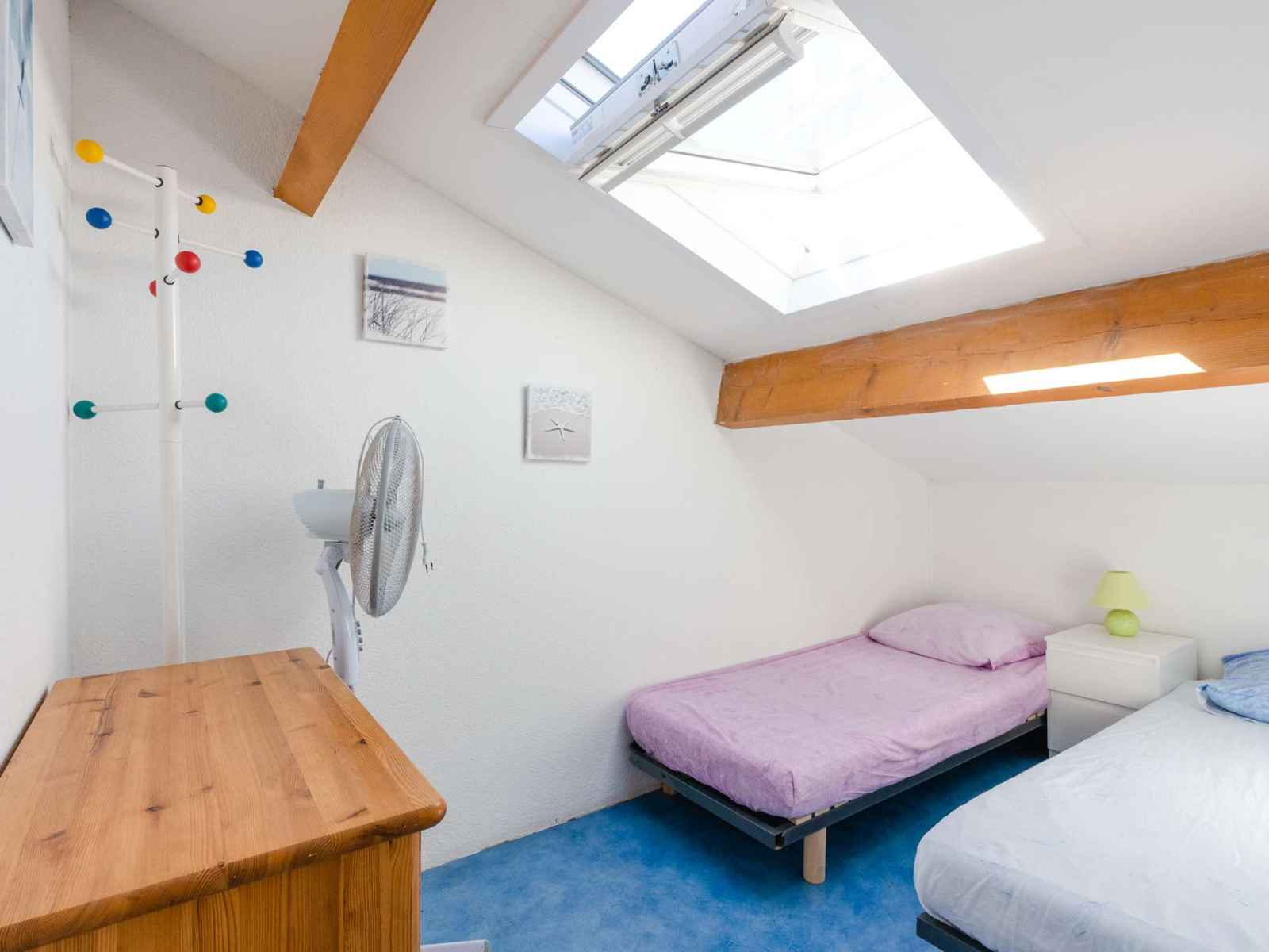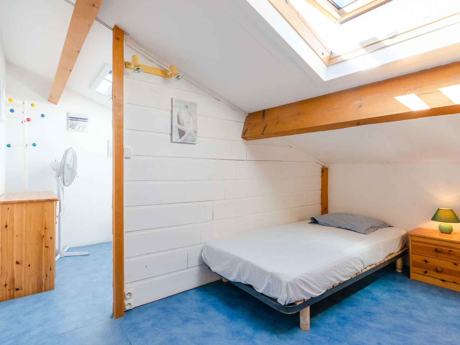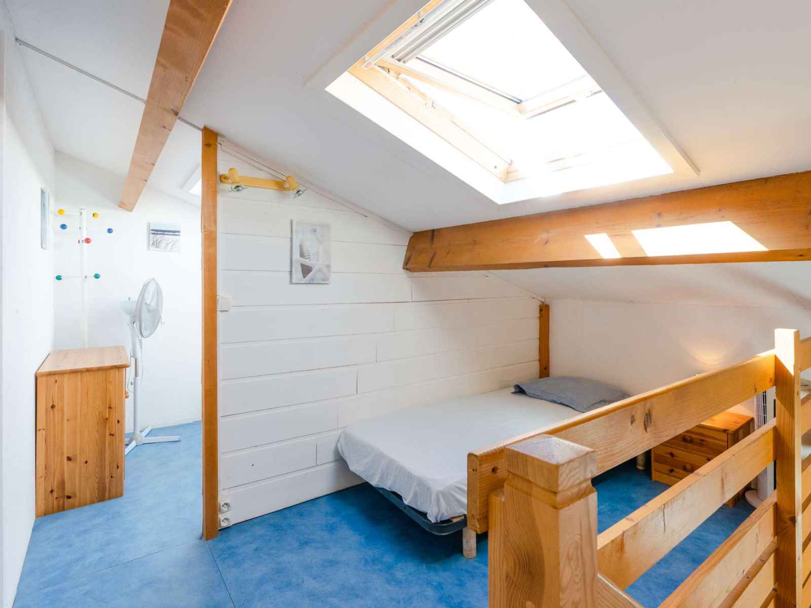 A l'étage la mezzanine est équipée de 3 lits simples (un lit 90x190 et 2 lits 70x190 donc plutôt adaptés à des enfants). Une chambre séparée dispose d'un lit double en 140x190 avec un ventilateur au plafond. Une 2ème salle d'eau avec WC et lavabo est située à l'étage.