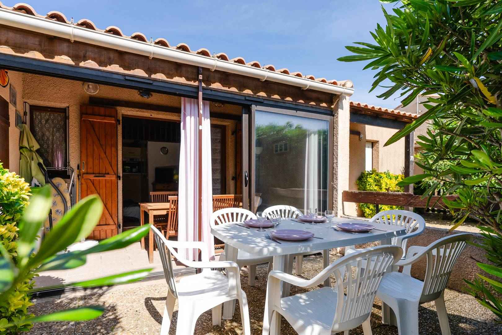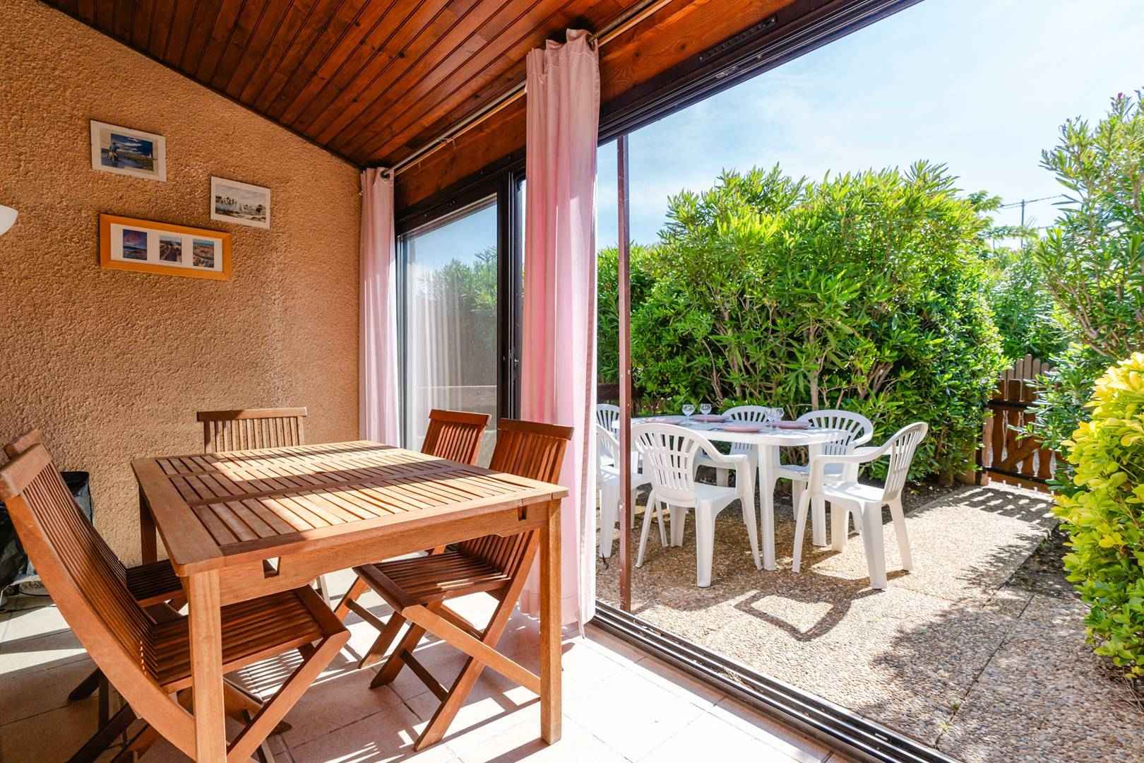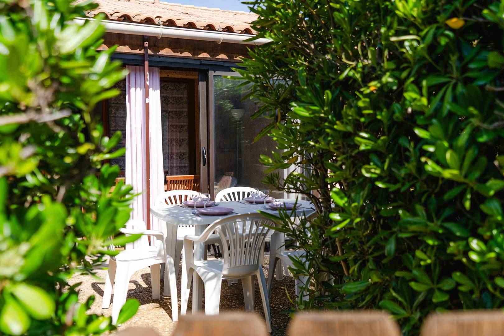 détente (lave-linge, fauteuils, table basse), d'un coin-cuisine (four, micro-ondes, réfrigérateur, lave-linge, cafetière), d'un séjour avec canapé-convertible (140x190cm), TV (chaînes françaises), table à manger donnant accès à une véranda et une agréable terrasse (table et chaises de jardins, barbecue, parasol).