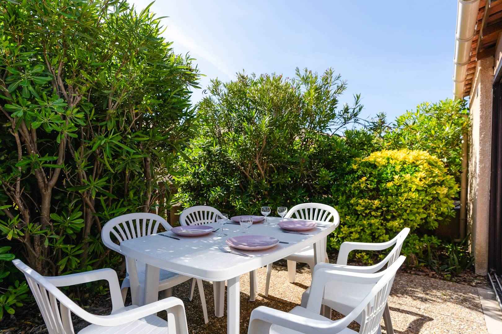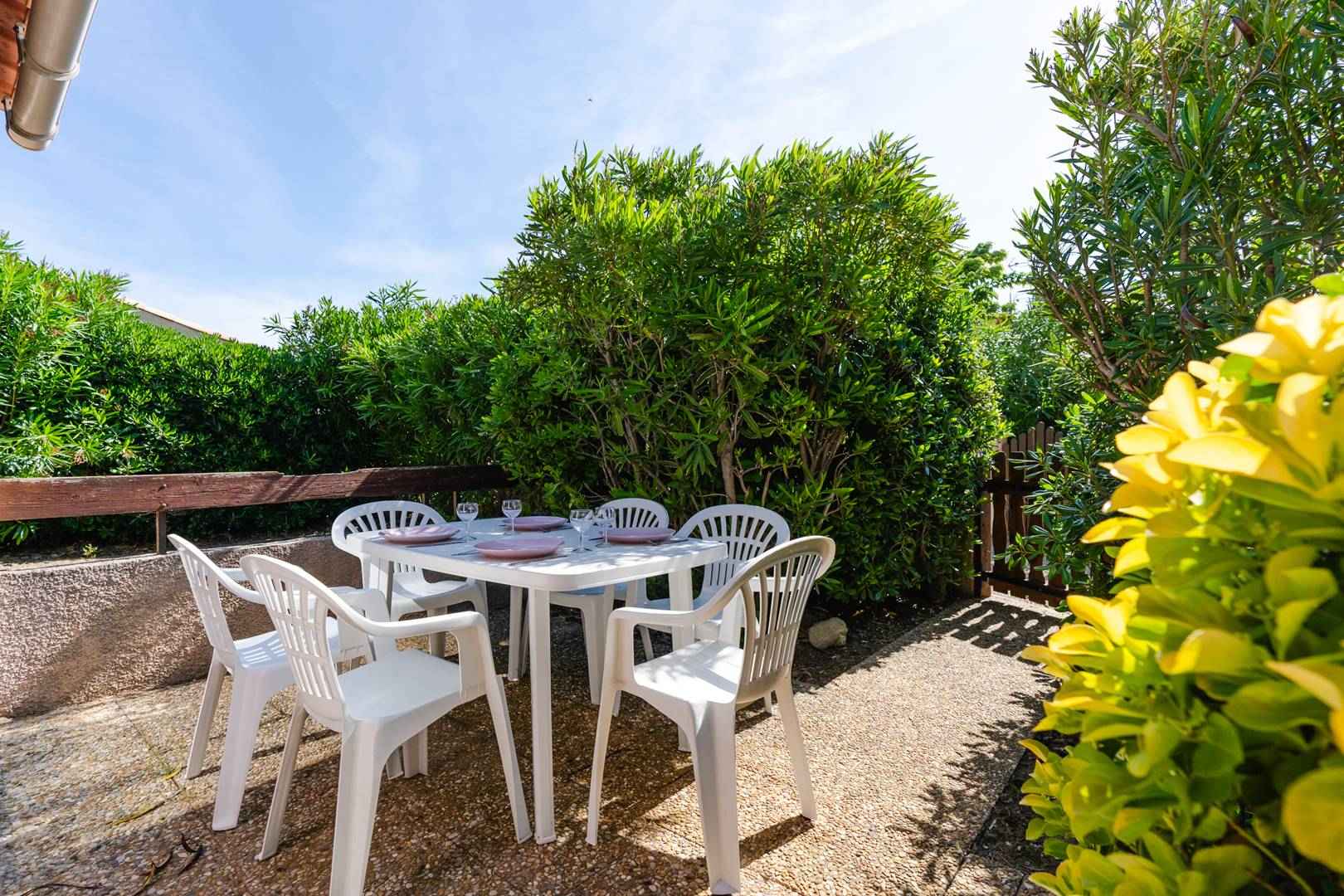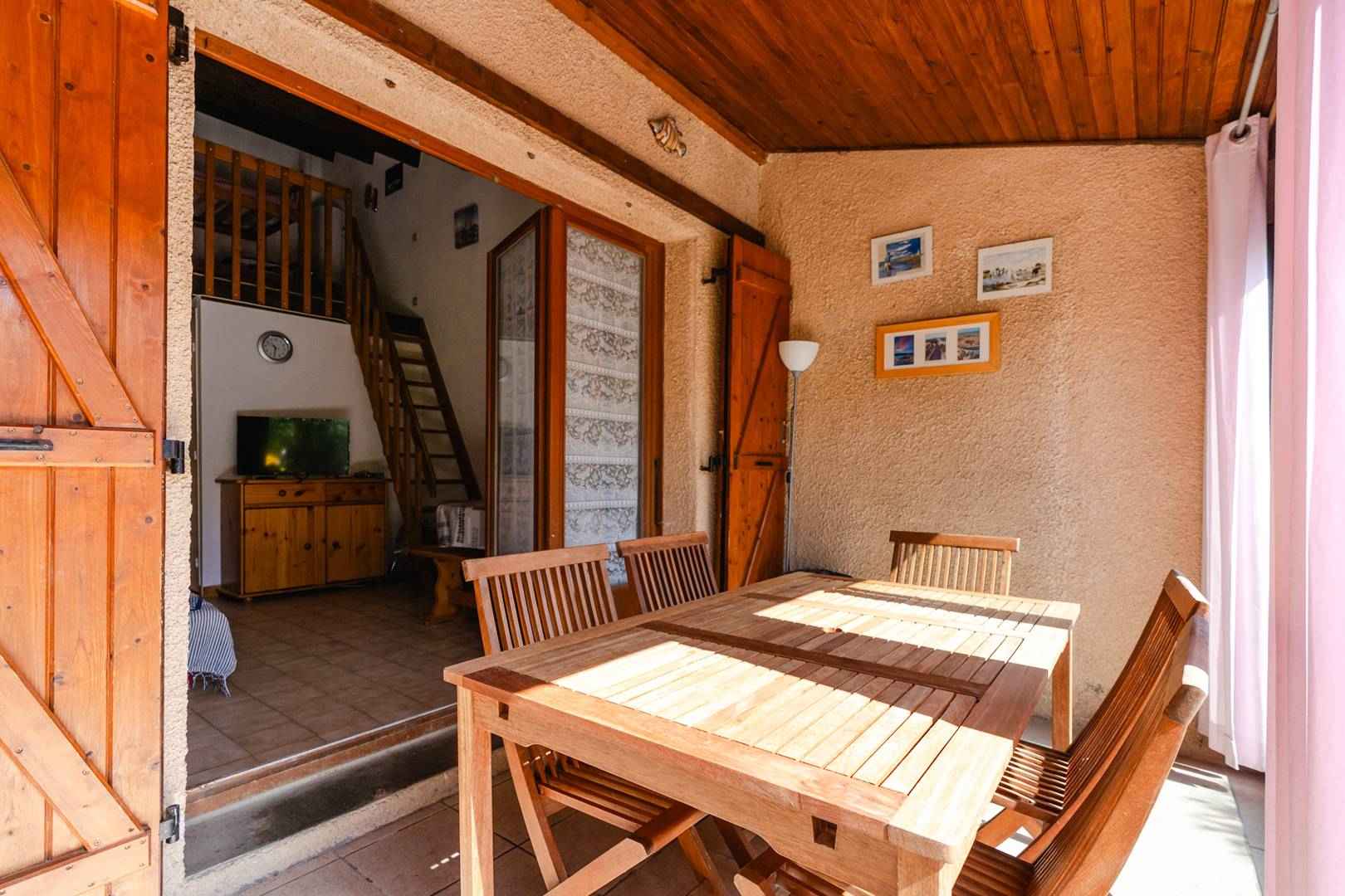 détente (lave-linge, fauteuils, table basse), d'un coin-cuisine (four, micro-ondes, réfrigérateur, lave-linge, cafetière), d'un séjour avec canapé-convertible (140x190cm), TV (chaînes françaises), table à manger donnant accès à une véranda et une agréable terrasse (table et chaises de jardins, barbecue, parasol).