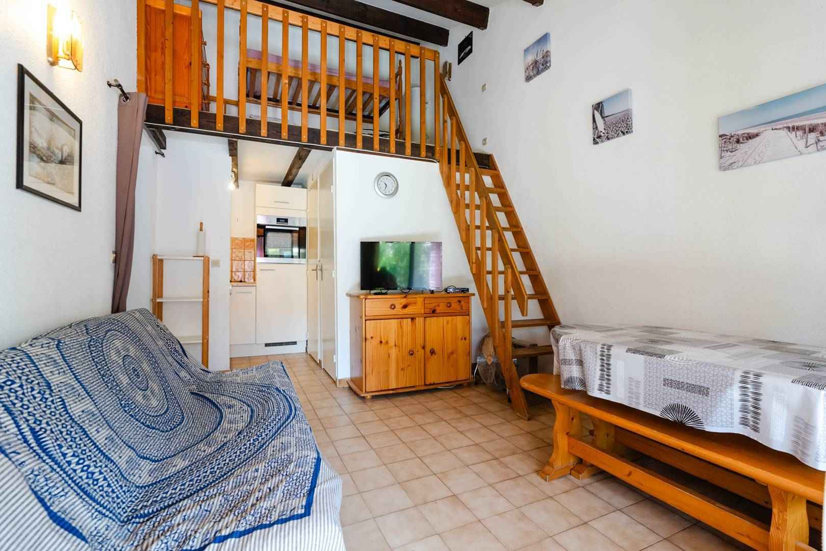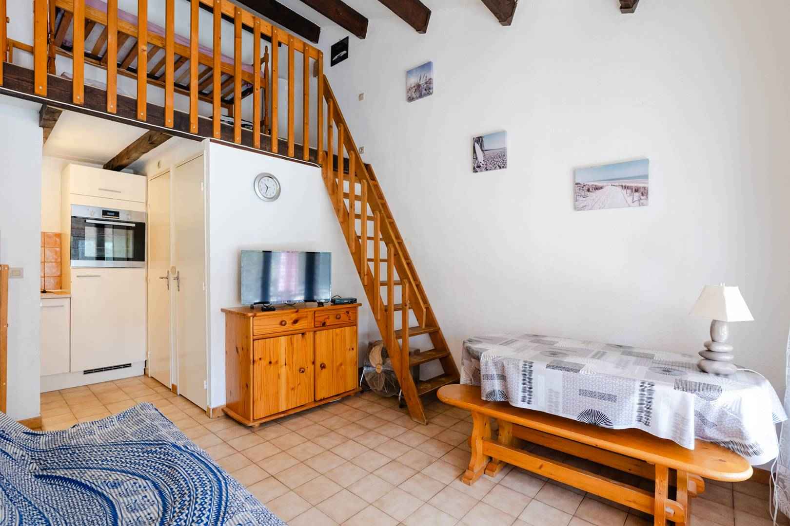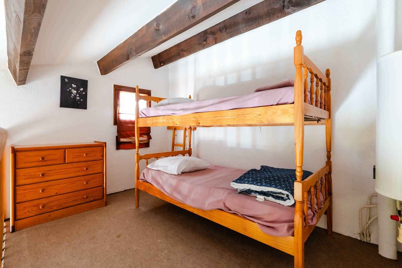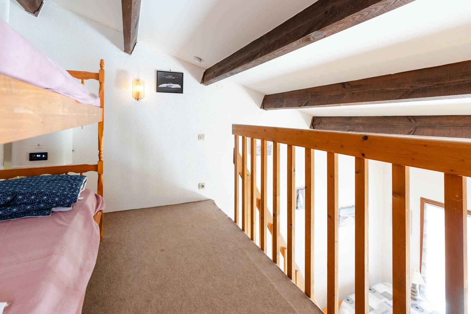 A l'étage, la mezzanine contient des lits superposés (90x190cm).
