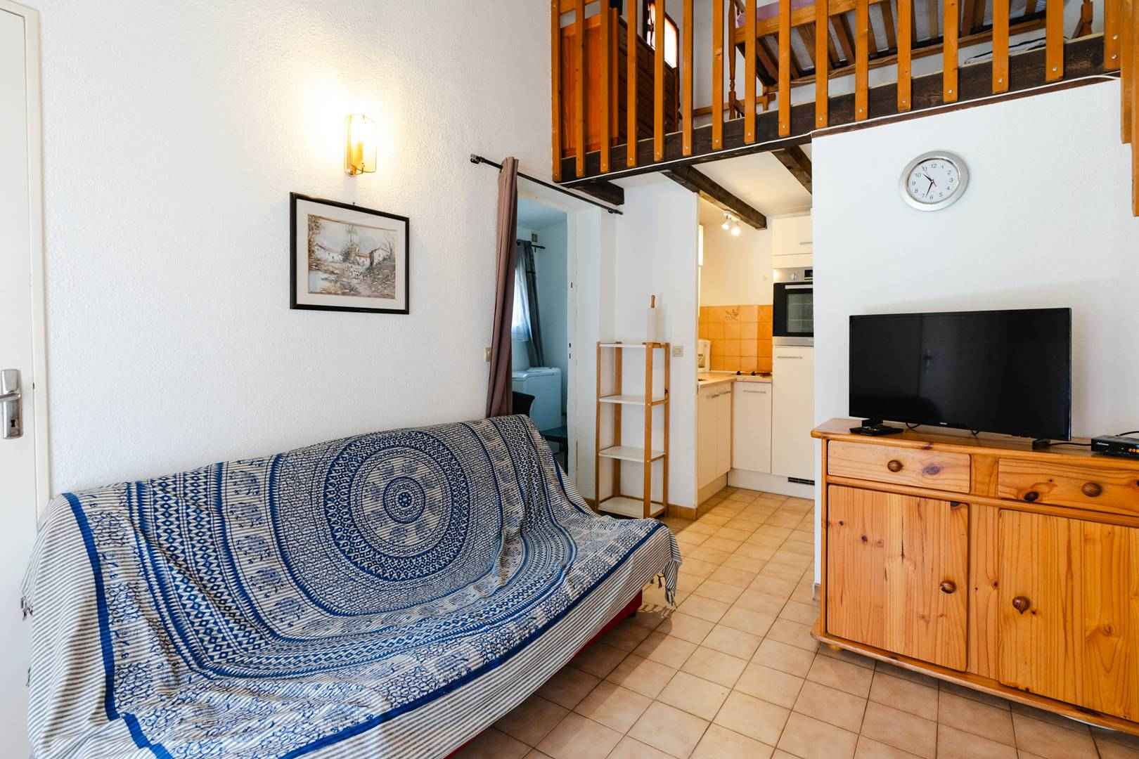 - Séjour (Canapé-lit (140x190cm), tv, table à manger, bancs)