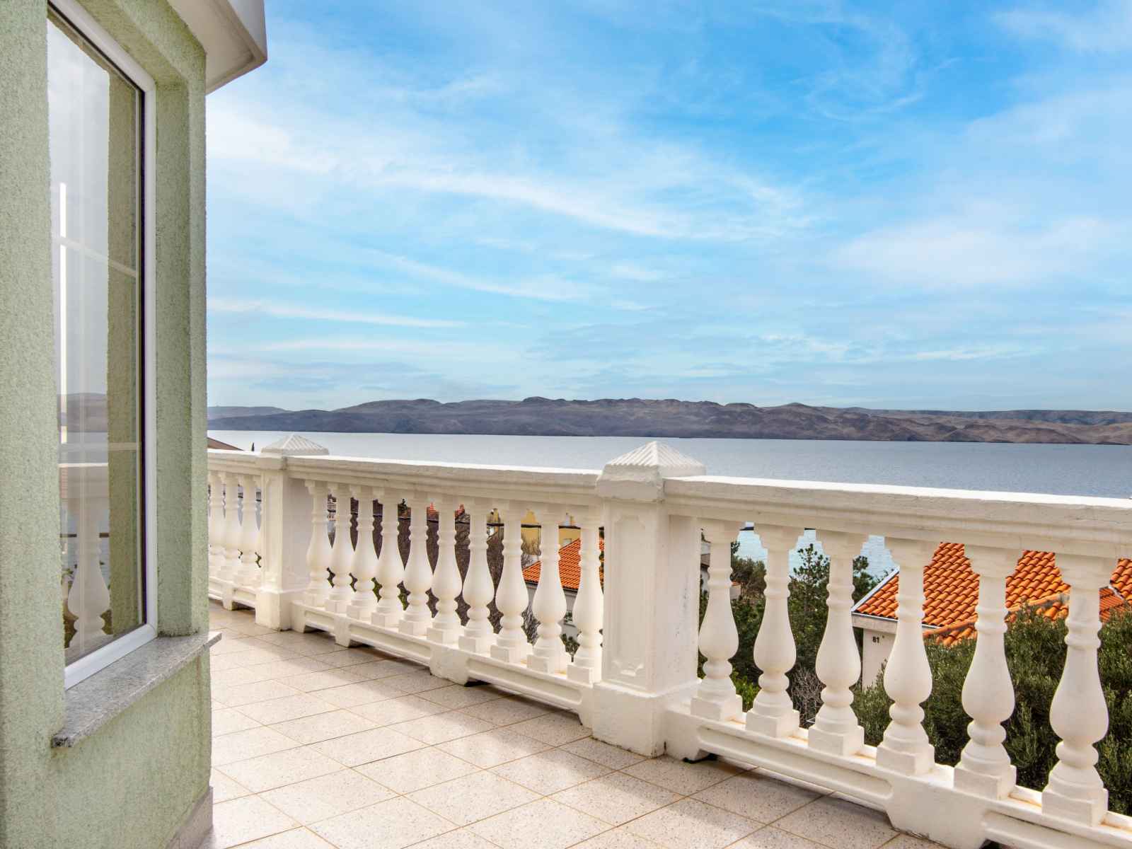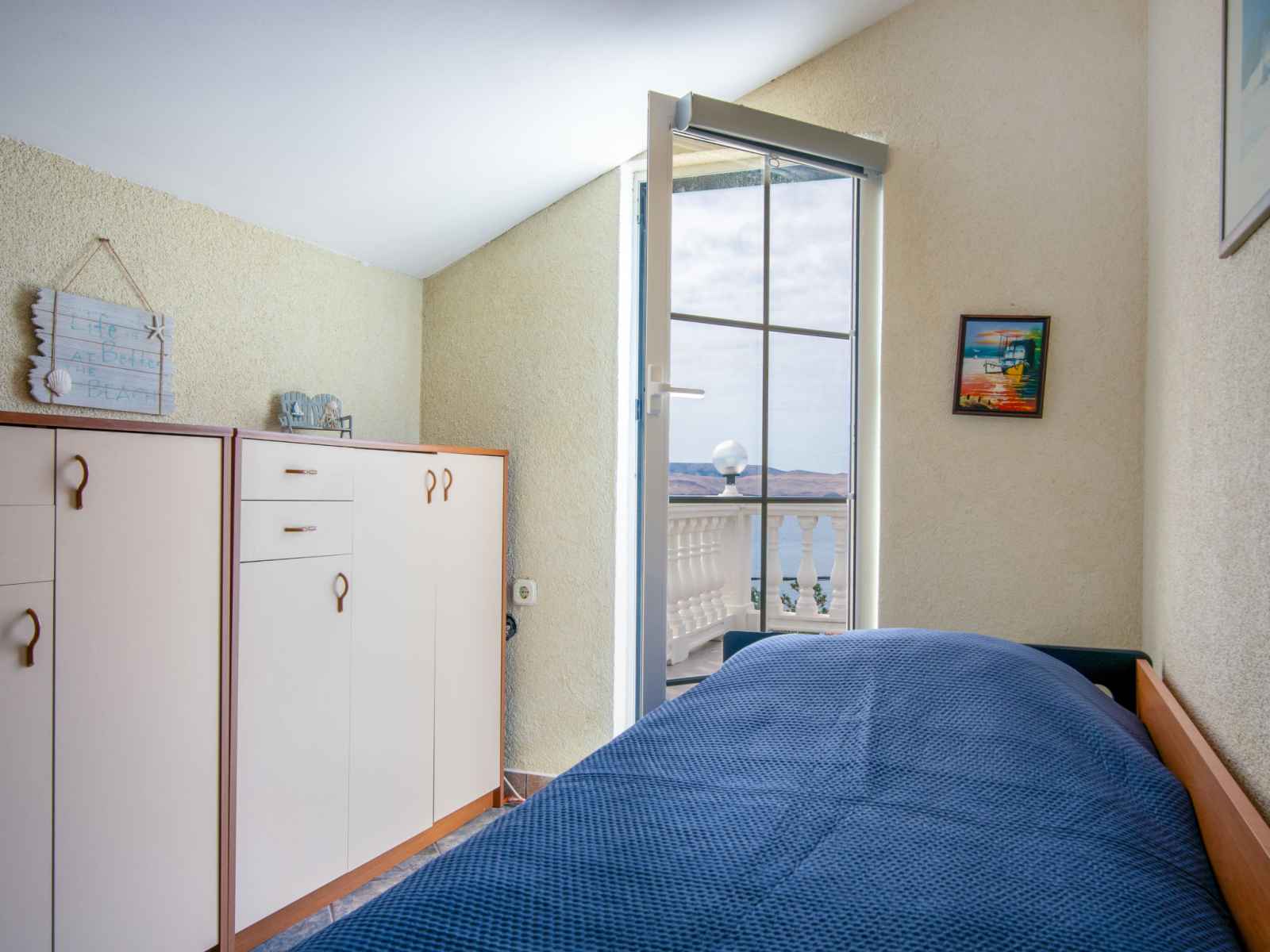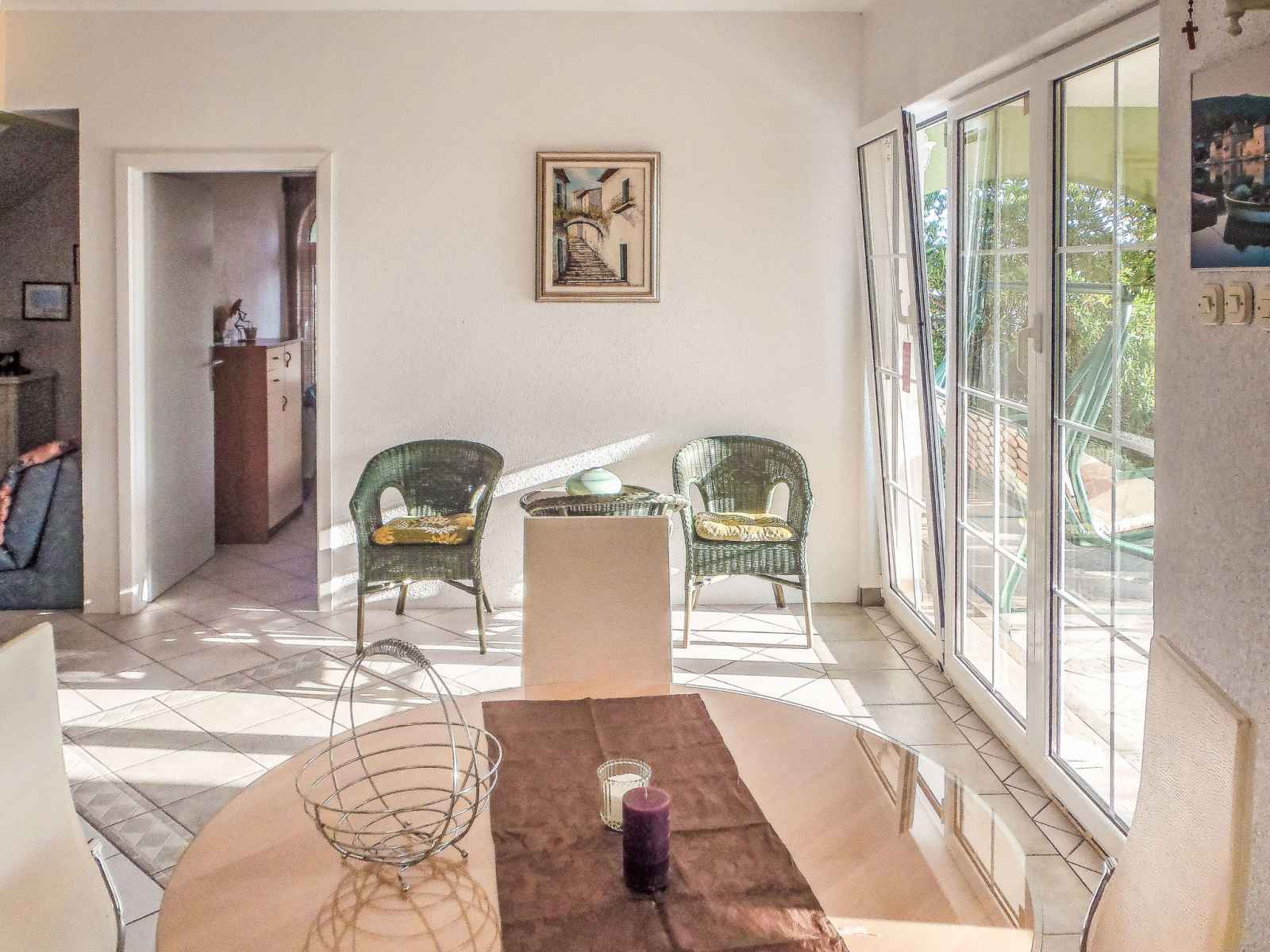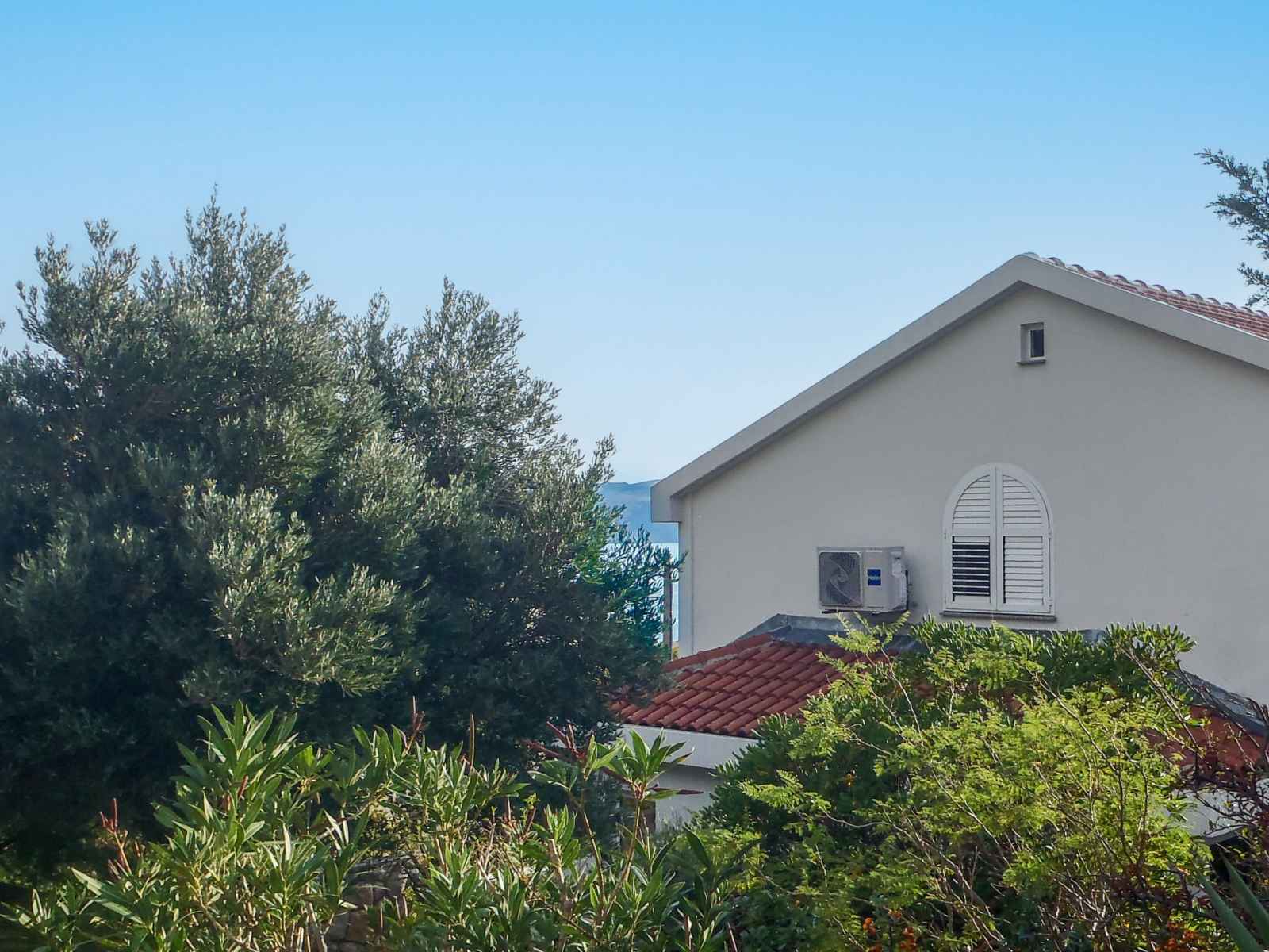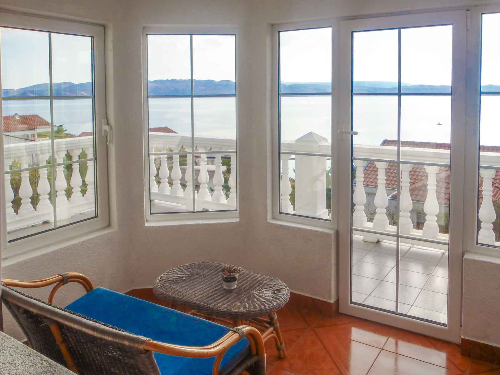 Sortie sur la terrasse. Douche/WC. À l'étage supérieur: séjour/salle à manger avec air-conditionné. 2 chambres, mansardées hauteur plafond 165 - 230 cm, chaque chambre avec: 1 lit (90 cm, longueur 200 cm). Sortie sur le balcon. 1 chambre avec 1 grand-lit (160 cm, longueur 200 cm), TV (satellite) (écran plat). Sortie sur le balcon. Cuisine ouverte (lave-vaisselle, 2 plaques vitrocéramiques, bouilloire électrique, congélateur, cafetière électrique). Douche/WC. Balcon 30 m2, terrasse 35 m2. Meubles de terrasse, mobilier de balcon, chaises longues. Vue panoramique sur la mer. A disposition: fer à repasser, sèche-cheveux. Internet (Connexion WIFI, gratuit). Veuillez noter: maison non-fumeur. Maximum 1 animal/ chien autorisé.