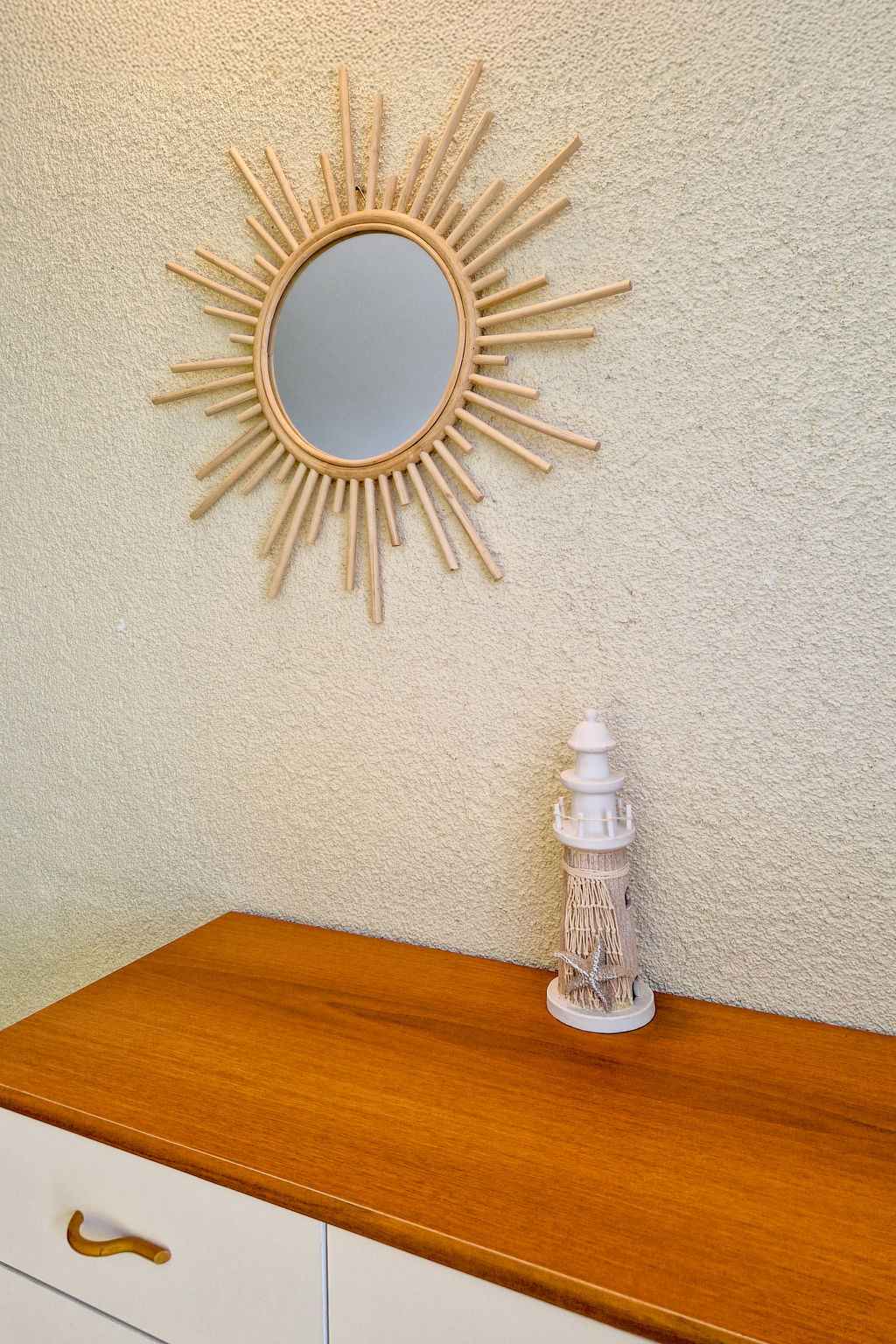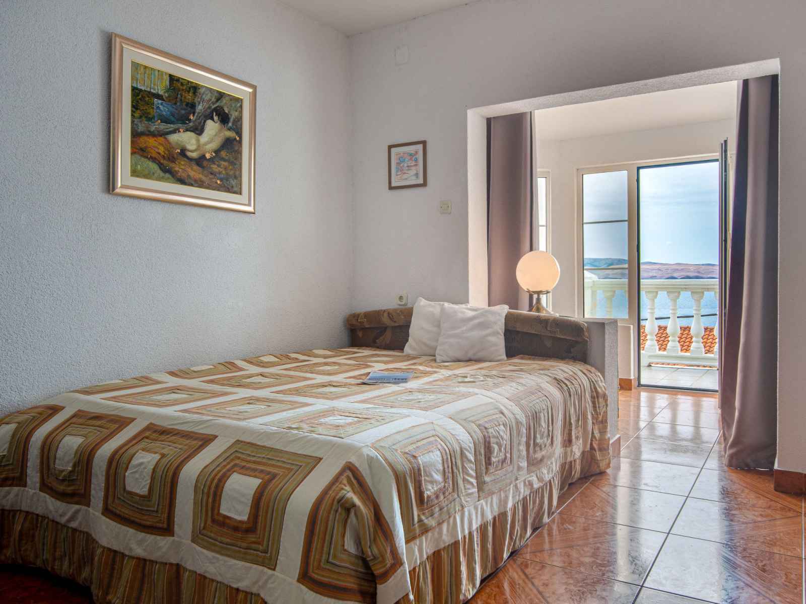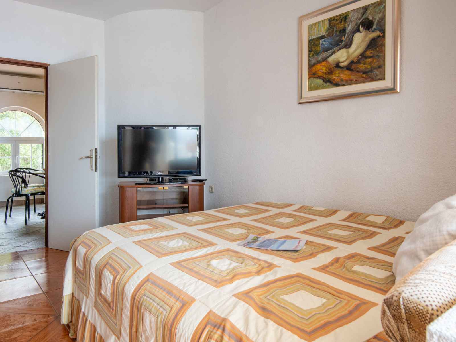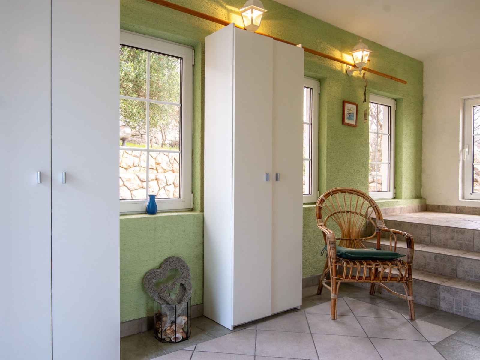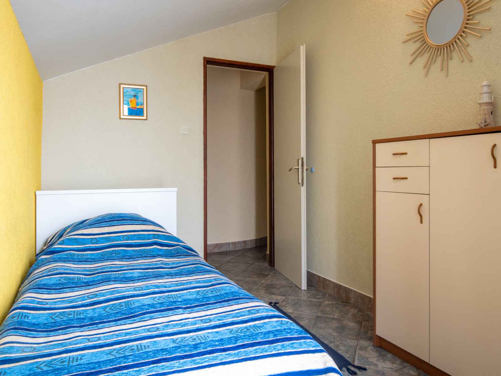Sortie sur la terrasse. Douche/WC. À l'étage supérieur: séjour/salle à manger avec air-conditionné. 2 chambres, mansardées hauteur plafond 165 - 230 cm, chaque chambre avec: 1 lit (90 cm, longueur 200 cm). Sortie sur le balcon. 1 chambre avec 1 grand-lit (160 cm, longueur 200 cm), TV (satellite) (écran plat). Sortie sur le balcon. Cuisine ouverte (lave-vaisselle, 2 plaques vitrocéramiques, bouilloire électrique, congélateur, cafetière électrique). Douche/WC. Balcon 30 m2, terrasse 35 m2. Meubles de terrasse, mobilier de balcon, chaises longues. Vue panoramique sur la mer. A disposition: fer à repasser, sèche-cheveux. Internet (Connexion WIFI, gratuit). Veuillez noter: maison non-fumeur. Maximum 1 animal/ chien autorisé.