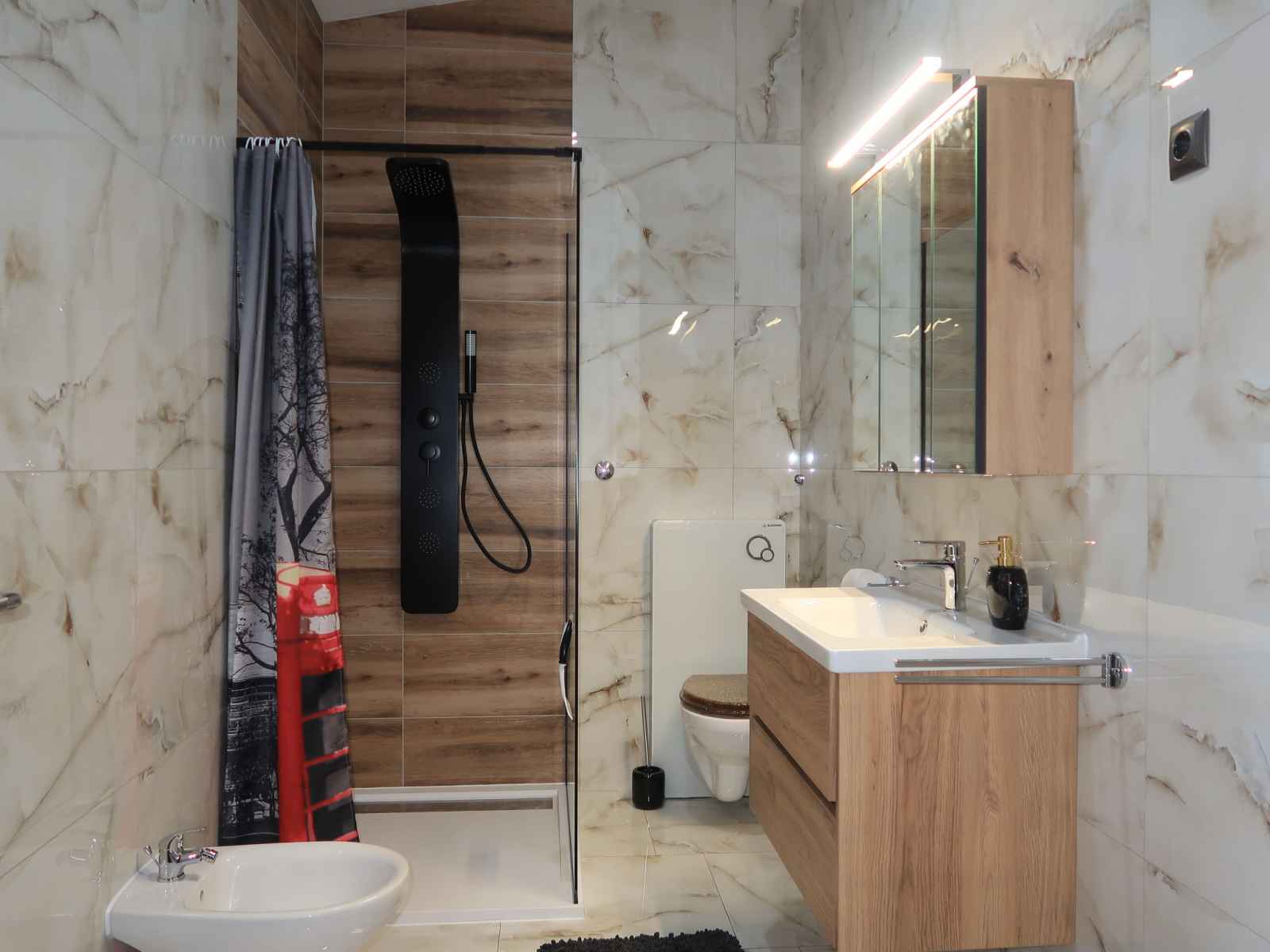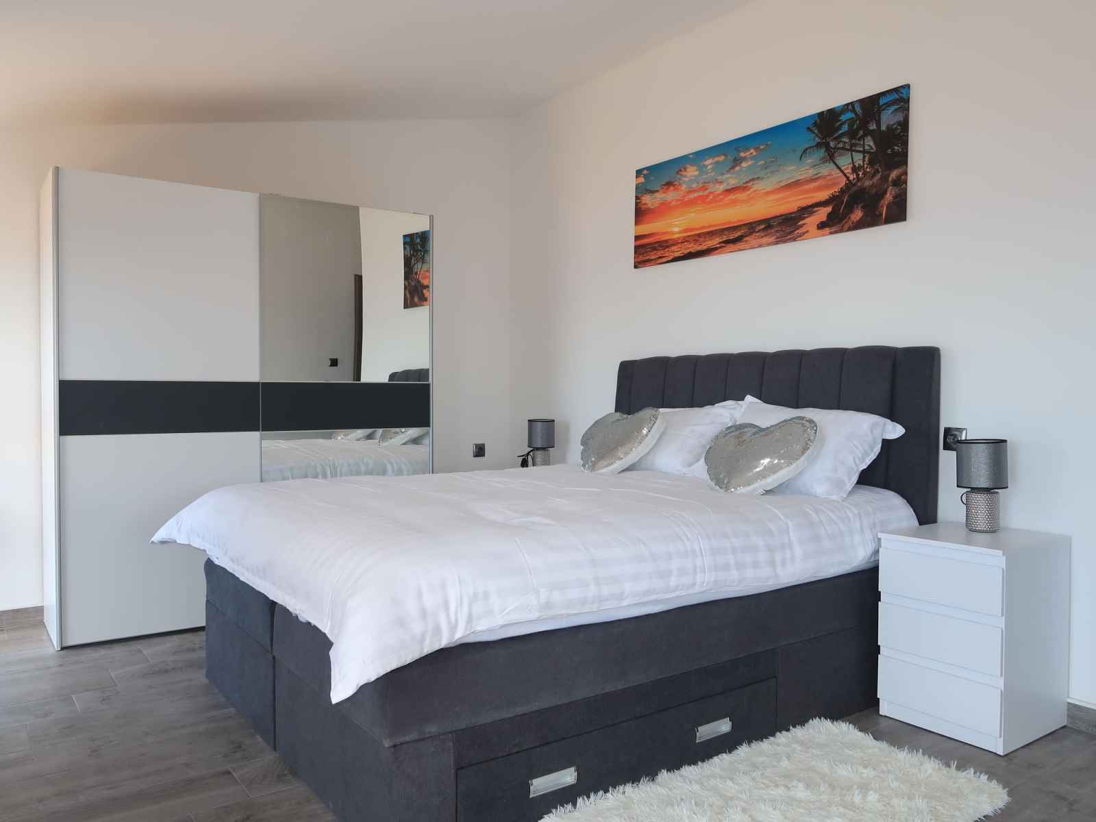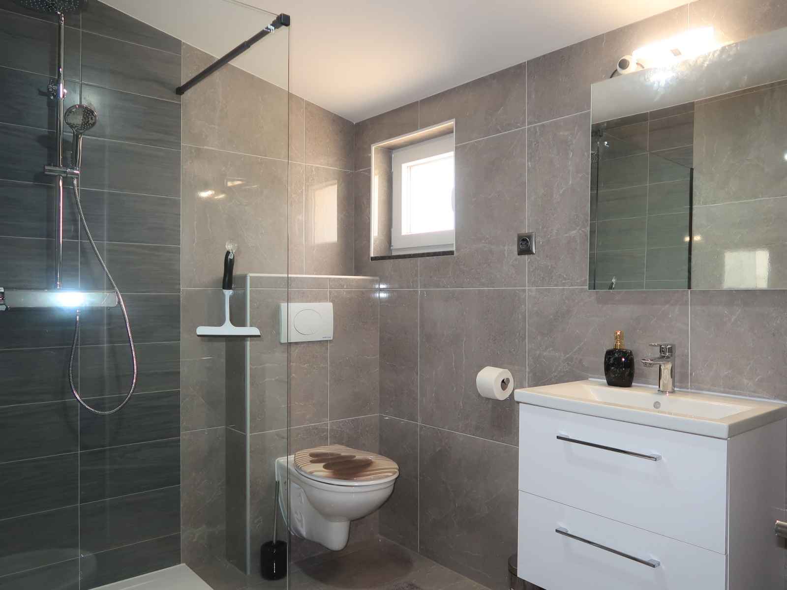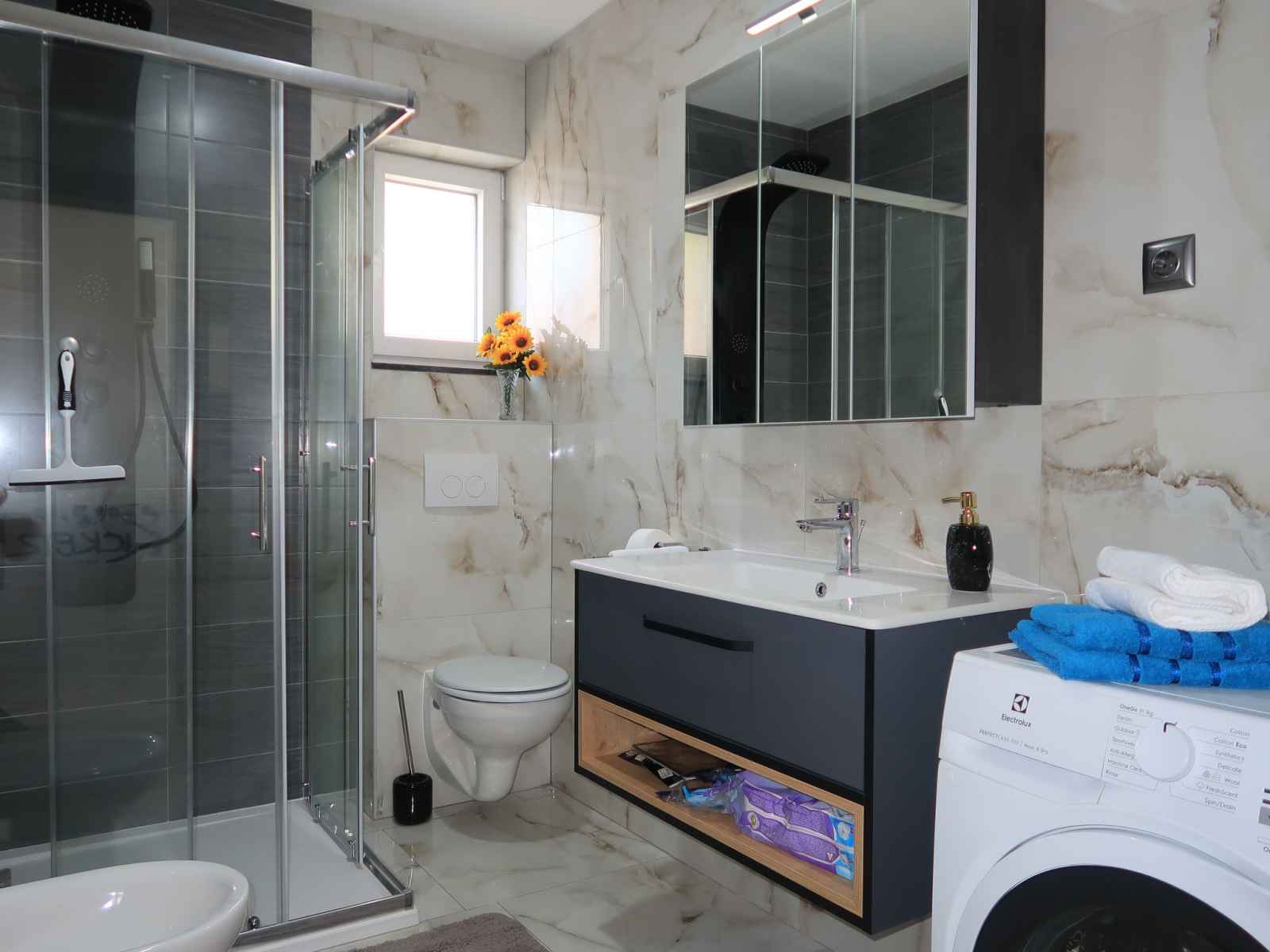 Douche/bidet/WC. À l'étage supérieur: 1 chambre avec 1 grand-lit (160 cm, longueur 200 cm), douche/WC, TV (satellite) et air-conditionné. Sortie sur le balcon. 1 chambre avec 2 lits (80 cm, longueur 200 cm), TV (satellite) et air-conditionné. Sortie sur le balcon. 1 chambre avec 1 grand-lit (160 cm, longueur 200 cm), douche/WC, TV (satellite) et air-conditionné. Douche/bidet/WC. Chauffage à air chaud. Balcon 6 m2, terrasse 16 m2. Meubles de terrasse. Belle vue sur la mer. A disposition: coffre-fort, moustiquaire. Internet (Connexion WIFI, gratuit). Veuillez noter: maison non-fumeur.