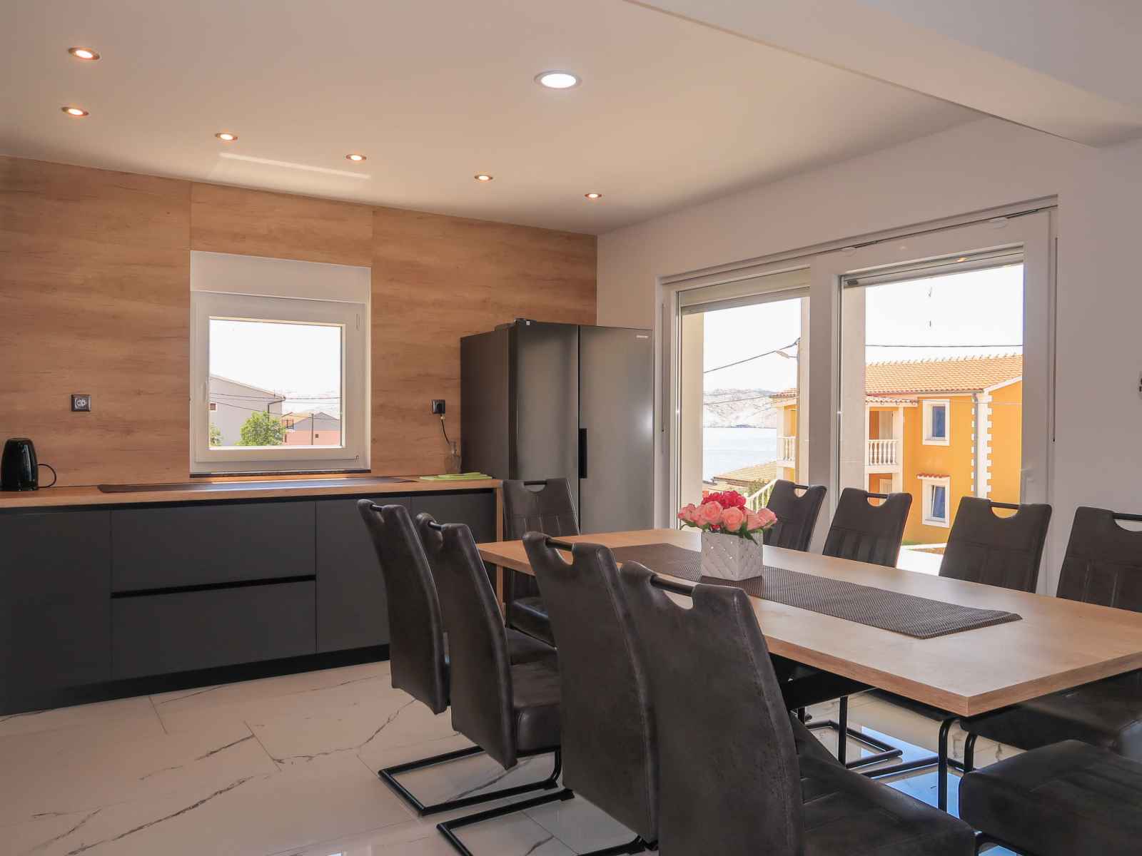 Maison 5 pièces 150 m2 sur 2 niveaux. séjour/salle à manger 40 m2 avec tv (satellite) et air-conditionné. sortie sur la terrasse. 1 chambre avec 1 grand-lit (160 cm, longueur 200 cm), tv (satellite). cuisine ouverte (four, 4 plaques à induction, grille-pain, bouilloire électrique, micro-ondes, congélateur, cafetière électrique).