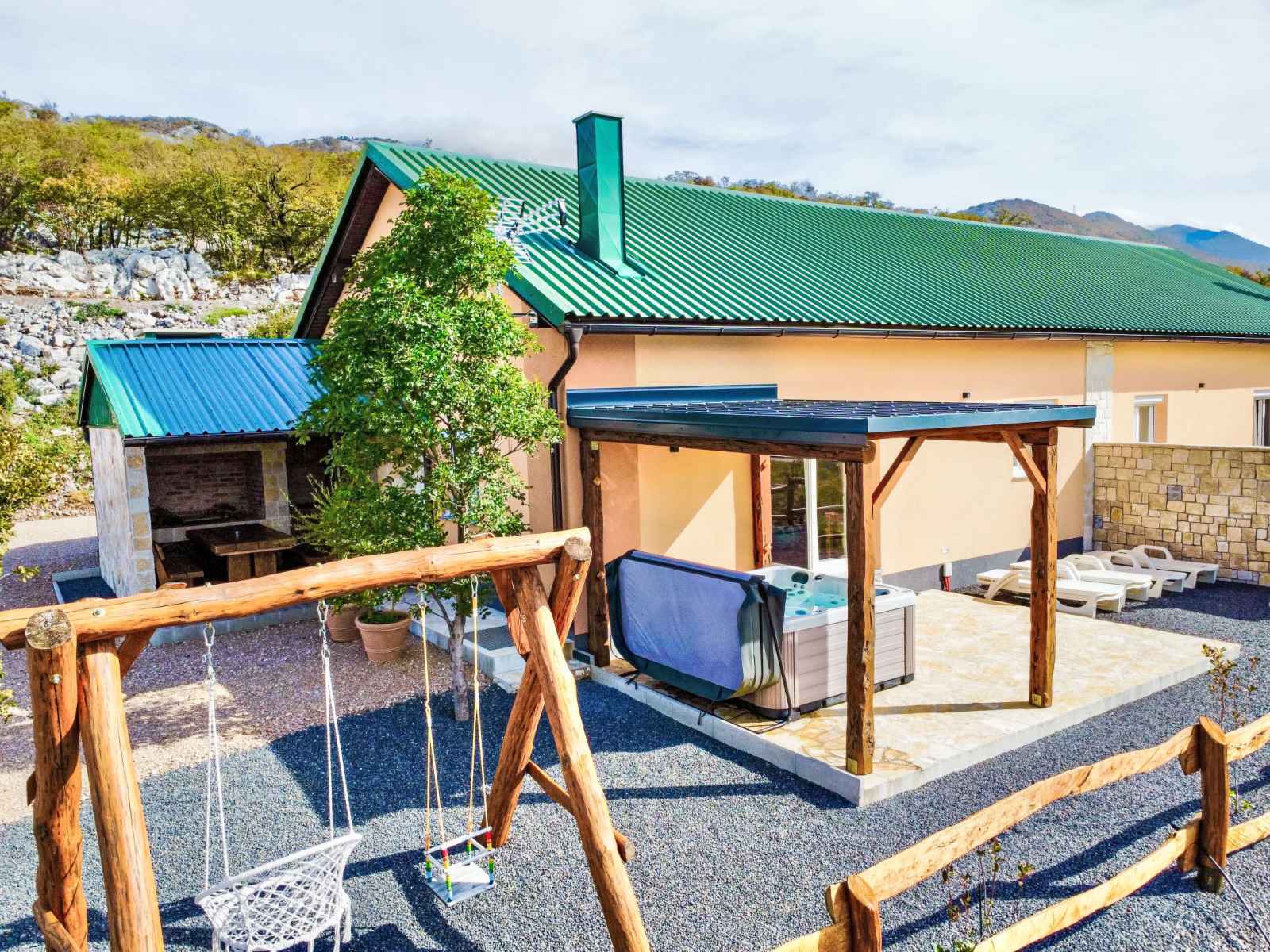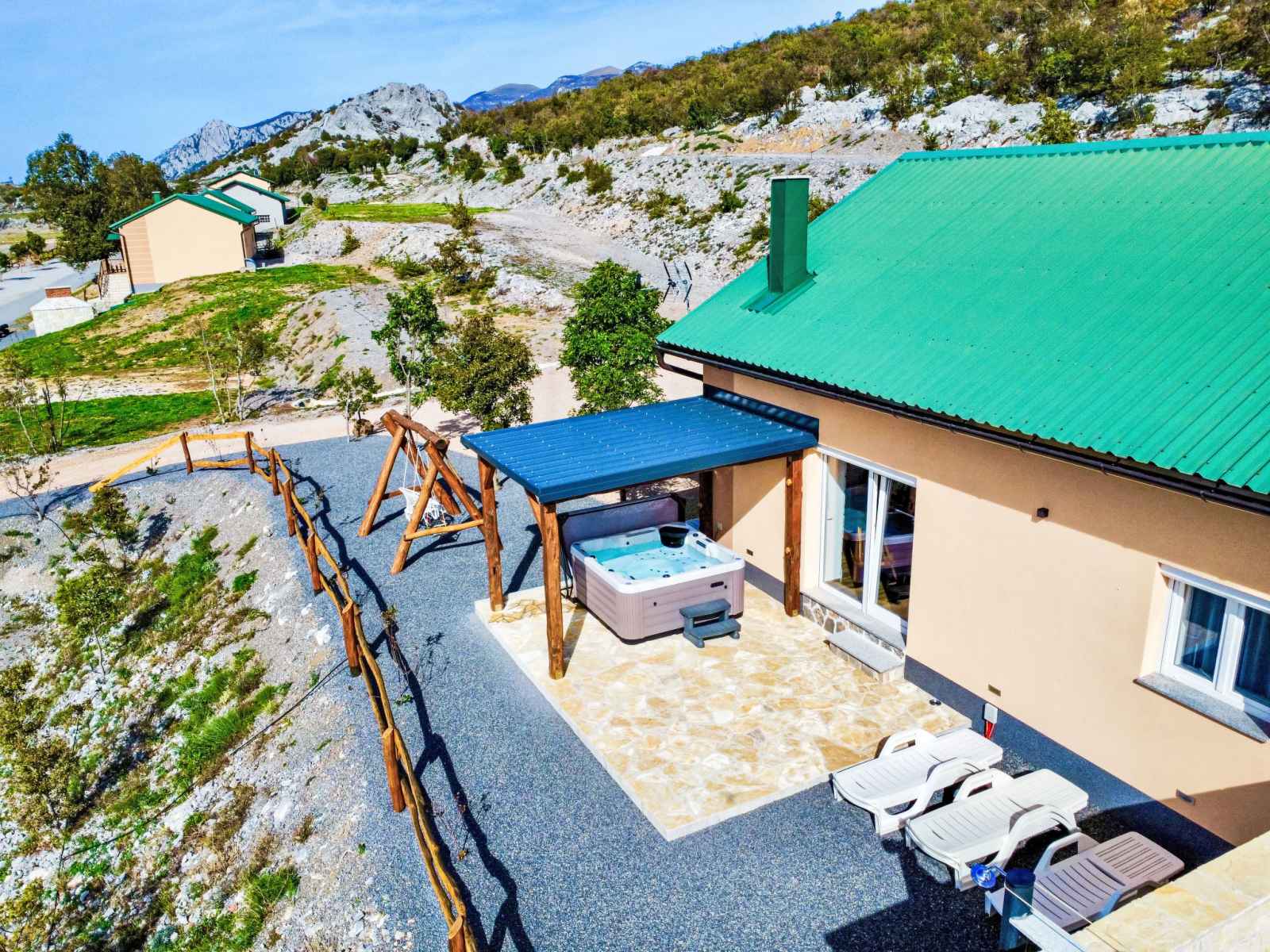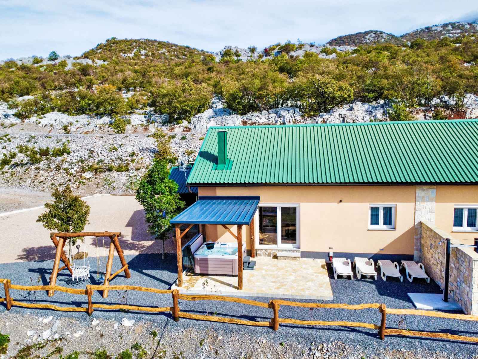 Ledenik cesarički à 10 km de karlobag: maison à 2 apts "iva", année de construction 2024. situation ensoleillée, à 11 km de la mer, à 11 km de la plage. en commun: terrain 6'000 m2. bain à remous . a usage privé: meubles de jardin, barbecue. infrastructures de la maison: accès internet, lave-linge. place de parking (pour 3 voitures)