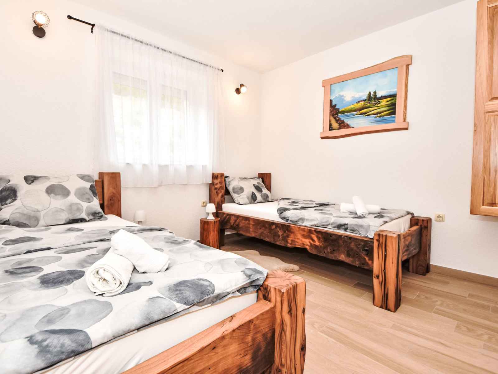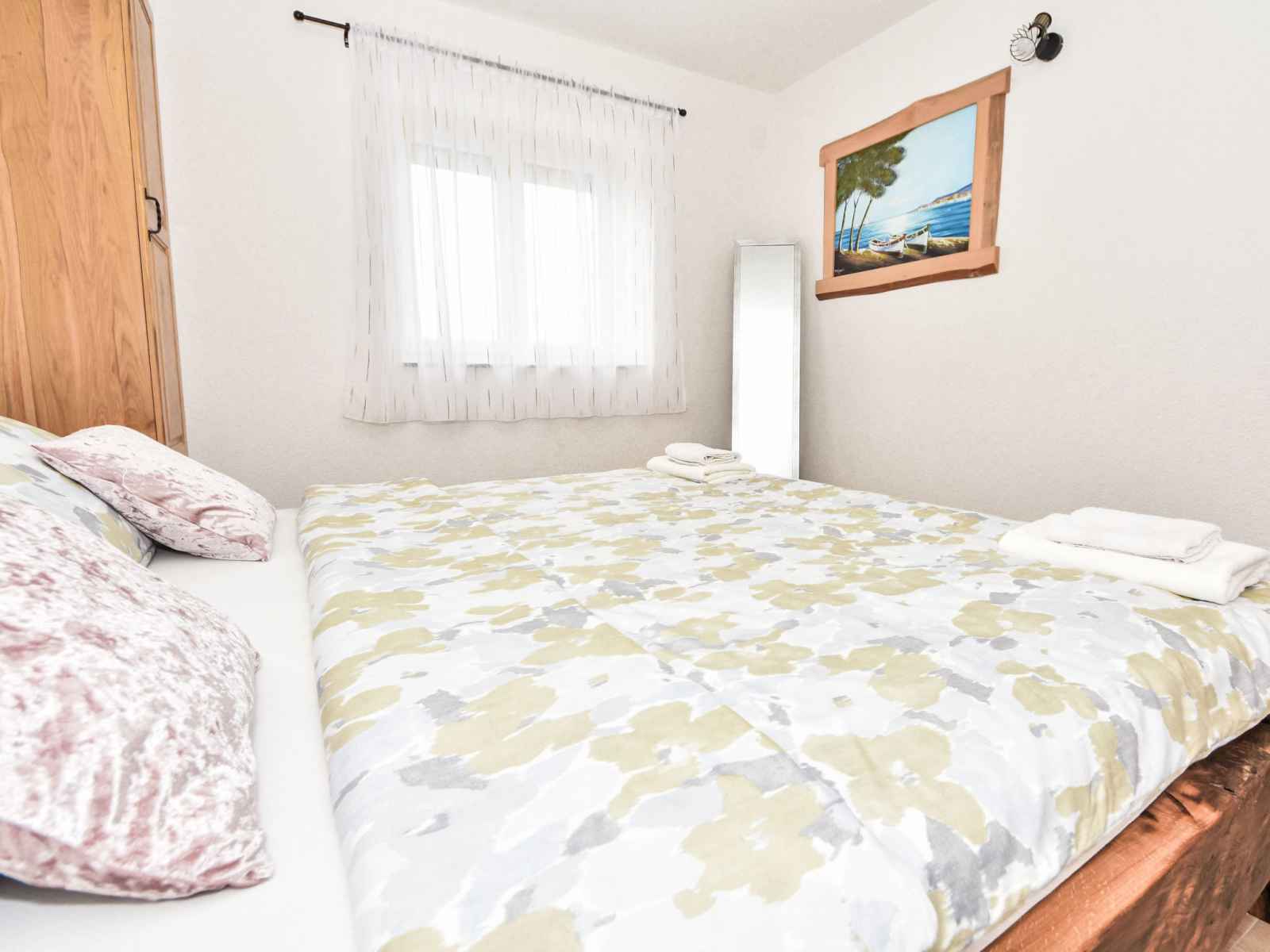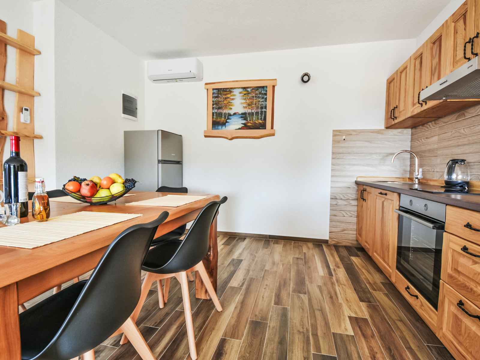 Maison jumelée 3 pièces 100 m2. 1 chambre avec 1 grand-lit (180 cm, longueur 200 cm). 1 chambre avec 2 lits (90 cm, longueur 200 cm). cuisine ouverte (four, 4 plaques vitrocéramiques, congélateur, cafetière électrique) avec air-conditionné. sortie sur la terrasse. bain/bidet/wc. chauffage au bois. terrasse 30 m2, couverte. meubles de