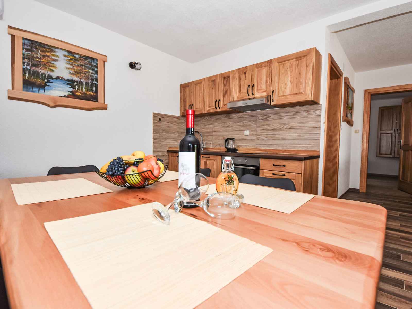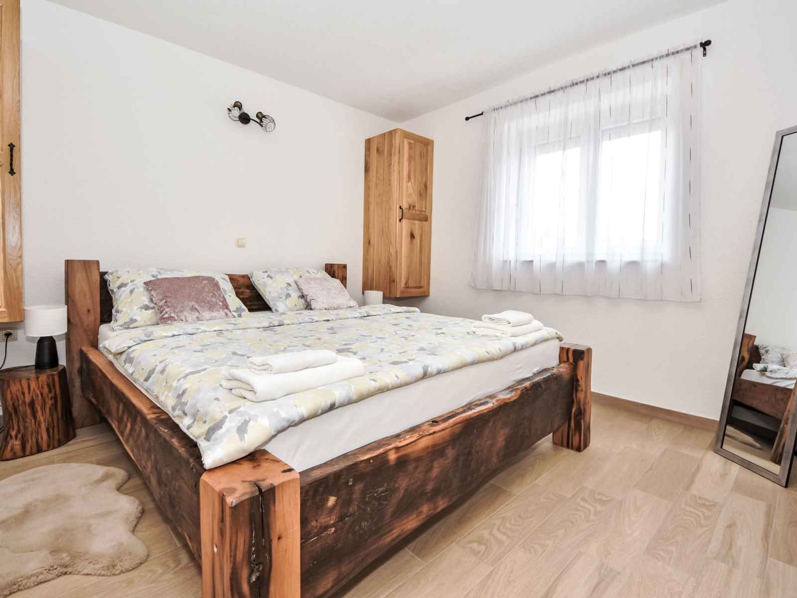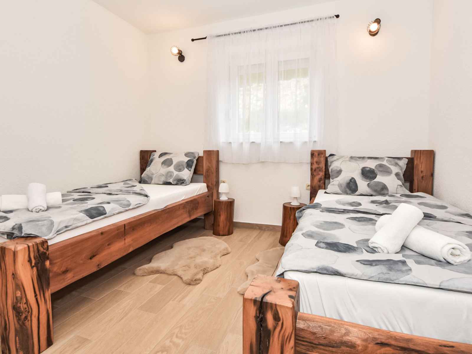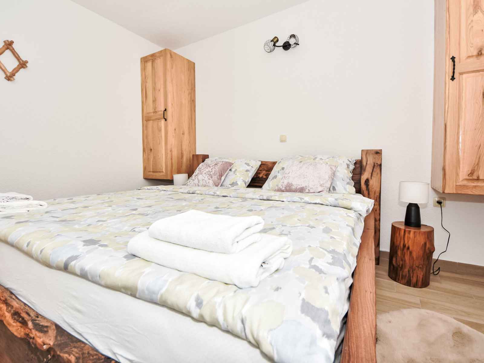 Maison jumelée 3 pièces 100 m2. 1 chambre avec 1 grand-lit (180 cm, longueur 200 cm). 1 chambre avec 2 lits (90 cm, longueur 200 cm). cuisine ouverte (four, 4 plaques vitrocéramiques, congélateur, cafetière électrique) avec air-conditionné. sortie sur la terrasse. bain/bidet/wc. chauffage au bois. terrasse 30 m2, couverte. meubles de