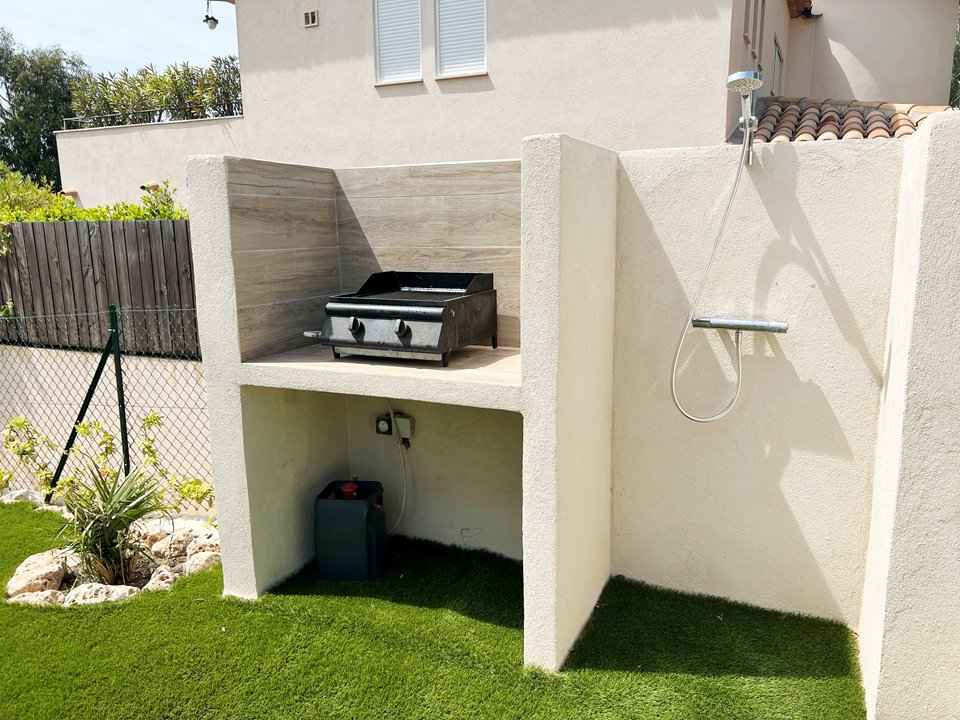Une Plancha , douche extérieure sont à disposition avec un salon de jardin extérieur ainsi que des transats. Parking 1 voiture couvert.