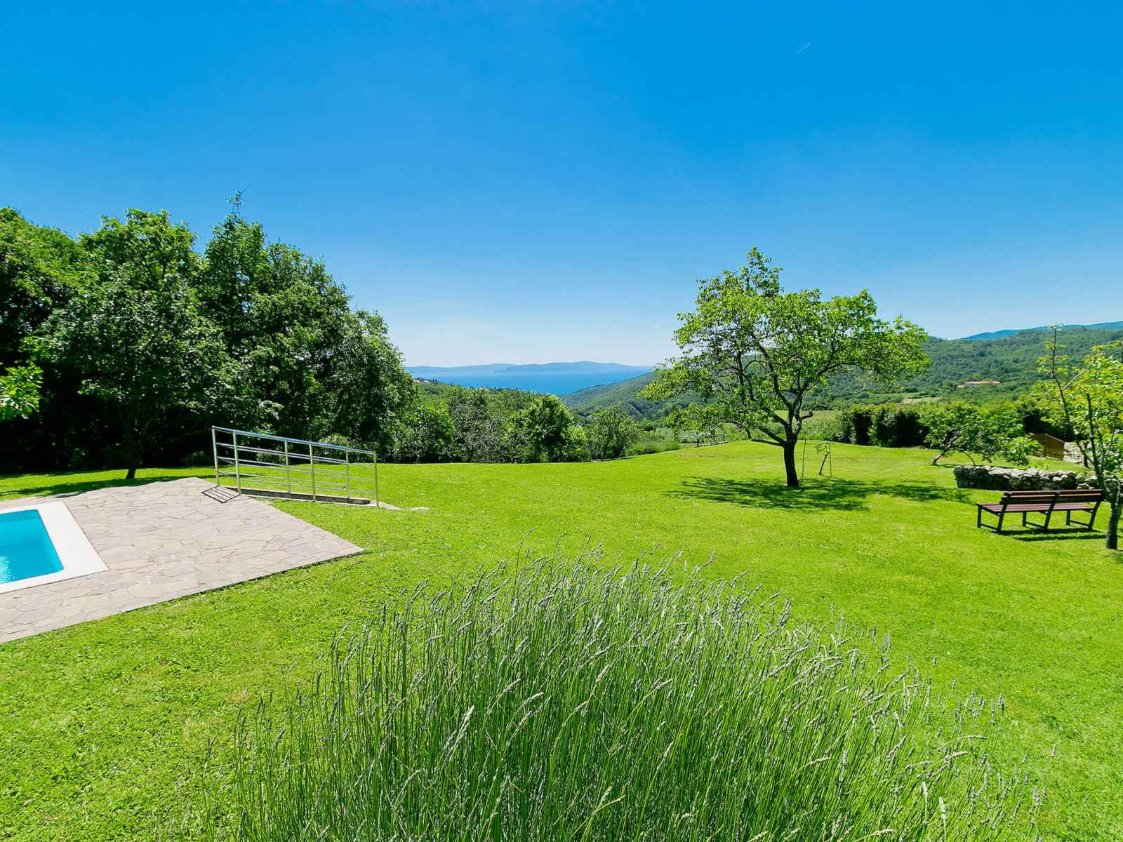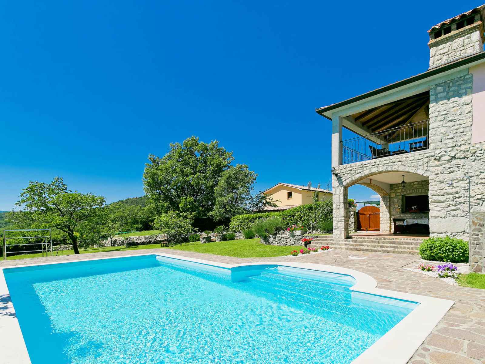 Belle maison individuelle "panorama 2", de 2 étages. dans le quartier de Čekadi, à 700 m du centre de labin, situation tranquille, ensoleillée, surélevée, à 5 km de la mer, dans la verdure. a usage privé: terrain 7'000 m2, beau jardin avec pelouse, piscine rectangulaire (8 x 4 m, profondeur 140 cm, disponibilité saisonnière: 21.mar. -