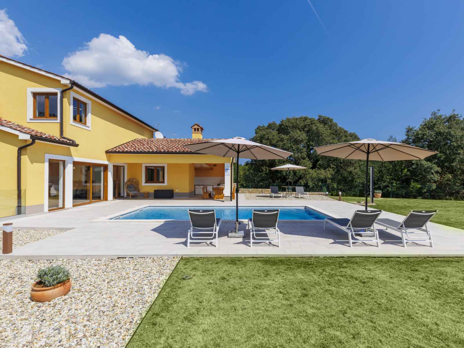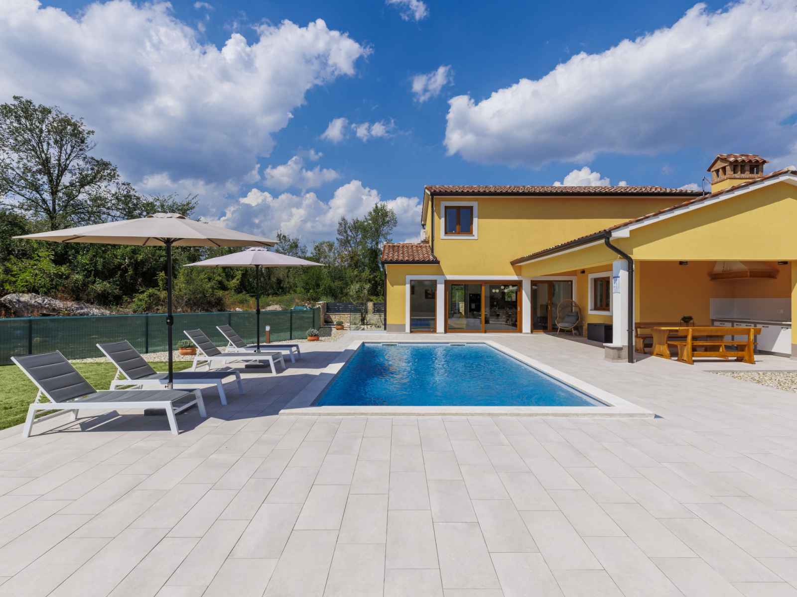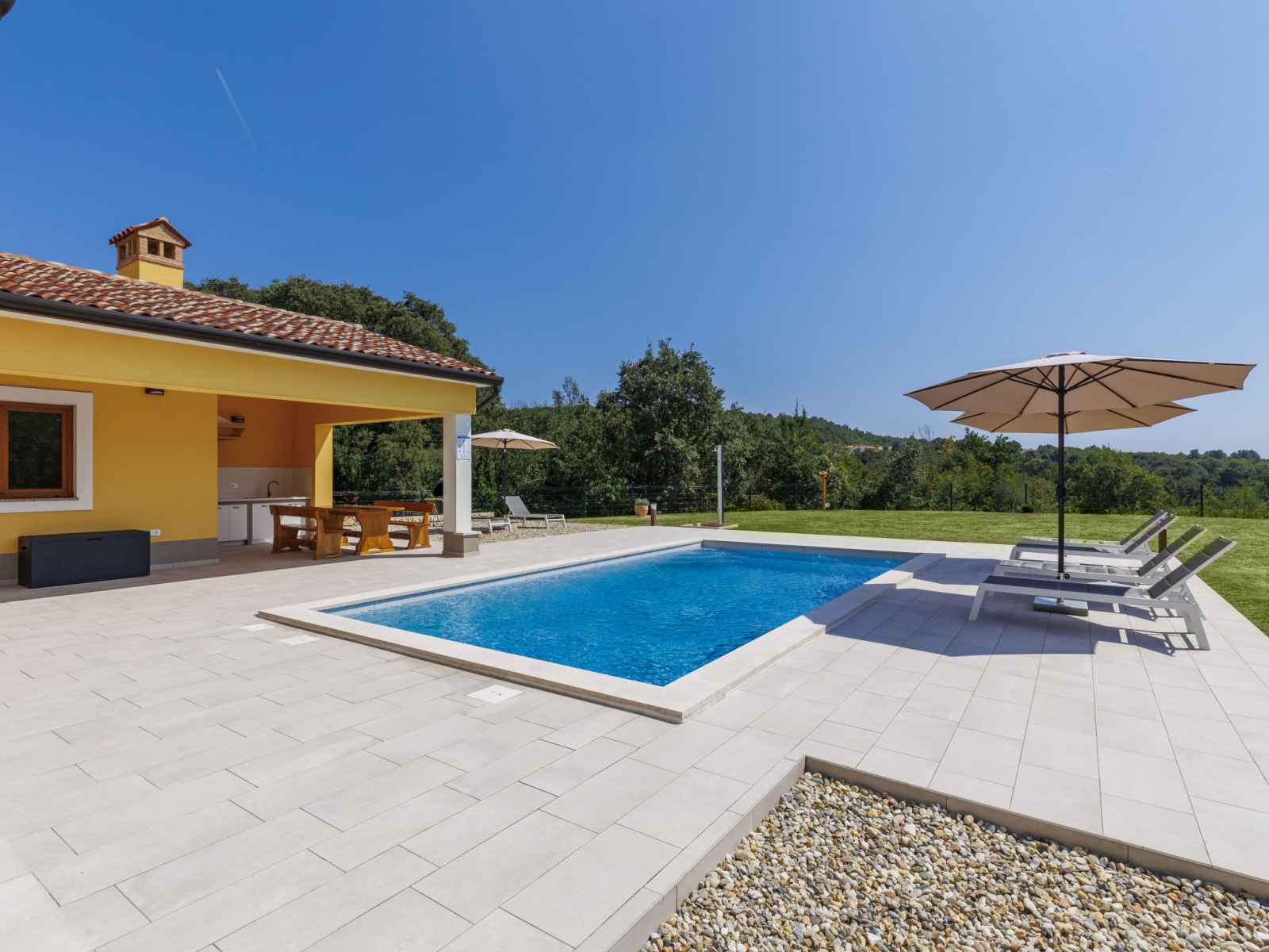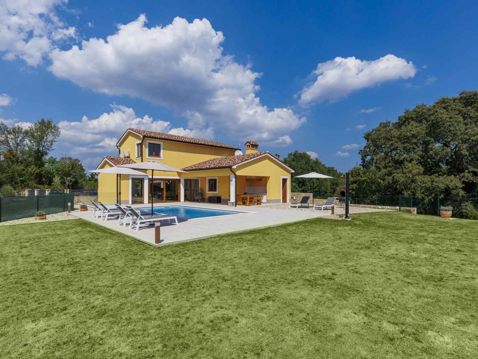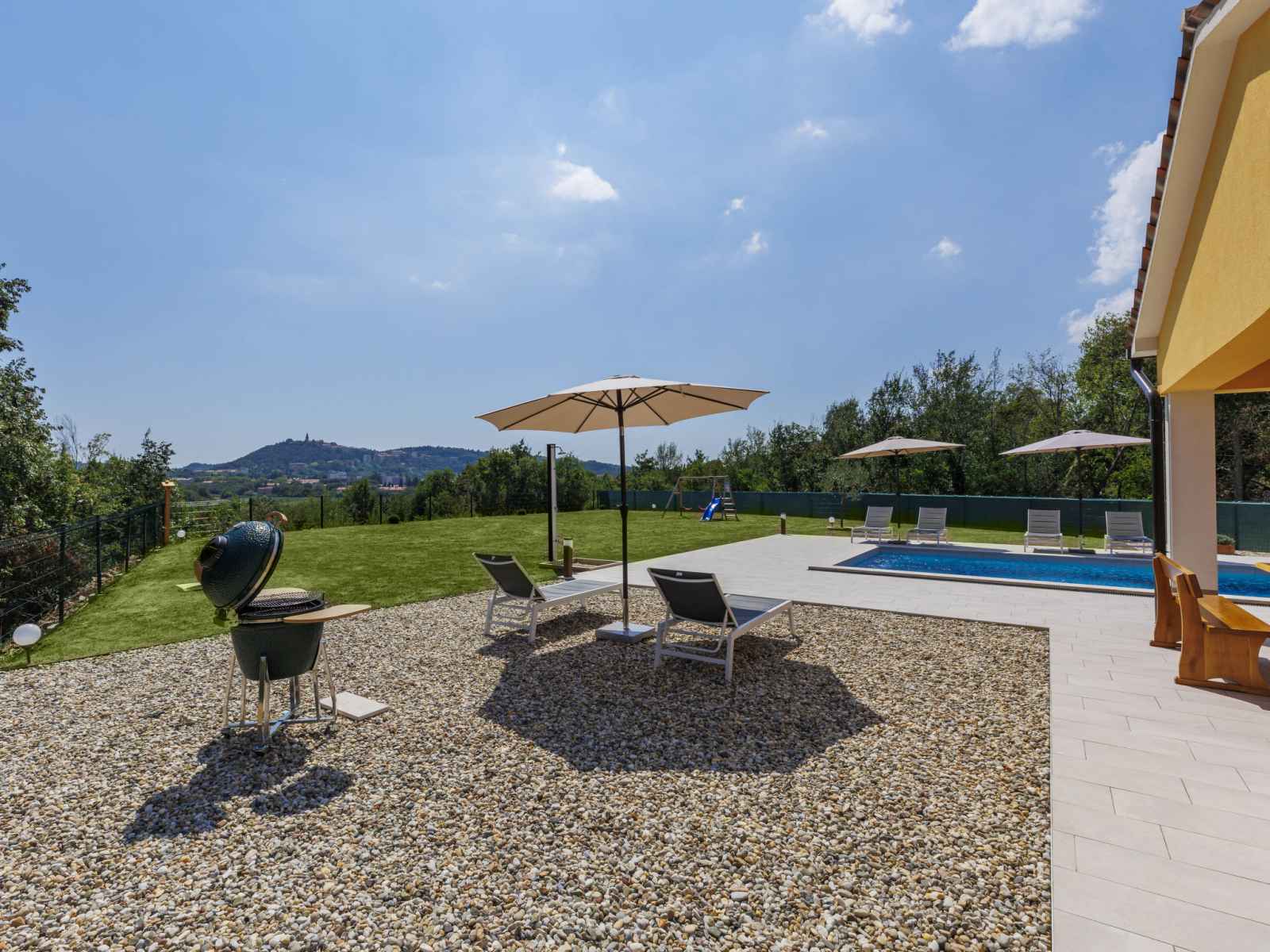 marches intérieures. douche extérieure, terrasse, meubles de jardin, barbecue, espace de jeux pour les enfants (toboggan, balançoire), entretien de la piscine par le propriétaire/jardinier. infrastructures de la maison: accès internet, lave-linge. place de parking (pour 4 voitures) près de la maison sur le terrain. magasins 1 km, supermarché 1 km, restaurant 1 km, arrêt de bus 1.1 km, plage de graviers 5 km. veuillez noter: aéroport 45 km de la maison.