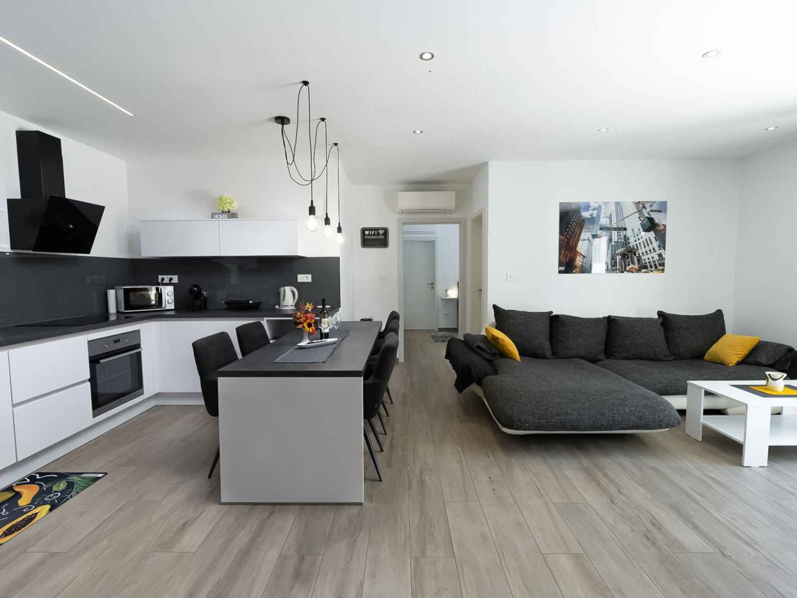 Maison 3 pièces 88 m2. séjour/salle à manger avec tv (satellite) et air-conditionné. sortie sur la terrasse, sur la piscine. 2 chambres, chaque chambre avec: 1 grand-lit (180 cm, longueur 200 cm), douche/wc, tv (satellite) et air-conditionné. sortie sur la terrasse. cuisine ouverte (four, lave-vaisselle, 4 plaques à induction, grille-pain,