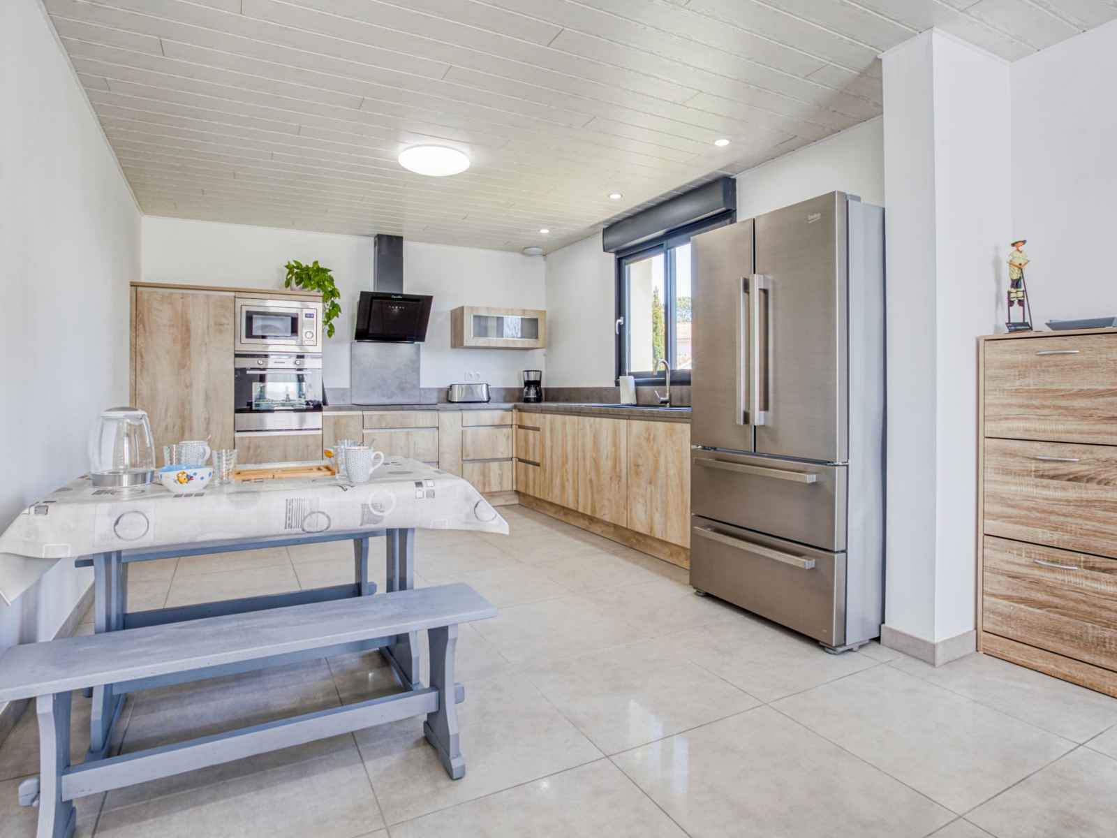 lave-vaisselle, 3 plaques à induction, grille-pain, bouilloire électrique, congélateur, cafetière électrique, Capsules pour machine à café (filtre) (NON INCLUSES)). Douche, WC séparé. Terrasse 20 m2. Meubles de terrasse, barbecue. A disposition: lave-linge, fer à repasser. Internet (Connexion WIFI, gratuit). Veuillez noter: logement non-fumeur. Maximum 1 animal/ chien de petite taille autorisé. Détecteur de fumée.