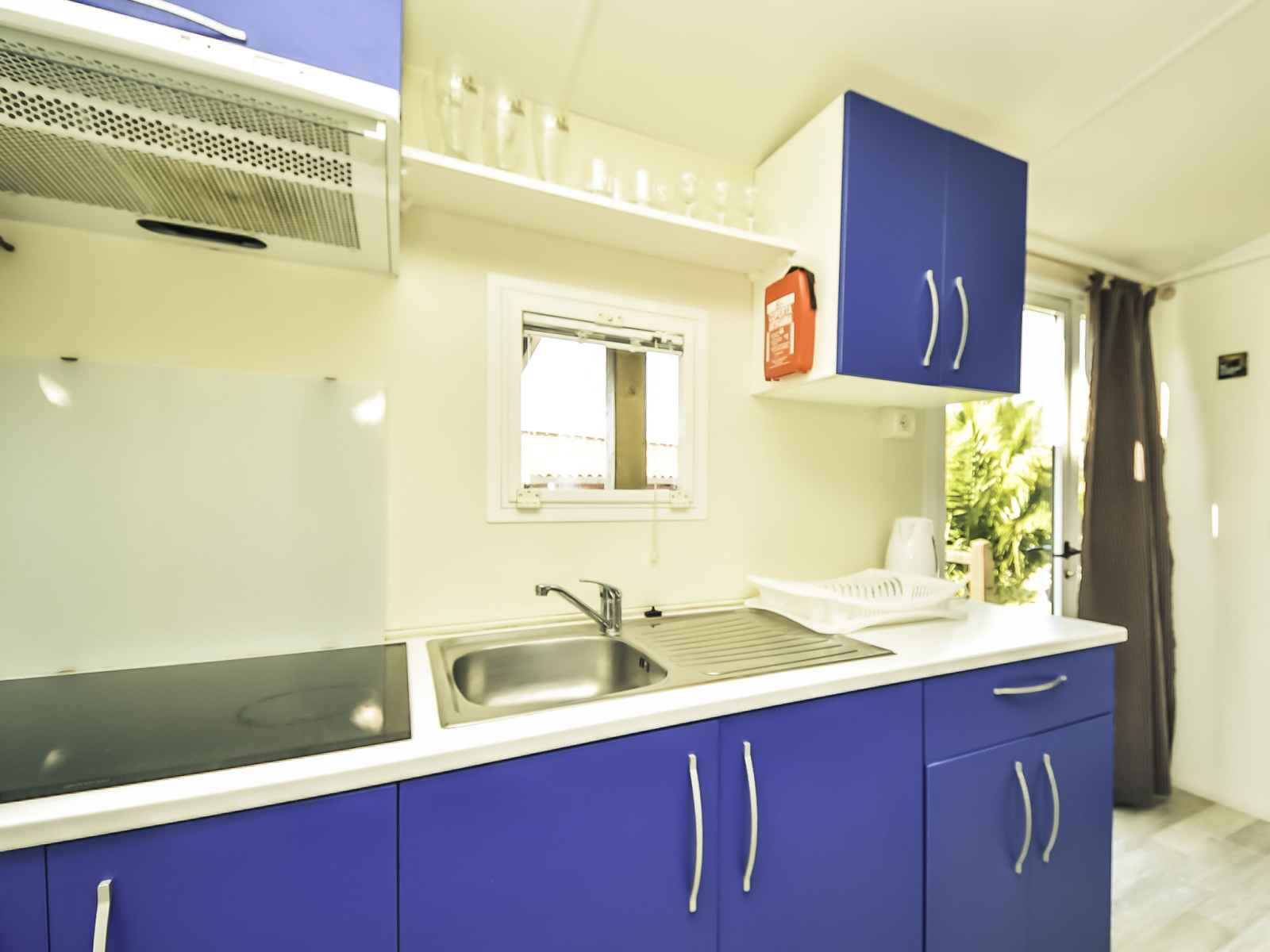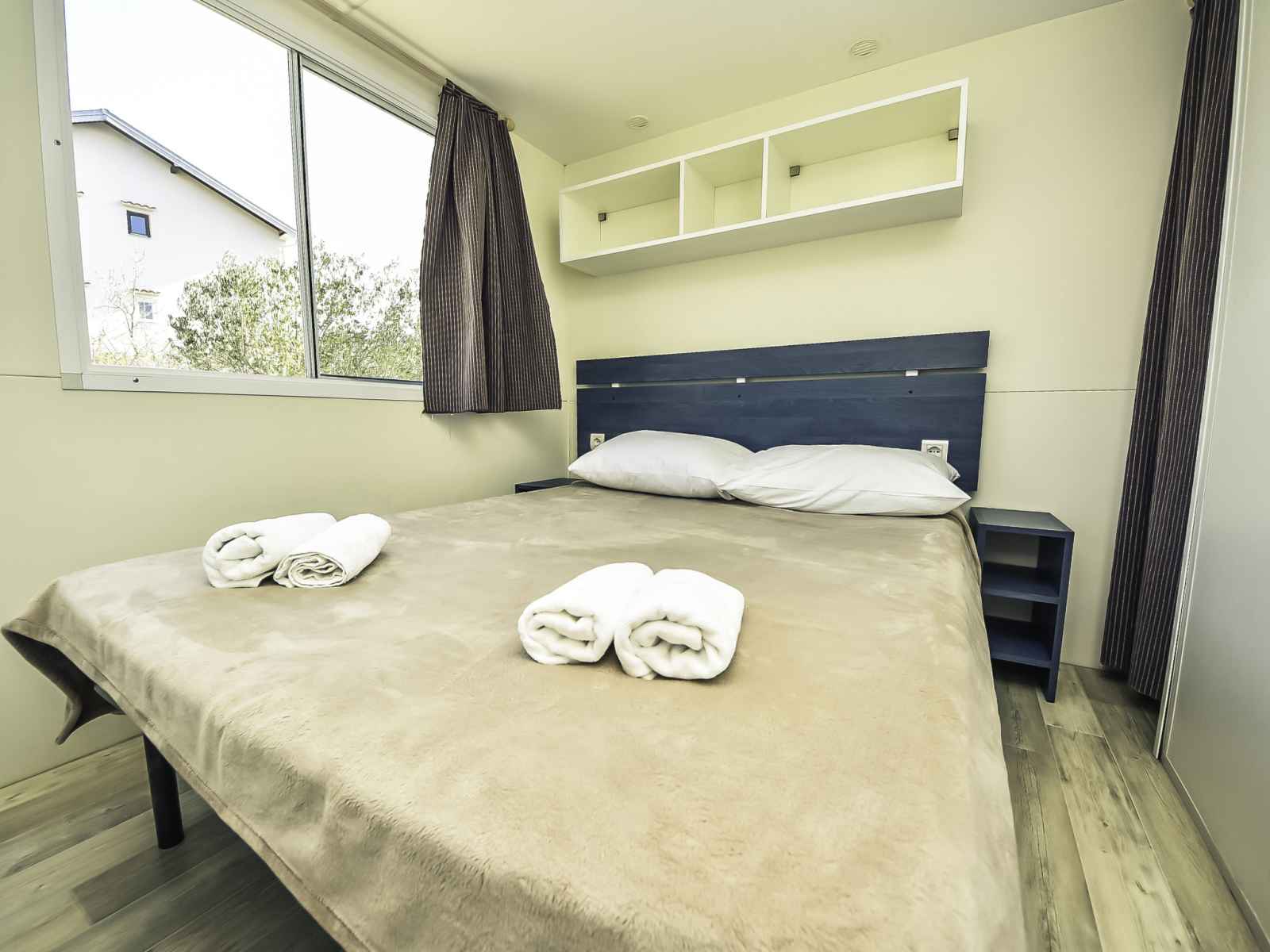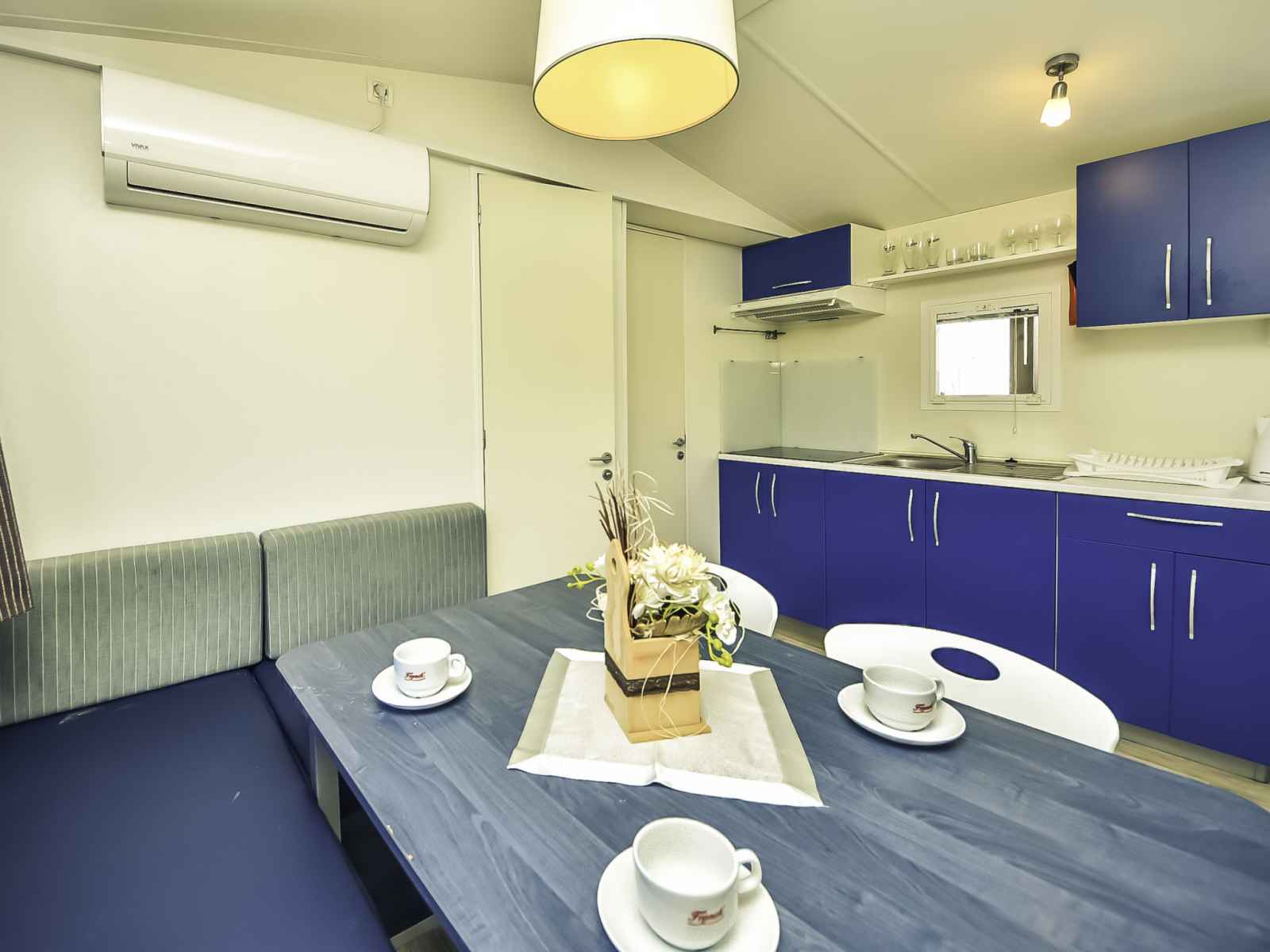 4 pièces mobil home 32 m2, situation ouest. séjour/salle à manger avec tv (satellite) (écran plat), air-conditionné. sortie sur la terrasse. 1 chambre avec 1 grand-lit (140 cm, longueur 190 cm). 2 chambres, chaque chambre avec: 2 lits (70 cm, longueur 190 cm). cuisine ouverte (4 plaques de cuisson, congélateur). douche/wc. pas de chauffage.