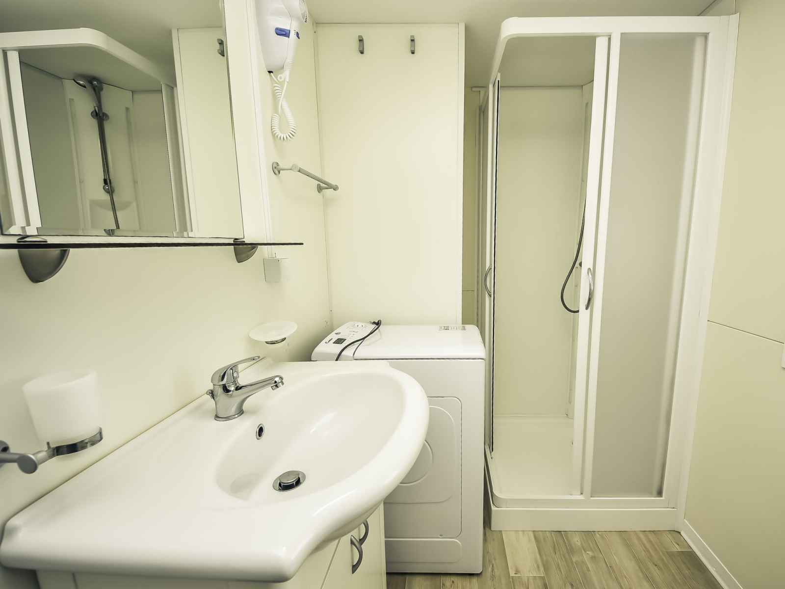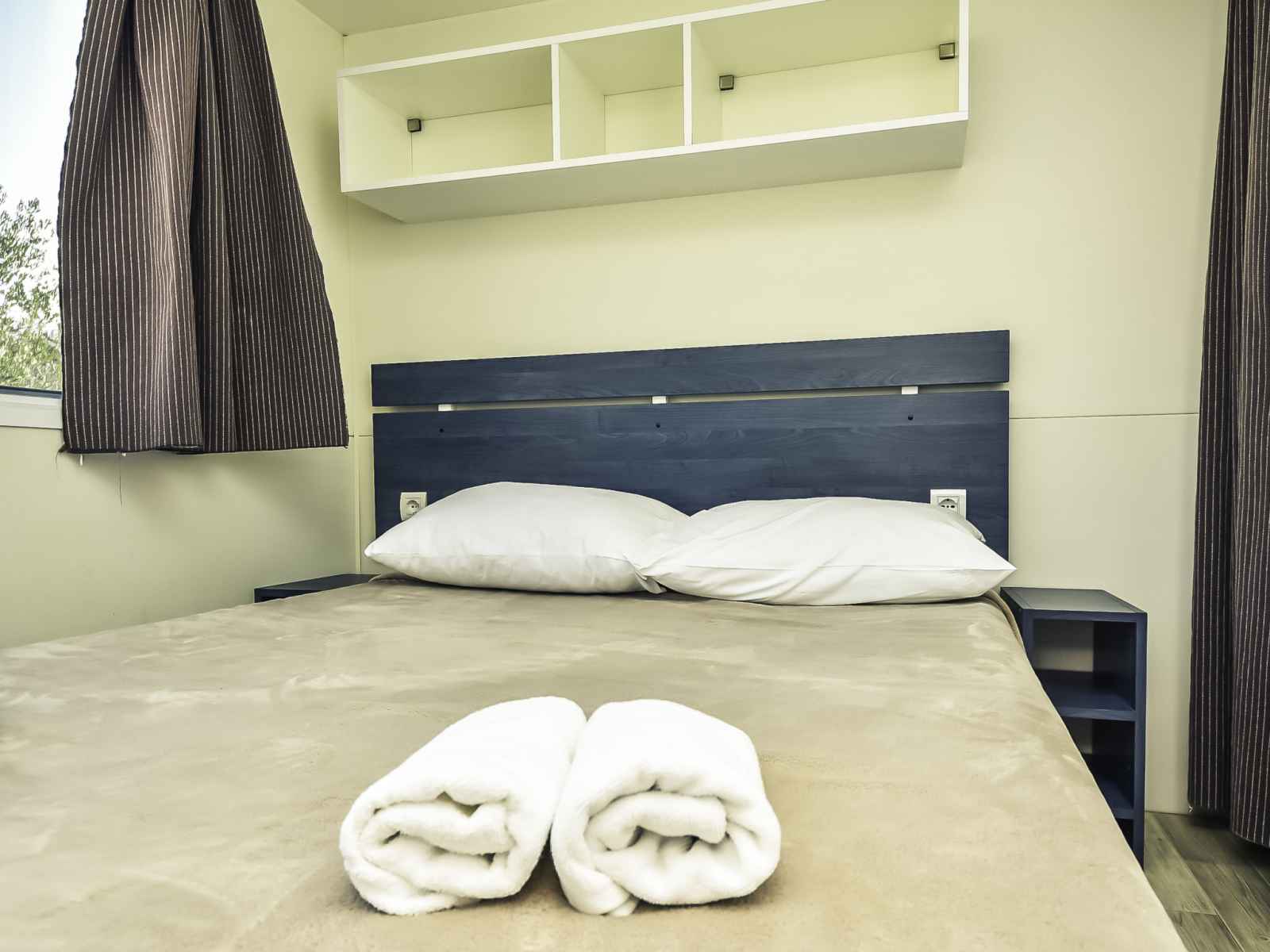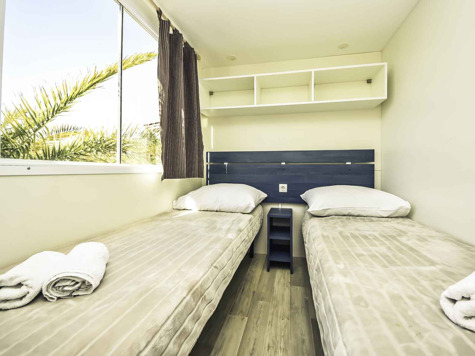 4 pièces mobil home 32 m2, situation ouest. séjour/salle à manger avec tv (satellite) (écran plat), air-conditionné. sortie sur la terrasse. 1 chambre avec 1 grand-lit (140 cm, longueur 190 cm). 2 chambres, chaque chambre avec: 2 lits (70 cm, longueur 190 cm). cuisine ouverte (4 plaques de cuisson, congélateur). douche/wc. pas de chauffage.