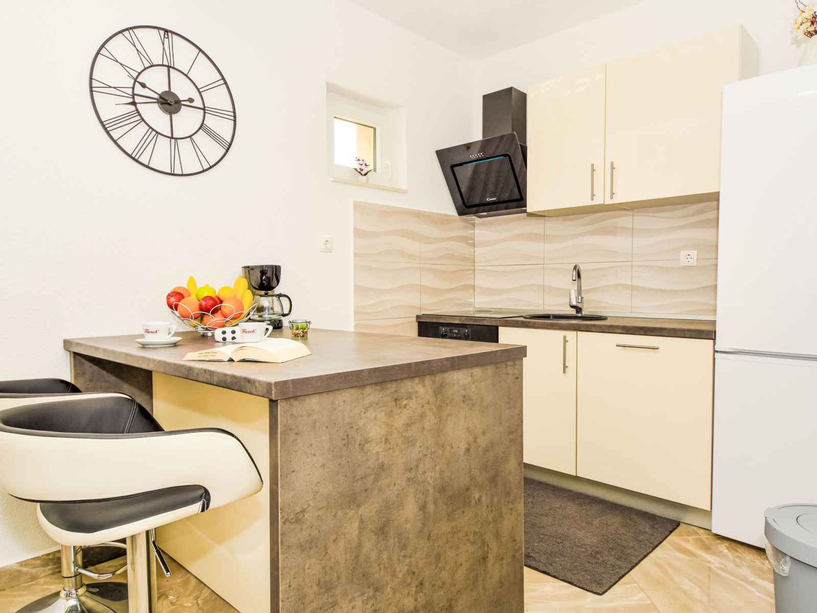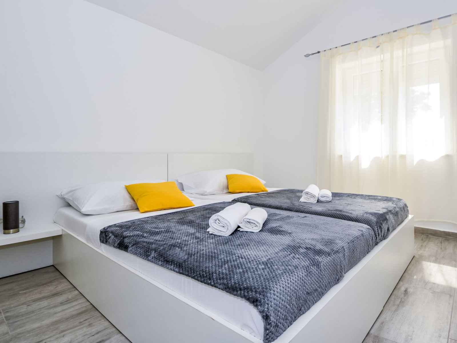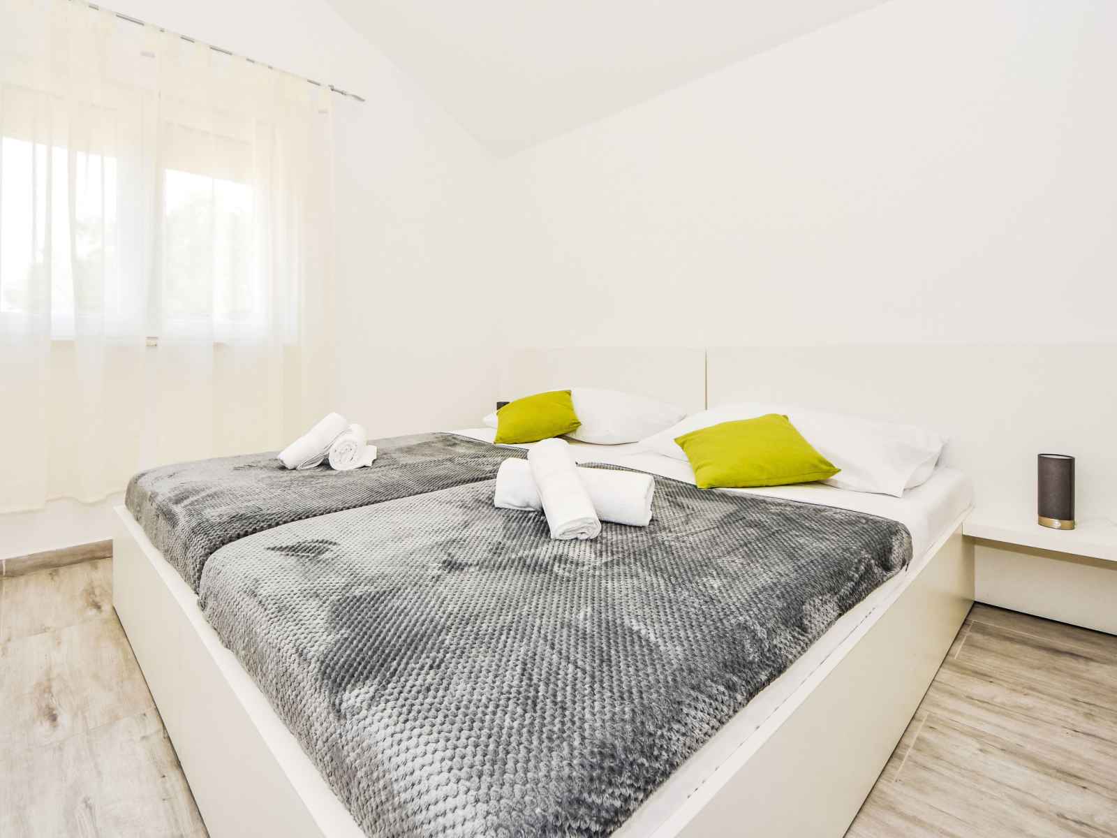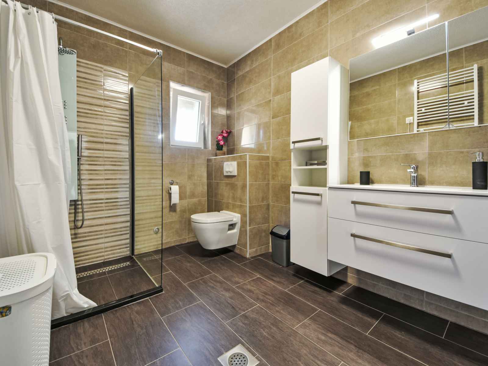 terrasse, sur la piscine. Douche/WC. À l'étage supérieur: (escalier extérieur) entrée avec air-conditionné. 1 chambre, mansardée hauteur plafond 110 - 220 cm avec 2 lits (90 cm, longueur 200 cm), ventilateur. 1 chambre, mansardée hauteur plafond 110 - 202 cm avec 1 grand-lit (180 cm, longueur 200 cm), ventilateur. Douche/WC. Terrasse 30 m2. Meubles de terrasse, chaises longues. Vue sur la piscine. A disposition: coffre-fort, fer à repasser, sèche-cheveux. Internet (Connexion WIFI, gratuit).