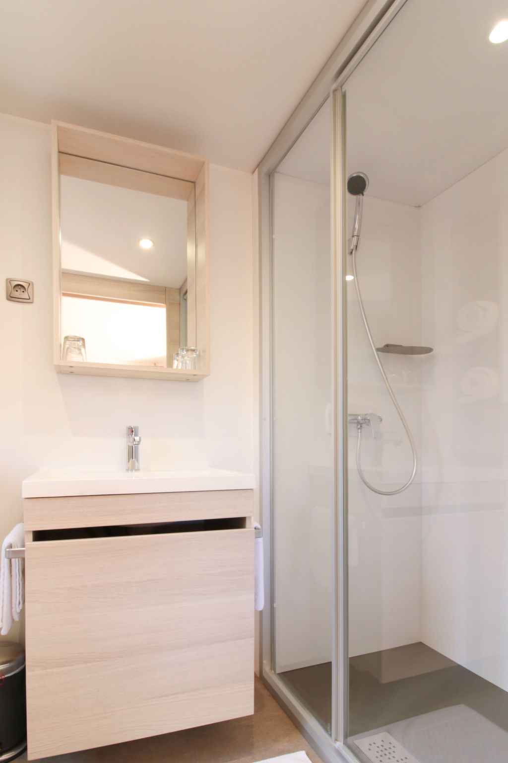 longueur 190 cm). 1 chambre d'enfants avec 1 x 2 lits superposés (80 cm, longueur 190 cm). Petite cuisine ouverte (lave-vaisselle, 4 plaques vitrocéramiques, grille-pain, bouilloire électrique, micro-ondes, congélateur, cafetière électrique) avec bar. Douche, WC séparé. Chauffage électrique, air-conditionné. Terrasse 18 m2 partiellement couverte. Meubles de terrasse, barbecue électrique, chaises longues (2). A disposition: chaise haute pour enfant, lit bébé (en sus). Internet (Connexion WIFI, gratuit). Veuillez noter: adapté(e) aux familles. Logement non-fumeur. Maximum 1 animal/ chien autorisé. Détecteur de fumée.