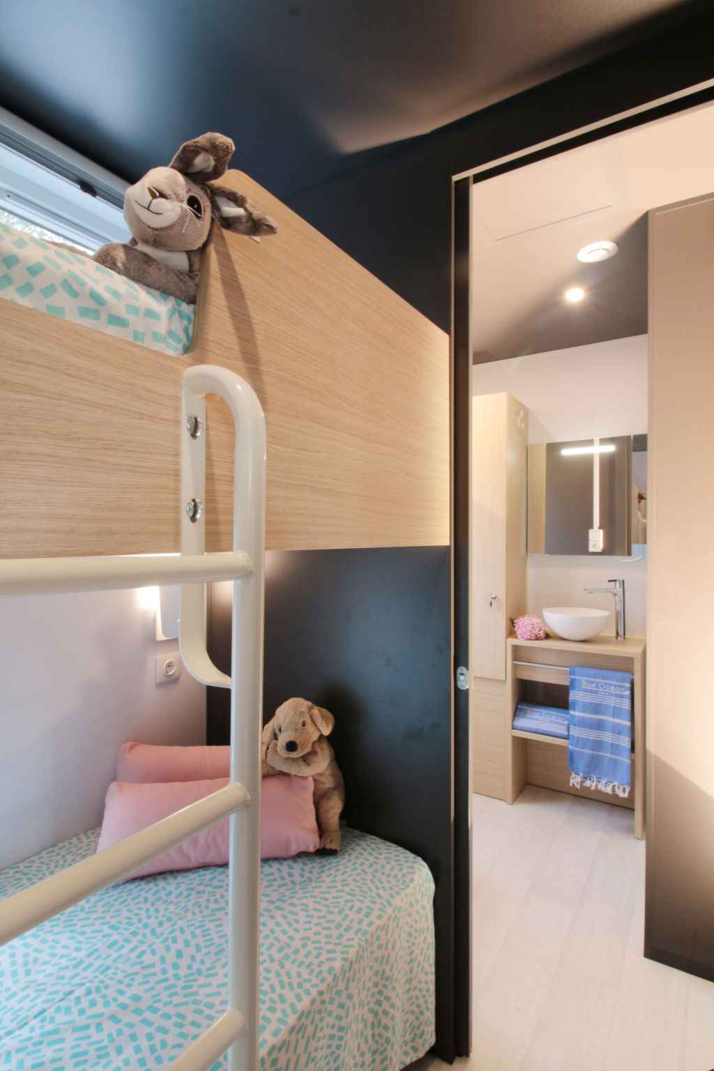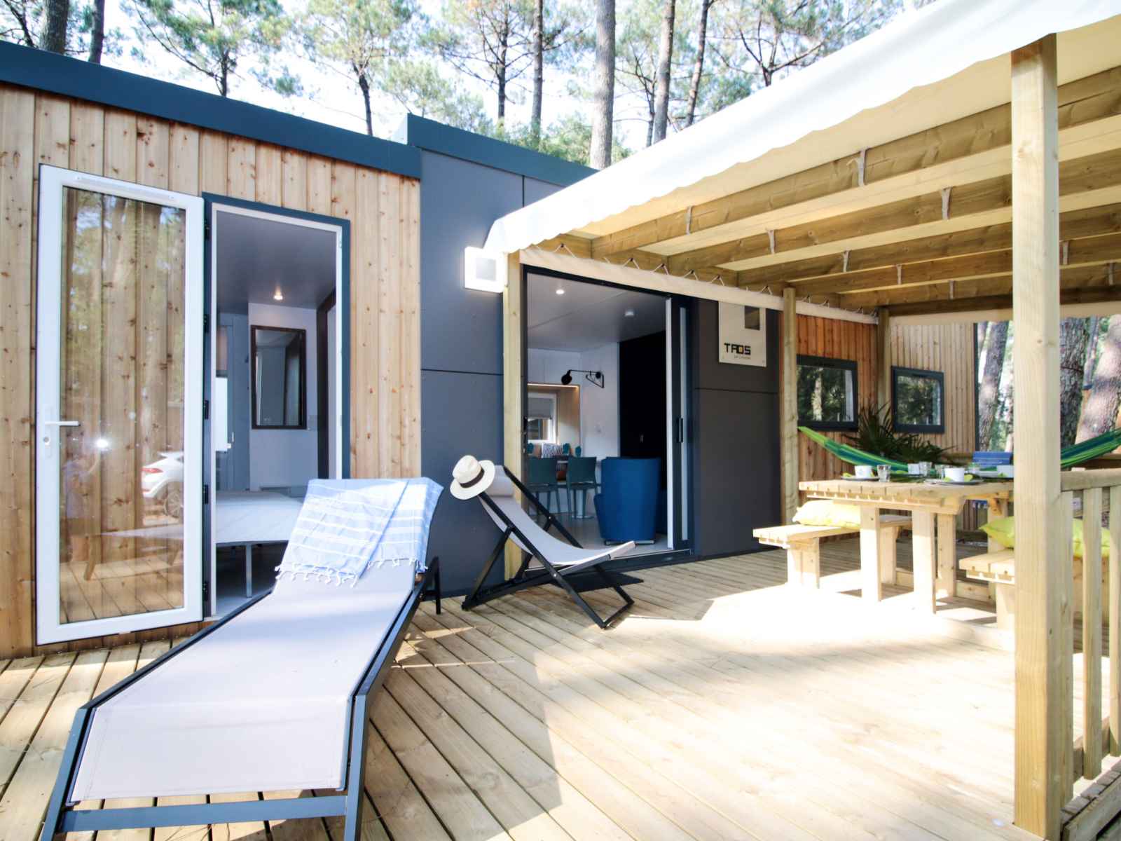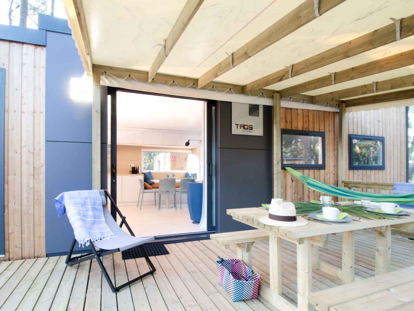 "premium taos", bungalow 4 pièces 40 m2. logement idéal pour 4 adultes + 2 enfants. clair, aménagement agréable et plaisant: séjour/salle à manger avec table pour les repas et tv (écran plat). sortie sur la terrasse. 1 chambre avec 1 grand-lit (160 cm, longueur 200 cm), douche/wc. sortie sur la terrasse. 1 chambre avec 2 lits (80 cm,