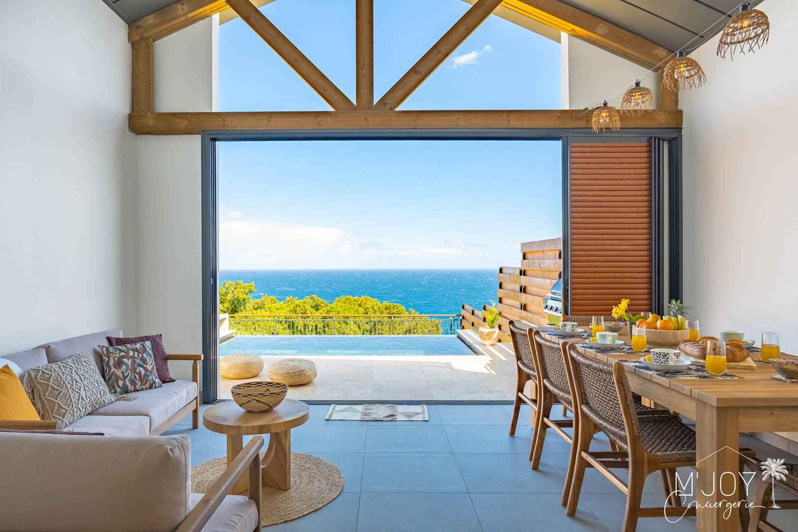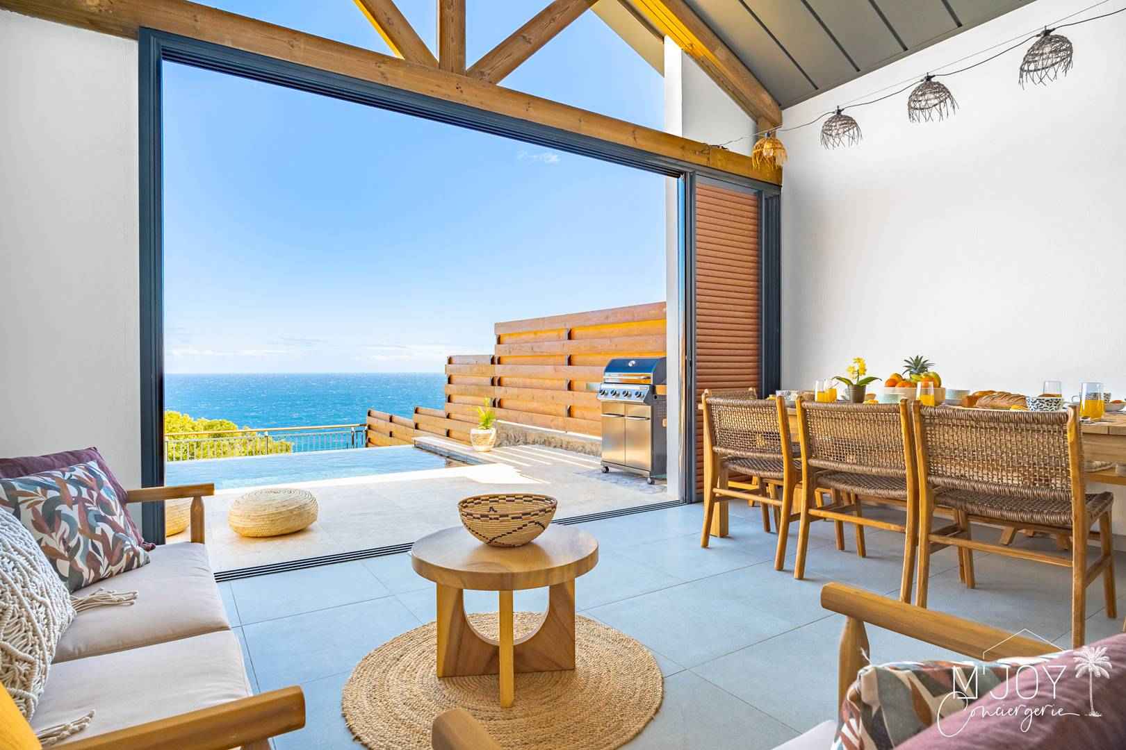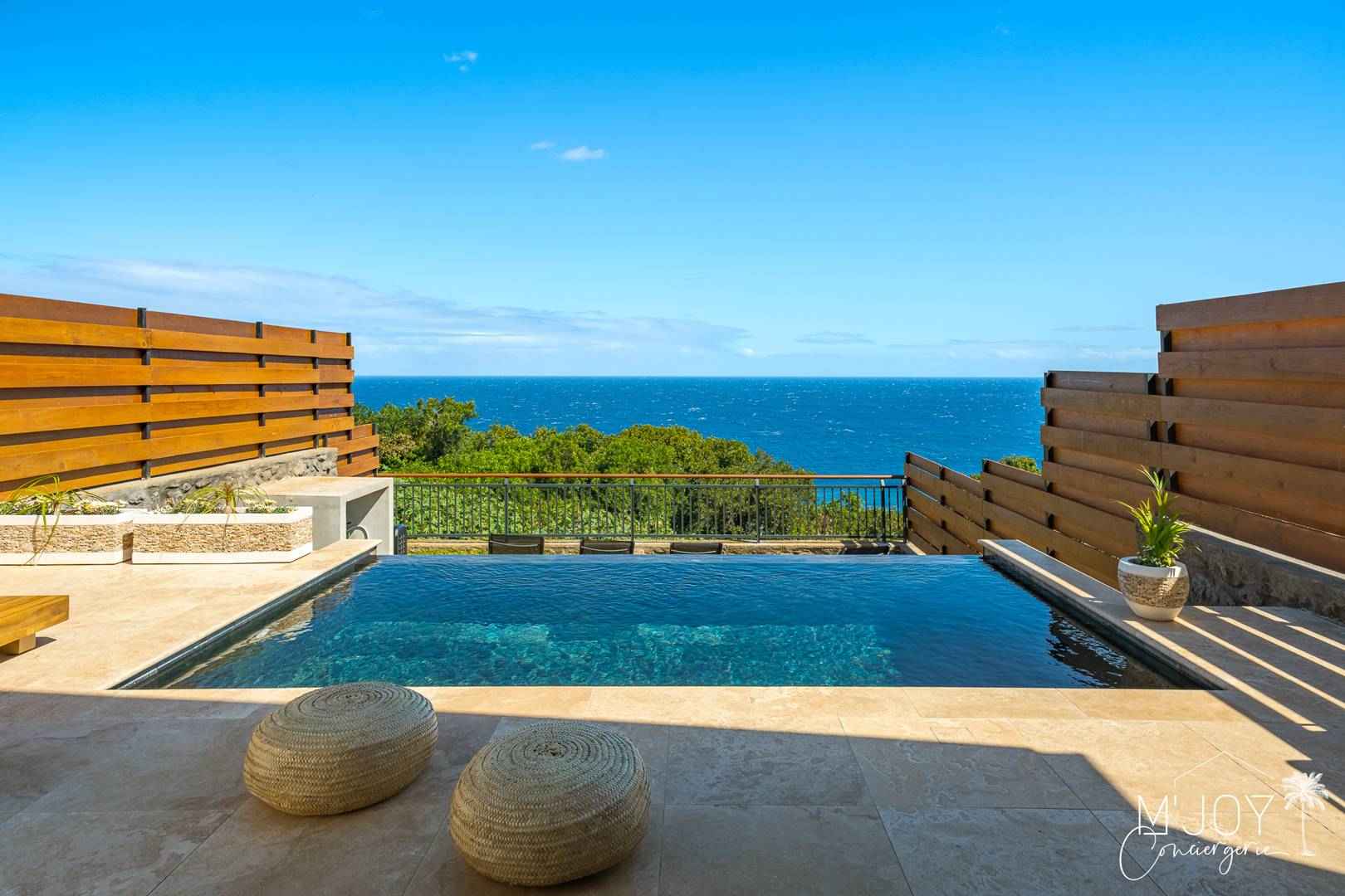 Depuis la terrasse, le bleu s’étend à perte de vue ! De la piscine à débordement jusqu’à l’océan, une impression d’infini invite à la sérénité et à l’évasion.