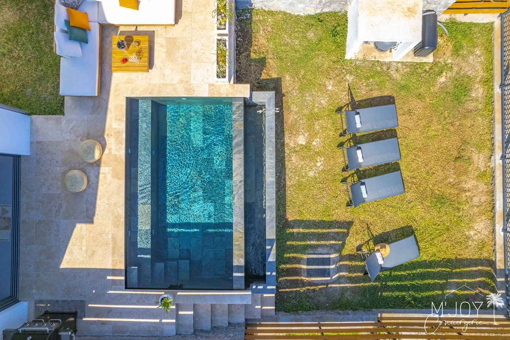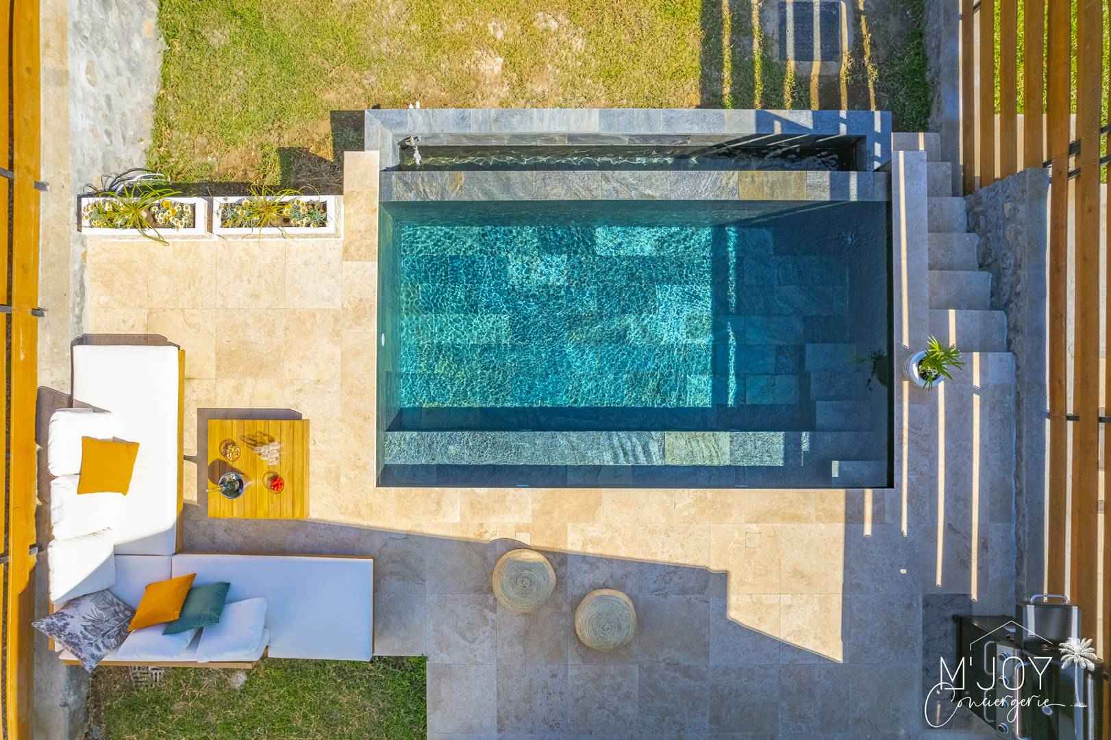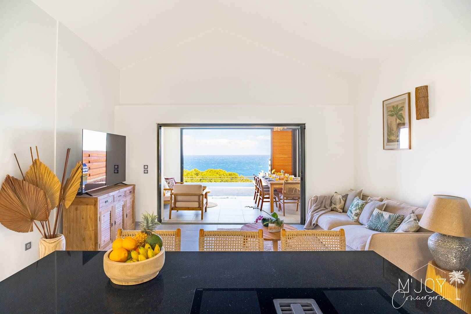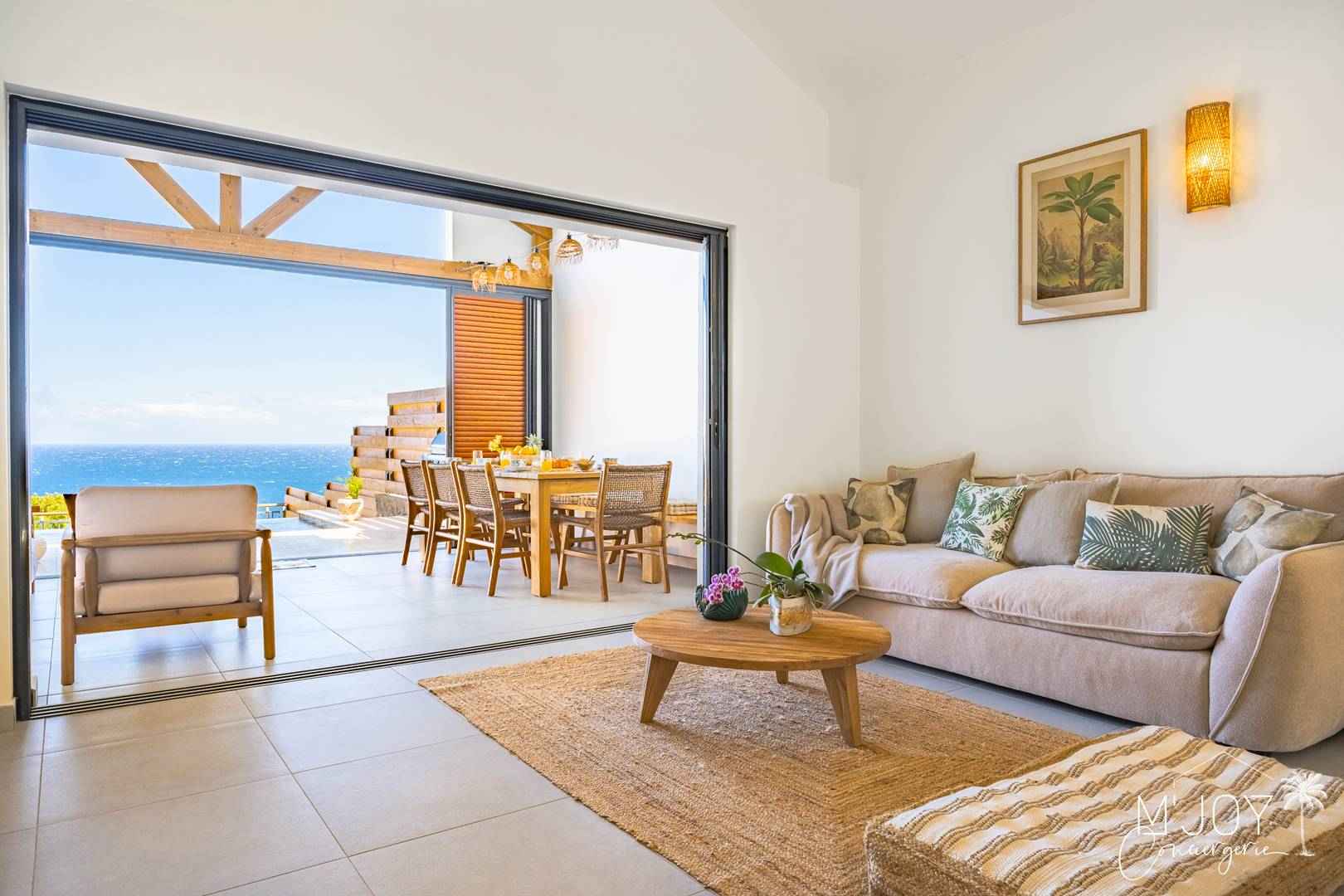 Depuis la terrasse, le bleu s’étend à perte de vue ! De la piscine à débordement jusqu’à l’océan, une impression d’infini invite à la sérénité et à l’évasion.