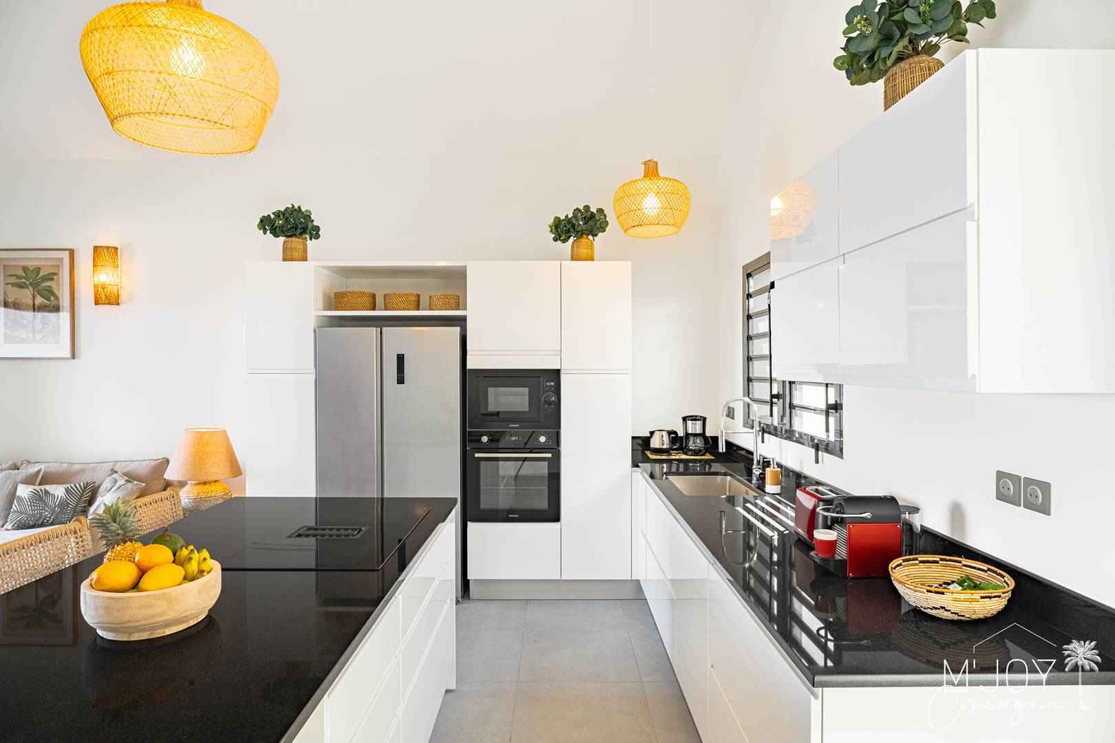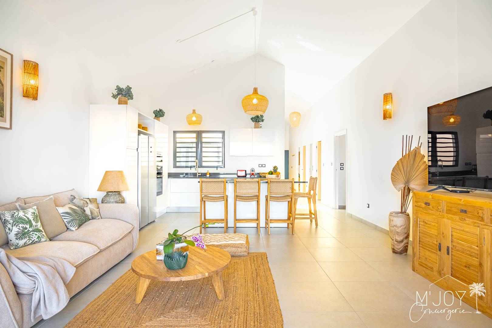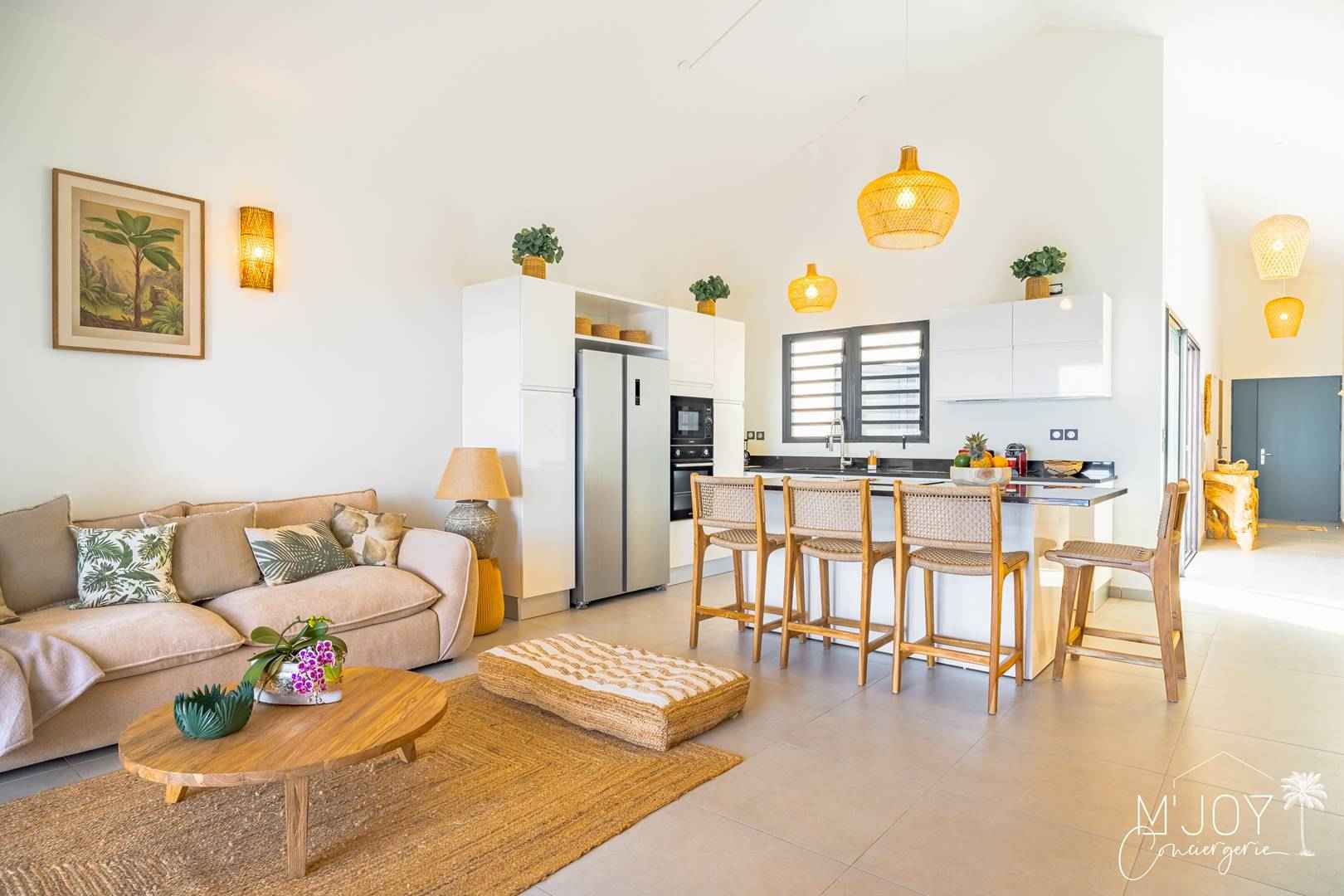 Enfin, l’espace de vie lumineux dessert un grand salon avec brasseur d'air et canapé confortable et télévision XXL (Netflix) et une cuisine entièrement équipée avec ilot central et de nombreux rangements.