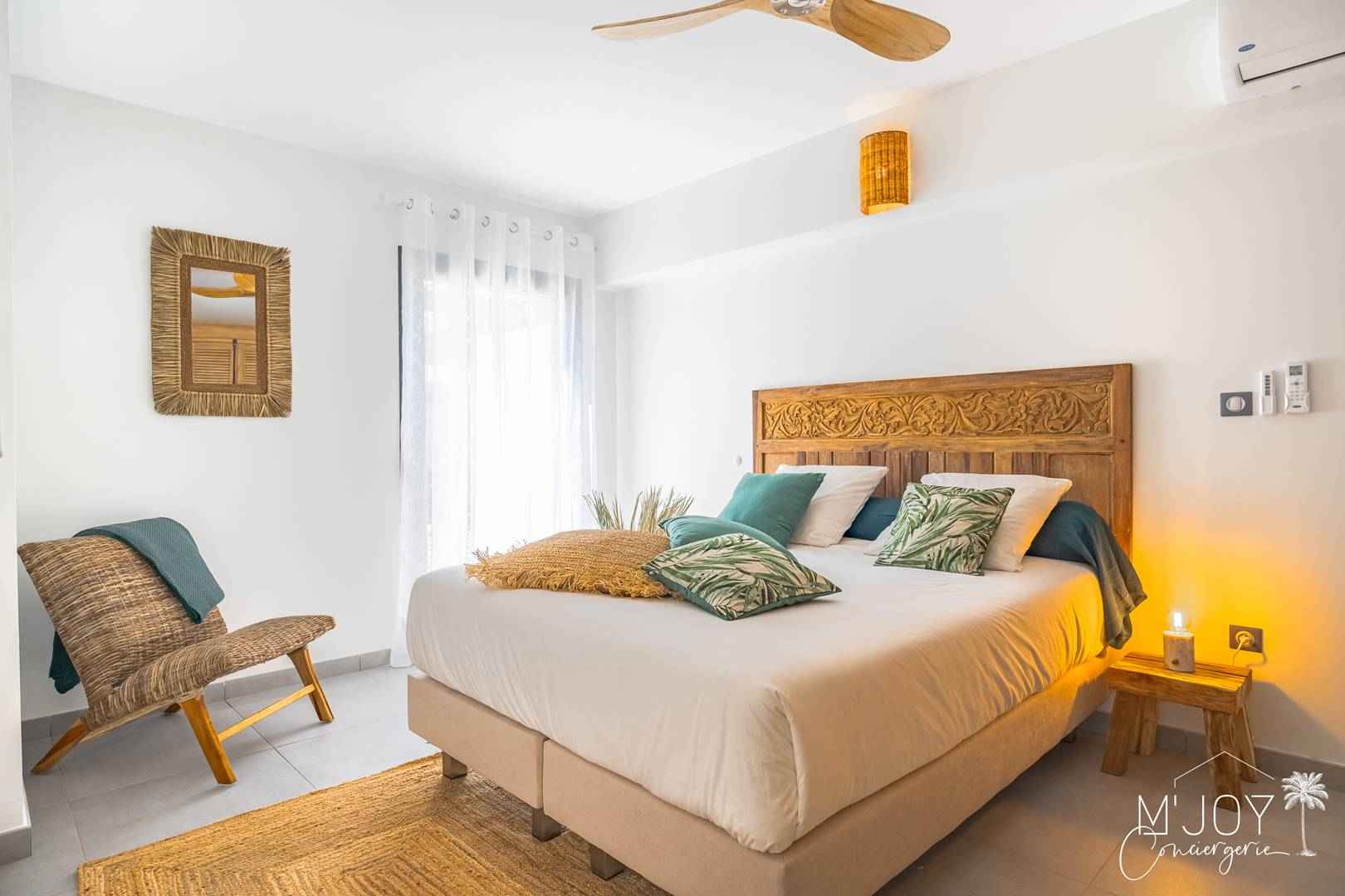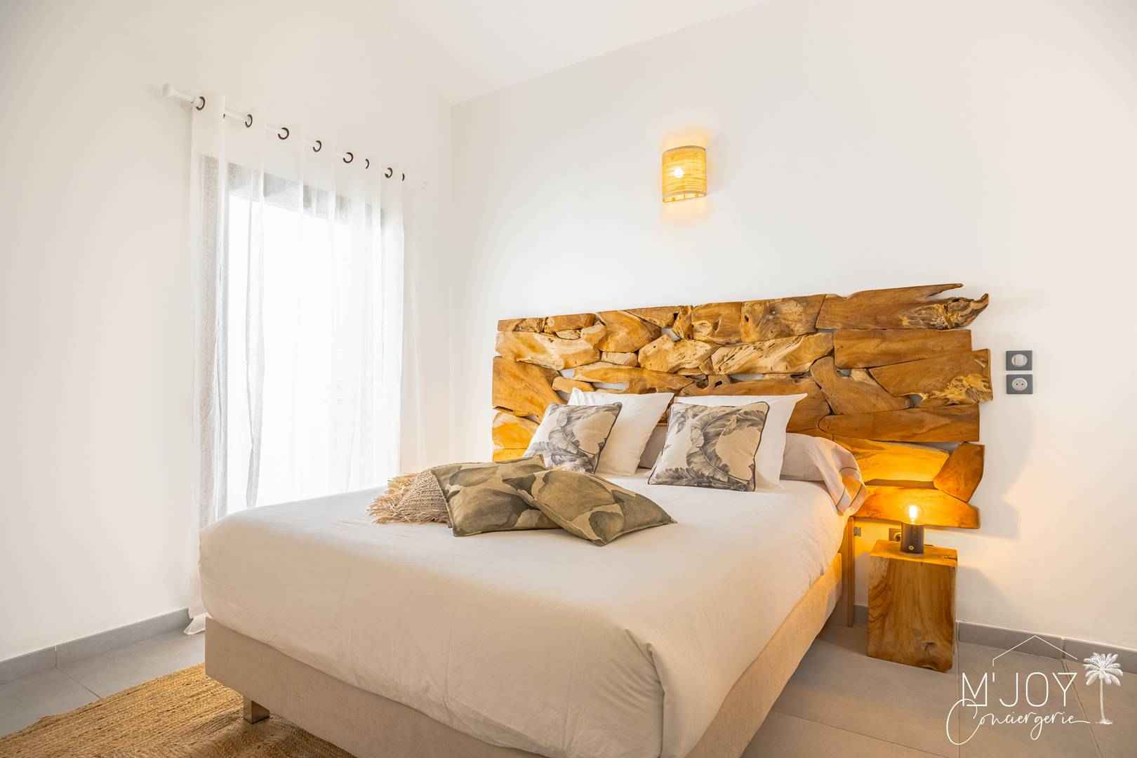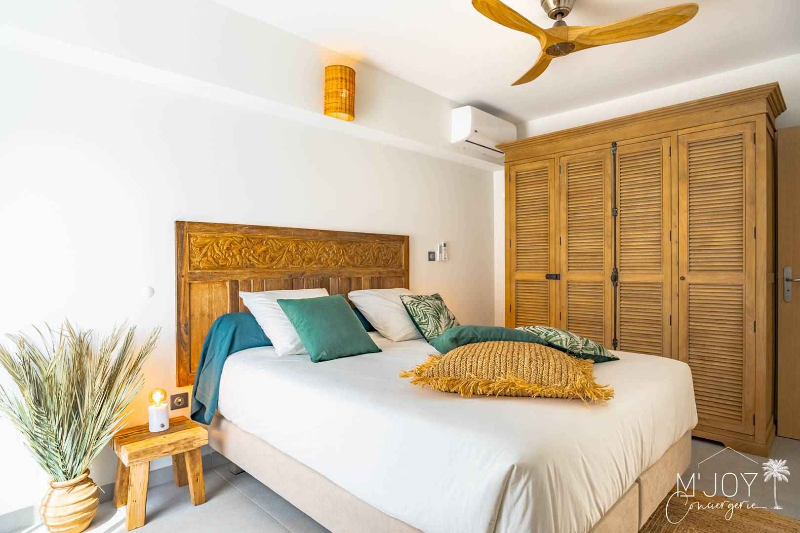- Chambre 1 (Chambre grande anse : lit double en 160x200cm, avec accès au jardin et vue mer et piscine)