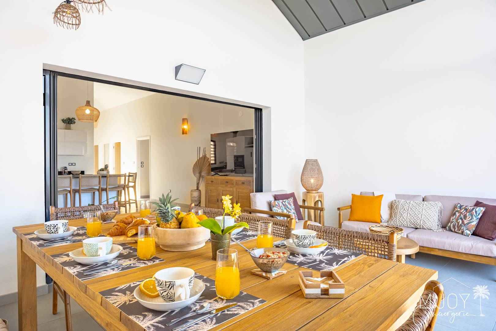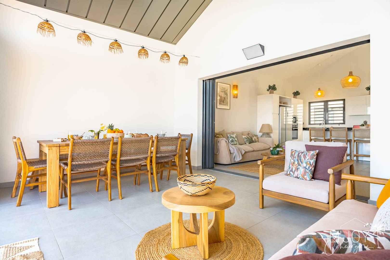La varangue quant à elle accueille une grande table à manger et un salon intermédiaire idéal pour se détendre tout en profitant de l’ombre et de la vue mer.