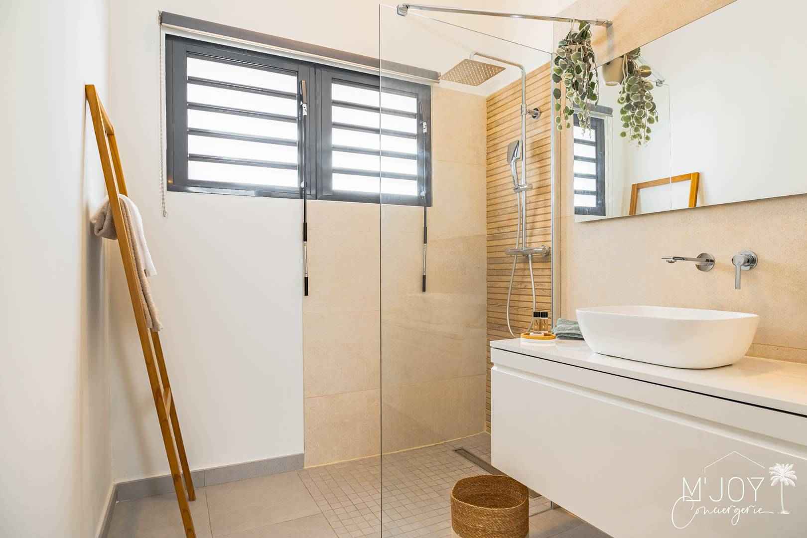 Une troisième grande chambre appelée Grande Anse, en référence à la superbe plage en contrebas de la villa, dispose d’un lit en 160x200cm et donne accès au jardin et à la piscine.