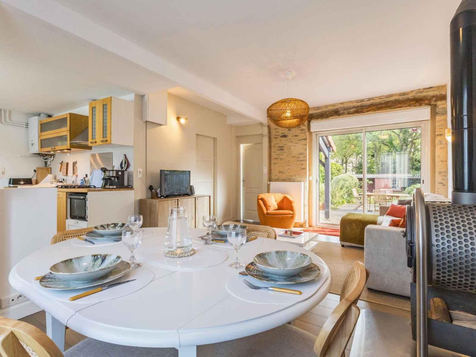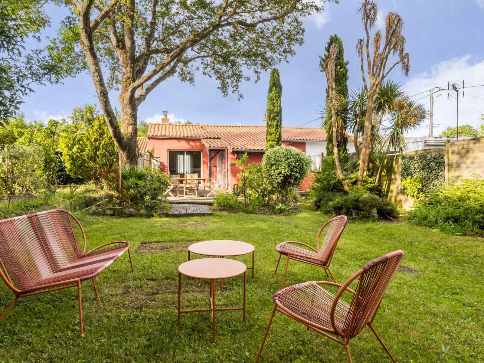clos arboré et fleuri de 230 m². Plain pied: cuisine aménagée ouverte sur salon/séjour, 3 chambres (1: lit 140x190, 2 : lit 90x190, 3 : lits gigognes 90x190), salle d'eau et WC indépendant. Equipements compris inclus: wifi, radio/CD/enceinte Bluetooth, lit/réhausseur bébé et 2 vélos adultes. Compris: électricité, chauffage gaz, draps et linge de toilette. Non compris: forfait ménage obligatoire (80€) et taxe de séjour.
