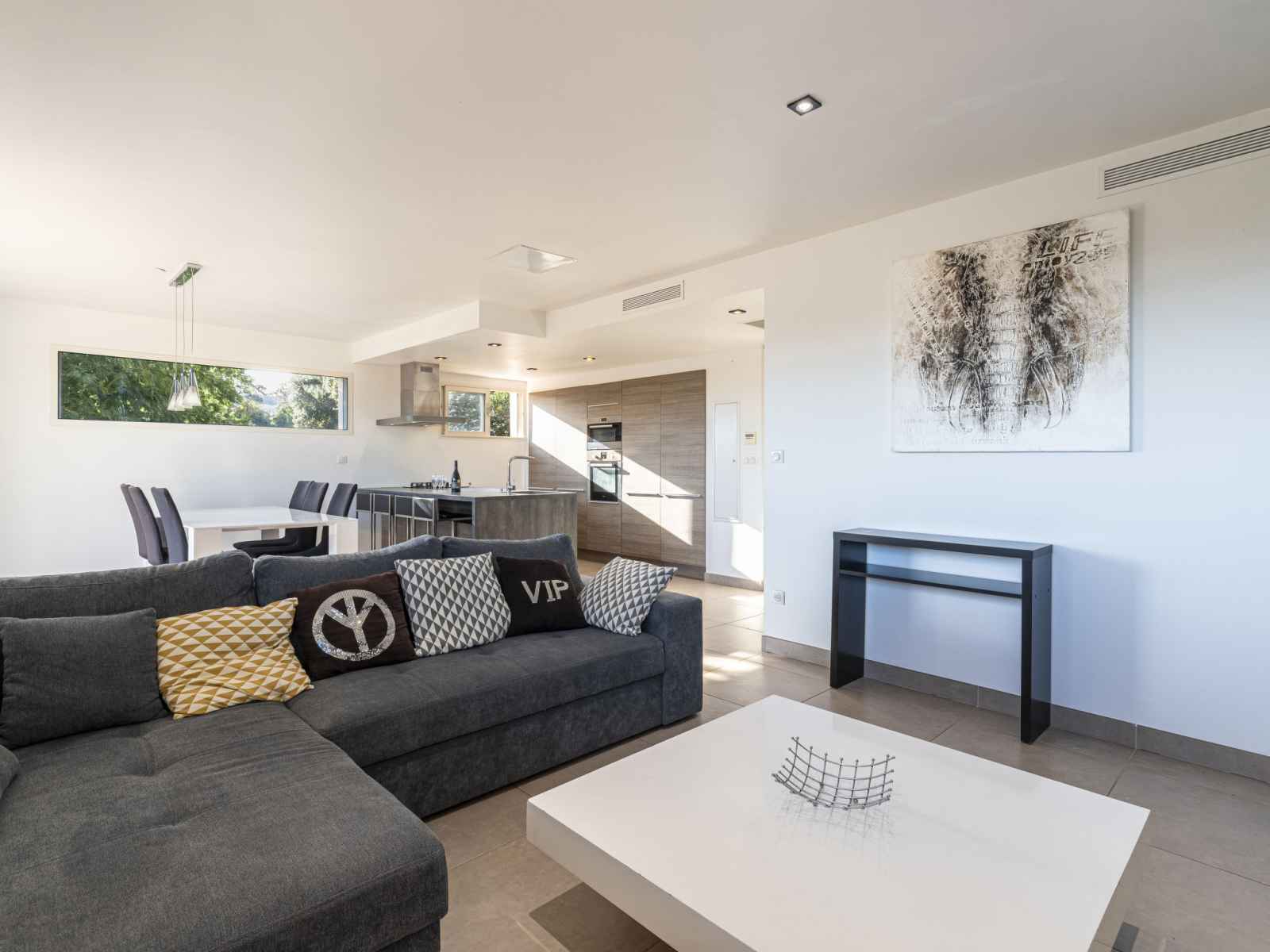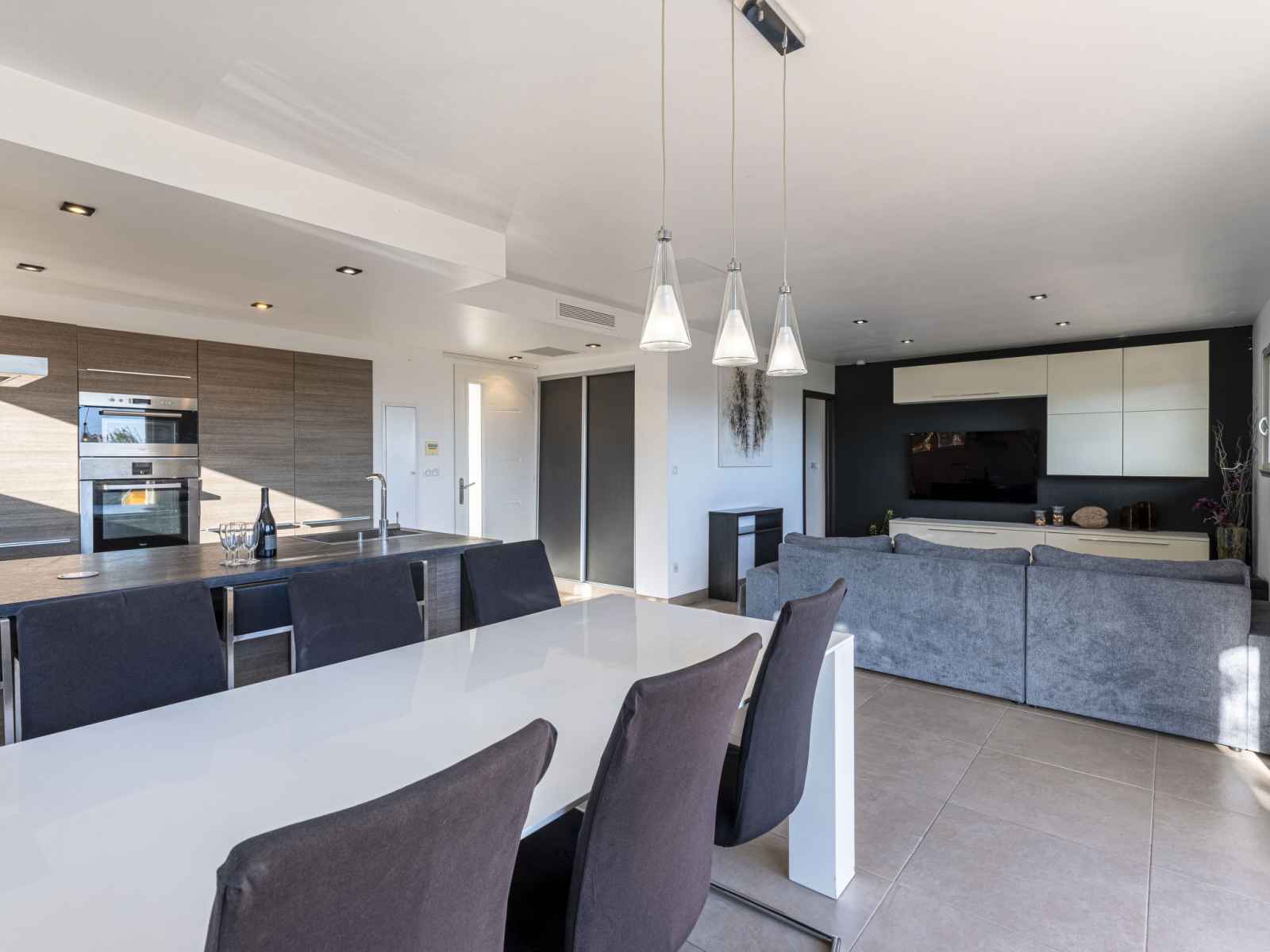 "casa caminu", maison jumelée 4 pièces 90 m2 sur 2 niveaux. aménagement moderne: séjour/salle à manger avec baie vitrée avec table pour les repas, wc séparés et tv (écran plat), volet roulant électrique. sortie sur la terrasse. cuisine ouverte (3 plaques de cuisson, four, lave-vaisselle, grille-pain, bouilloire électrique, micro-ondes,