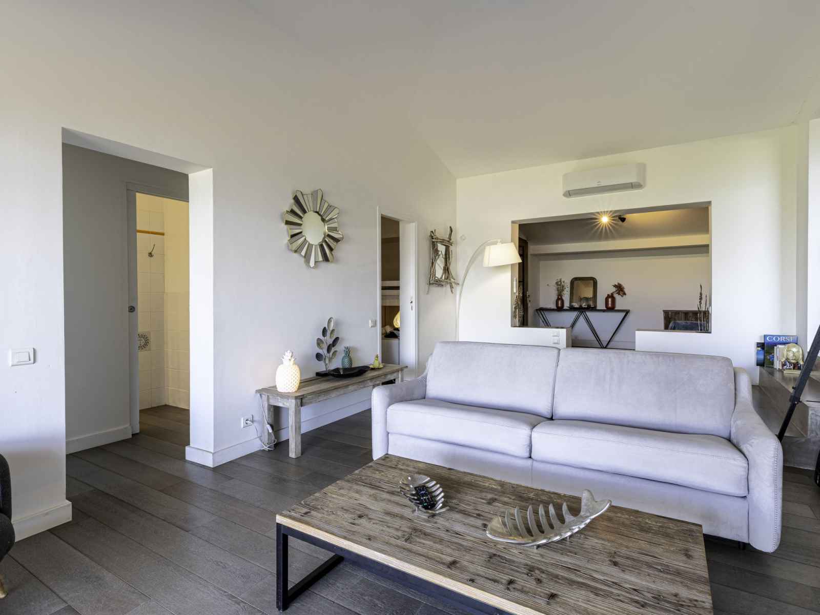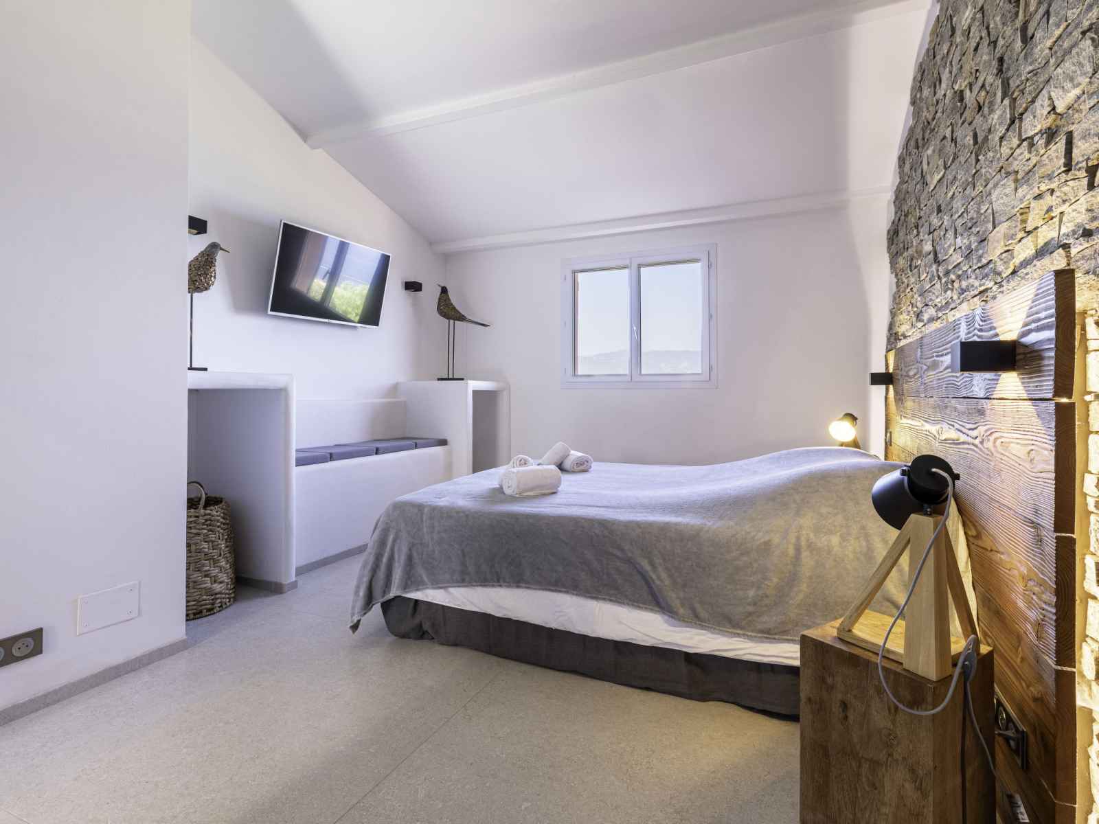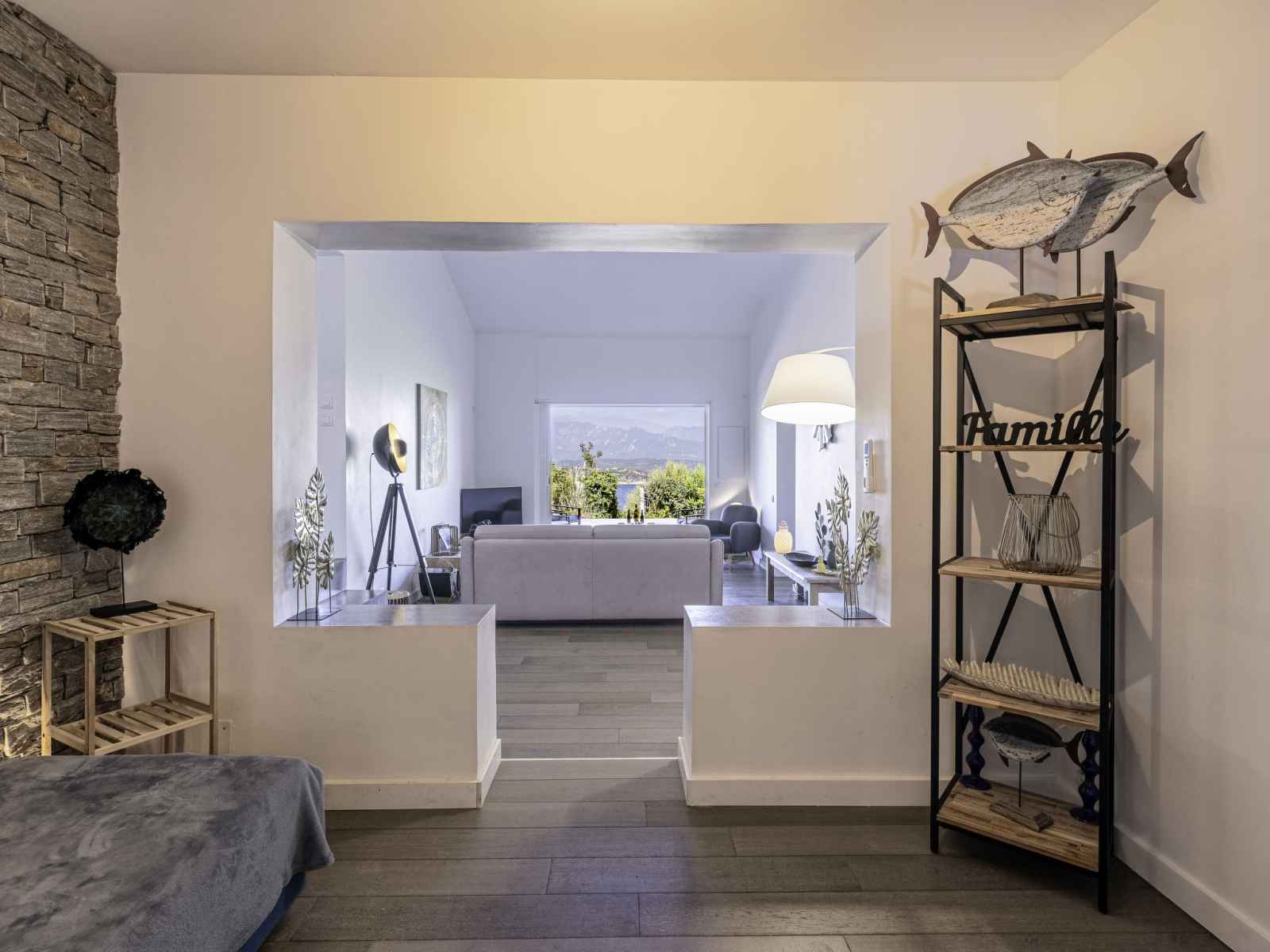 grille-pain, bouilloire électrique, micro-ondes, congélateur, cafetière électrique, ilot de cuisine) avec table pour les repas. Sortie sur la terrasse. Bain/WC. Chauffage électrique, air-conditionné. À l'étage inférieur: 1 chambre avec 1 grand-lit (160 cm, longueur 200 cm), bain/WC et TV (écran plat). Grande terrasse 50 m2, situation ouest. Meubles de terrasse, barbecue, chaises longues (2). Superbe, sur la mer et les montagnes. A disposition: lave-linge. Internet (Connexion WIFI, gratuit). Veuillez noter: logement non-fumeur. Détecteur de fumée. Annonce d'un particulier (art 155, IV du CGI). 2A2470030158C
