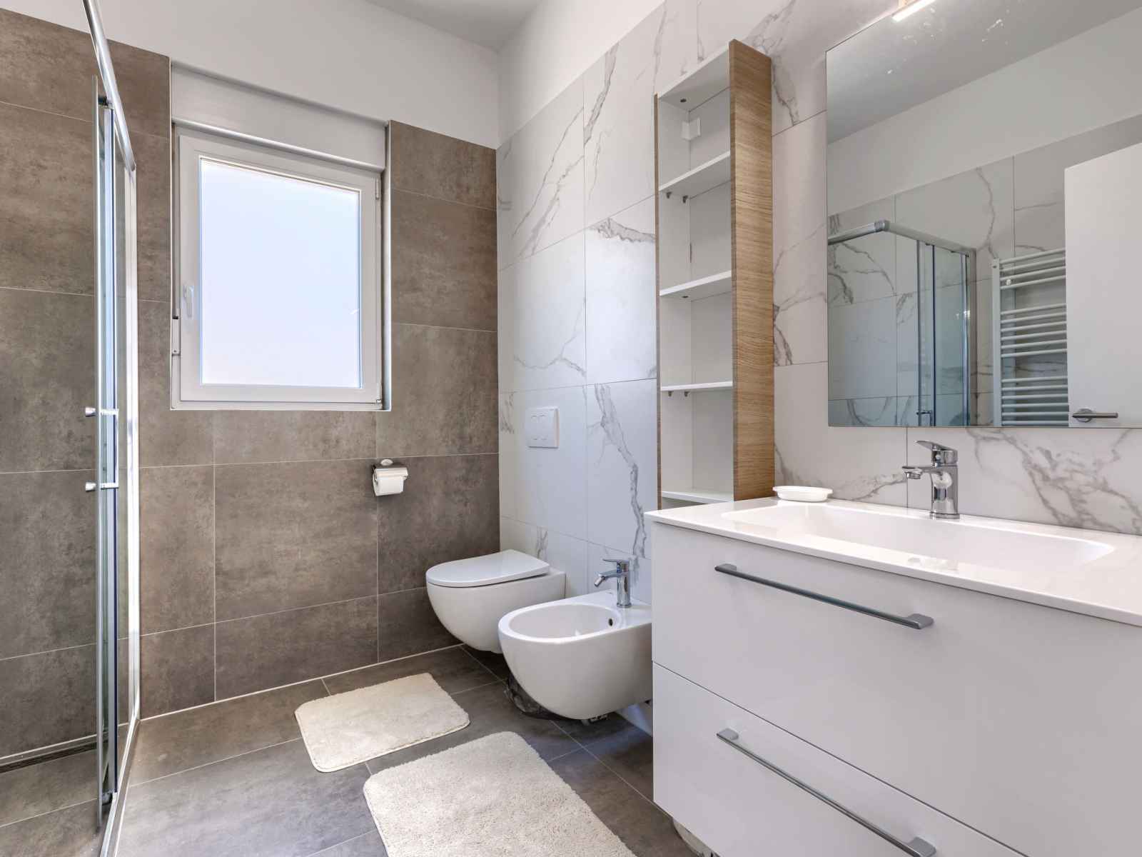 lave-vaisselle, 4 plaques vitrocéramiques, grille-pain, bouilloire électrique, micro-ondes, congélateur, cafetière électrique). WC séparé. À l'étage supérieur: 3 chambres, chaque chambre avec: 1 grand-lit (160 cm, longueur 200 cm), douche/WC et TV (satellite) (écran plat), air-conditionné. Terrasse 6 m2. Meubles de terrasse, chaises longues. Vue partielle sur la mer. A disposition: sèche-cheveux. Internet (Connexion WIFI, gratuit). Maximum 1 animal/ chien autorisé.