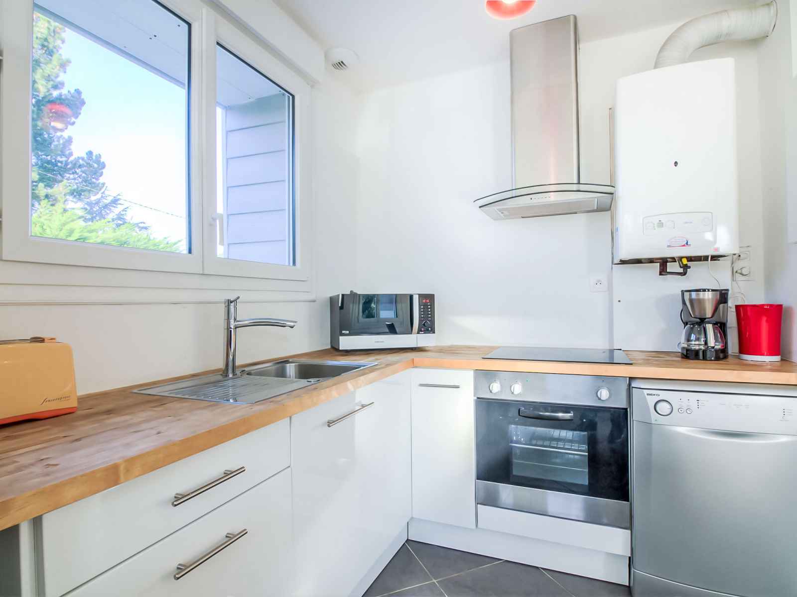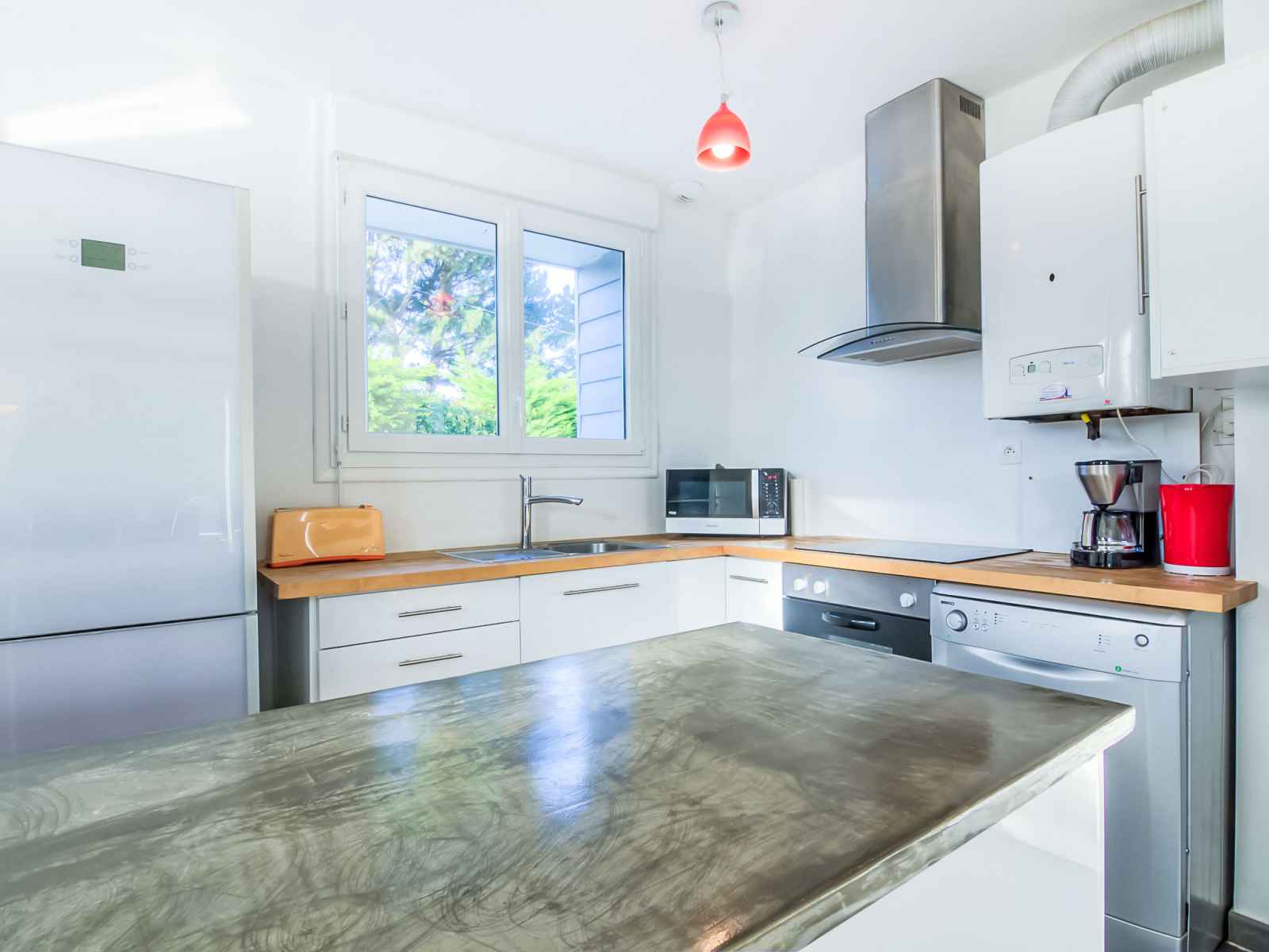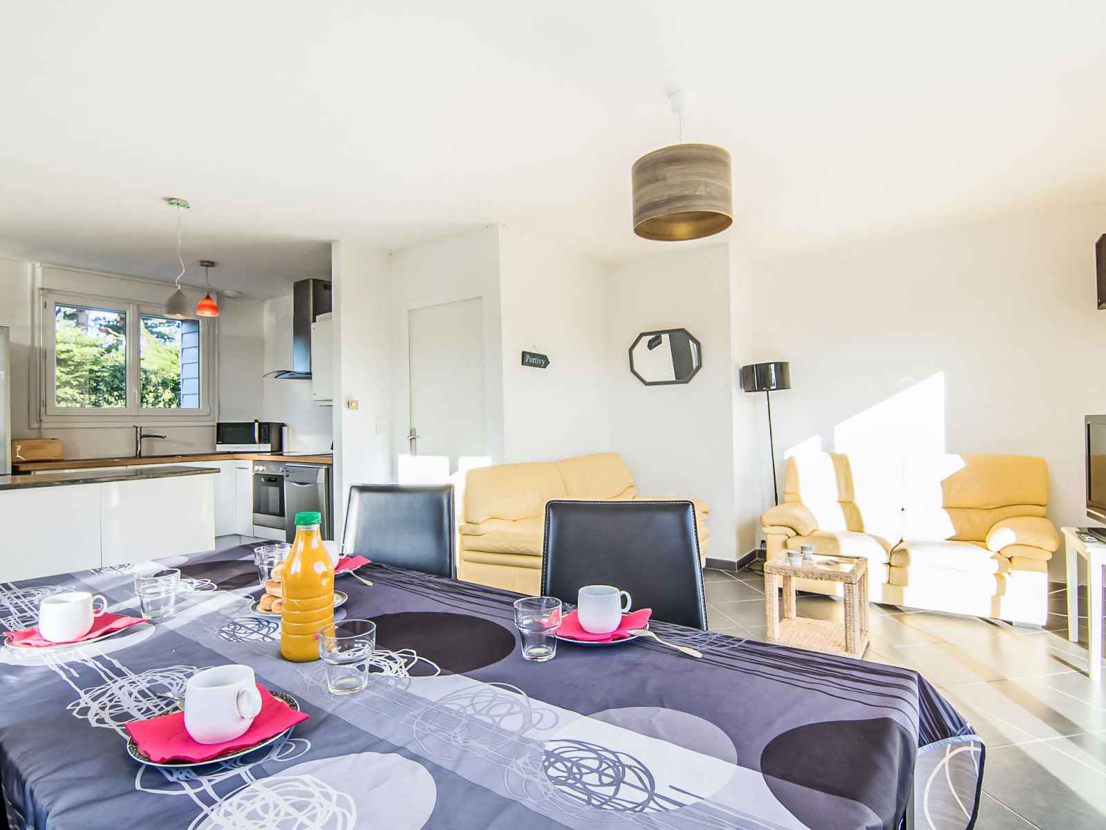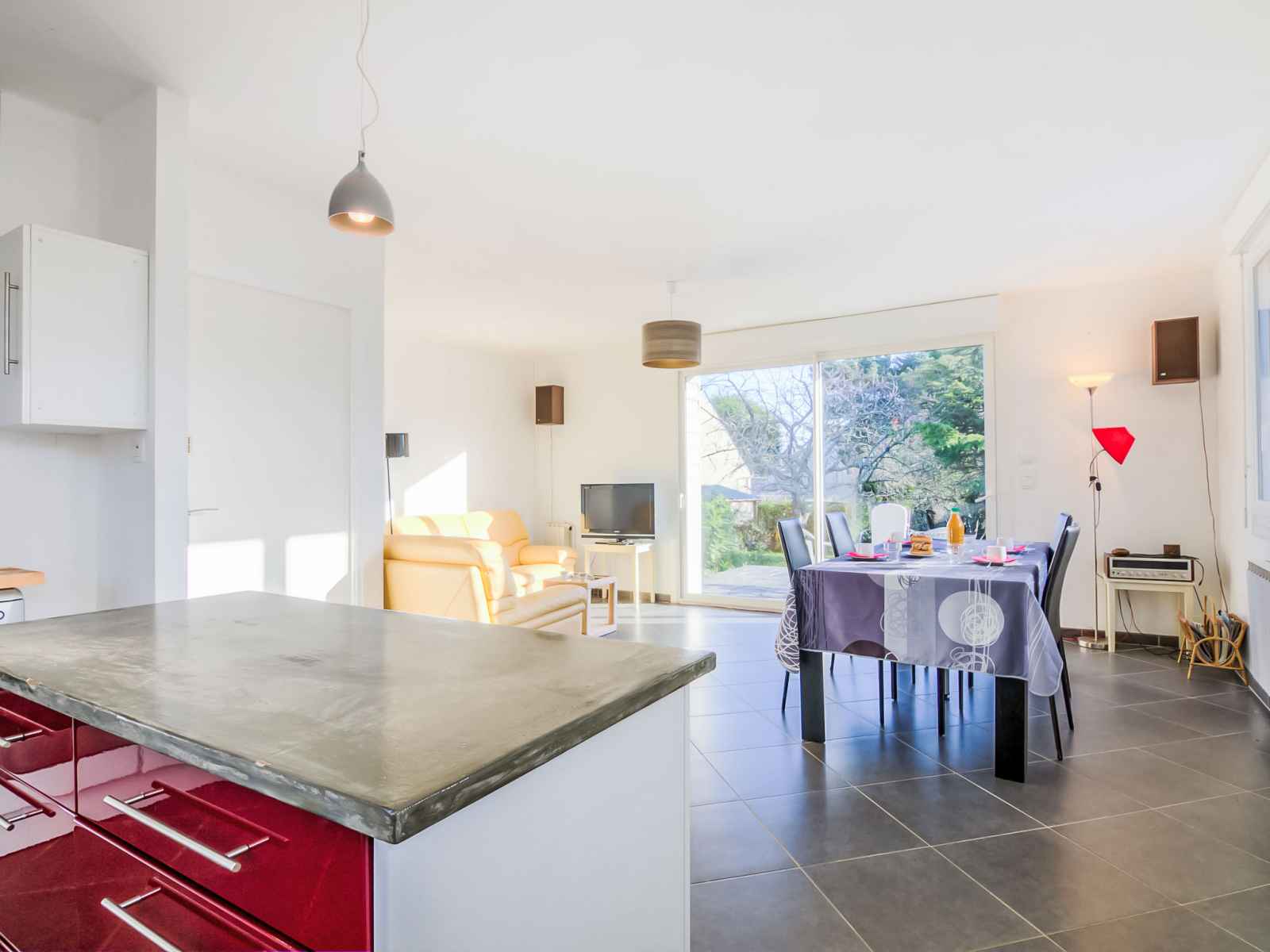 Maison 3 pièces 65 m2. aménagement agréable et moderne: séjour/salle à manger avec tv (écran plat). sortie sur la terrasse. 1 chambre avec 1 grand-lit (140 cm). 1 chambre avec 1 grand-lit (140 cm). cuisine ouverte (4 plaques de cuisson, four, lave-vaisselle, micro-ondes, congélateur, ilot de cuisine). douche, wc séparé. chauffage