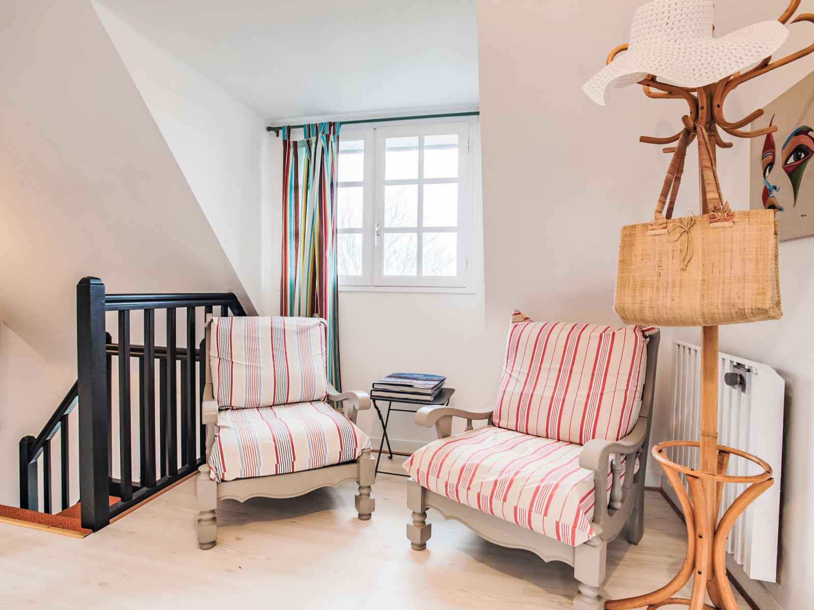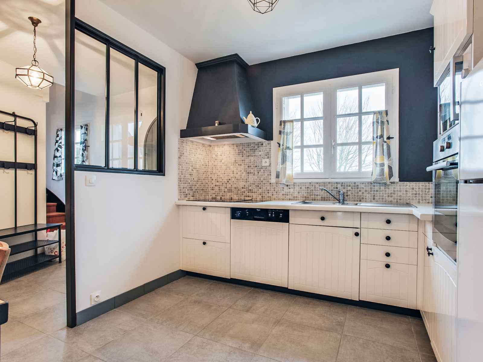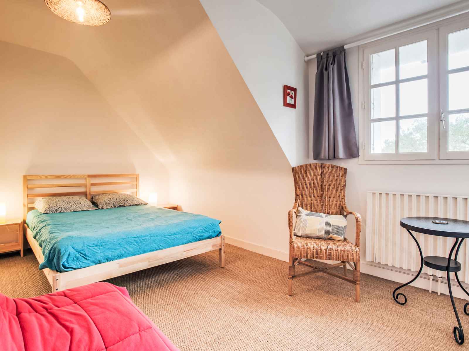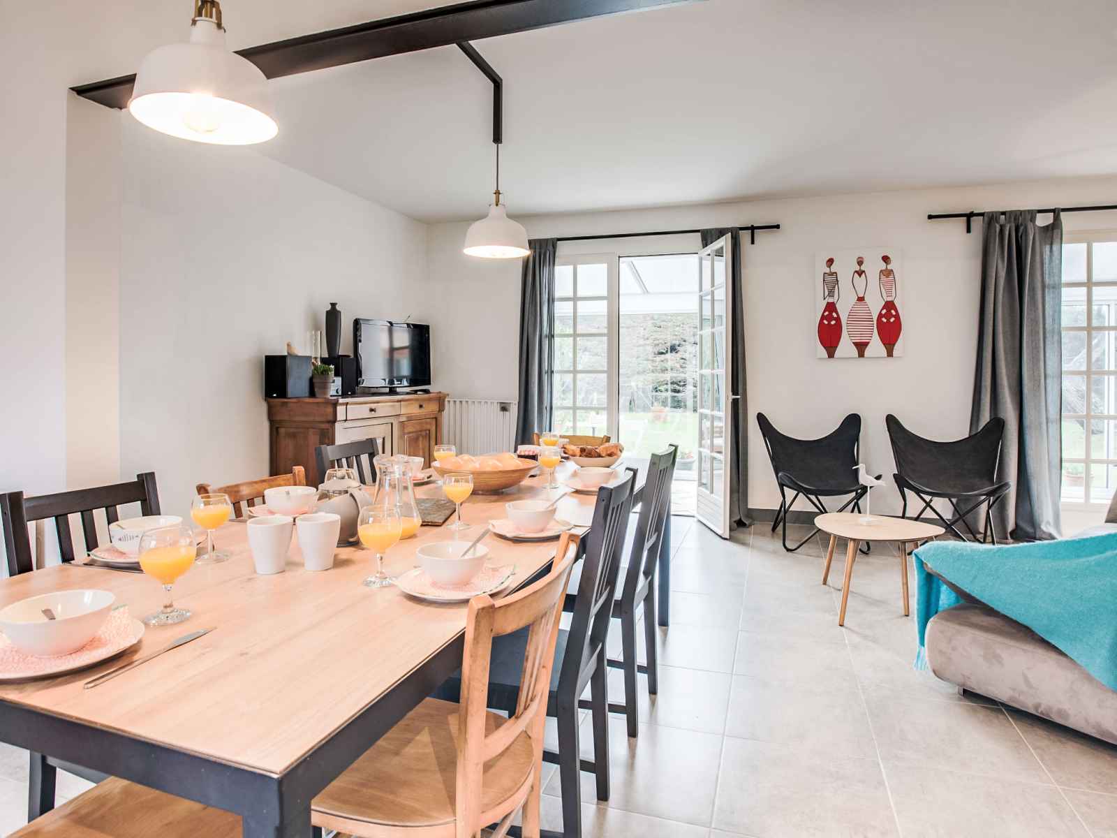 Maison 5 pièces 120 m2 sur 2 niveaux. rénovée en 2017, aménagement confortable: séjour/salle à manger avec tv (écran plat). sortie sur la véranda. 1 chambre avec 1 grand-lit (1 x 140 cm, longueur 190 cm), douche/wc. cuisine ouverte (four, lave-vaisselle, 4 plaques à induction, congélateur, cafetière électrique). À l'étage supérieur: